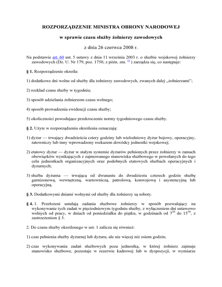 ROZPORZĄDZENIE MINISTRA OBRONY NARODOWEJ w sprawie czasu służby żołnierzy zawodowych z dnia 26 czerwca 2008 r. Na podstawie art. 60 ust. 5 ustawy z dnia 11 września 2003 r. o służbie wojskowej żołnierzy zawodowych (Dz. U. Nr 179, poz. 1750, z późn. zm. 1) ) zarządza się, co następuje: § 1. Rozporządzenie określa: 1) dodatkowe dni wolne od służby dla żołnierzy zawodowych, zwanych dalej „żołnierzami”; 2) rozkład czasu służby w tygodniu; 3) sposób udzielania żołnierzom czasu wolnego; 4) sposób prowadzenia ewidencji czasu służby; 5) okoliczności powodujące przekroczenie normy tygodniowego czasu służby. § 2. Użyte w rozporządzeniu określenia oznaczają: 1) dyżur — trwający dwadzieścia cztery godziny lub wielodniowy dyżur bojowy, operacyjny, ratowniczy lub inny wprowadzony rozkazem dowódcy jednostki wojskowej; 2) etatowy dyżur — dyżur w stałym systemie dyżurów pełnionych przez żołnierzy w ramach obowiązków wynikających z zajmowanego stanowiska służbowego w powołanych do tego celu jednostkach organizacyjnych oraz podobnych etatowych służbach operacyjnych i dyżurnych; 3) służba dyżurna — trwającą od dwunastu do dwudziestu czterech godzin służbę garnizonową, wewnętrzną, wartowniczą, patrolową, konwojową i asystencyjną lub operacyjną. § 3. Dodatkowymi dniami wolnymi od służby dla żołnierzy są soboty. § 4. 1. Przełożeni ustalają zadania służbowe żołnierzy w sposób pozwalający na wykonywanie tych zadań w pięciodniowym tygodniu służby, z wyłączeniem dni ustawowo wolnych od pracy, w dniach od poniedziałku do piątku, w godzinach od 730 do 1530, z zastrzeżeniem § 5. 2. Do czasu służby określonego w ust. 1 zalicza się również: 1) czas pełnienia służby dyżurnej lub dyżuru, ale nie więcej niż osiem godzin; 2) czas wykonywania zadań służbowych poza jednostką, w której żołnierz zajmuje stanowisko służbowe, pozostaje w rezerwie kadrowej lub w dyspozycji, w wymiarze przekraczającym normę określoną w ust. 1, w tym w ramach podróży służbowej, kursu, szkolenia lub kontroli. 3. W indywidualnie uzasadnionych przypadkach, w szczególności ze względu na dojazd do miejsca pełnienia zawodowej służby wojskowej lub sprawy rodzinne, dowódca jednostki wojskowej może, jeżeli nie koliduje to z wykonywaniem przez żołnierza obowiązków służbowych, ustalić dla niego inne niż określone w ust. 1 godziny służby. 4. Jeżeli występują uzasadnione potrzeby służbowe, dowódca jednostki wojskowej może, za zgodą bezpośredniego przełożonego, ustalić dla całego lub części stanu osobowego jednostki inne niż określone w ust. 1 godziny służby. 5. Czas służby żołnierzy zajmujących stanowiska służbowe uzależnione od posiadania kwalifikacji określonych w przepisach odrębnych ustaw może być ustalony z uwzględnieniem tych przepisów. § 5. Żołnierzowi wykonującemu zadania służbowe w warunkach szczególnie uciążliwych lub szczególnie szkodliwych dla zdrowia albo na stanowiskach, na których występują przekroczenia najwyższych dopuszczalnych stężeń czynników szkodliwych dla zdrowia, dowódca jednostki wojskowej ustala czas służby zgodnie z obowiązującymi przepisami o ochronie pracowników zatrudnionych w takich warunkach. § 6. 1. W uzasadnionych okolicznościach żołnierz może zostać zobowiązany do wykonywania zadań służbowych w czasie przekraczającym czas służby określony w § 4, jednakże wykonywanie zadań służbowych nie może łącznie przekroczyć normy określonej w art. 60 ust. 2 ustawy z dnia 11 września 2003 r. o służbie wojskowej żołnierzy zawodowych. 2. Ustalenie wykonywania zadań służbowych w czasie przekraczającym czas służby określony w § 4 może nastąpić w następujących okolicznościach: 1) konieczność podjęcia niezwłocznych działań służbowych na skutek zaistniałego wypadku lub innego nagłego zdarzenia; 2) otrzymanie dodatkowego zadania służbowego, którego wykonanie jest niemożliwe w czasie służby określonym w § 4 bez naruszenia terminu wykonania; 3) konieczność realizacji zadania służbowego w wydłużonym czasie wynikająca z charakteru zadania; 4) skierowanie w podróż służbową; 5) podjęcie niezwłocznych czynności kontrolnych. § 7. 1. Okres rozliczeniowy czasu służby, o którym mowa w § 6 ust. 1, biegnie od następnego dnia po dniu realizacji zadania. 2. W razie wykonywania zadania nieprzerwanie przez kilka dni okres rozliczeniowy czasu służby rozpoczyna się w dniu następnym po ostatnim dniu realizacji zadania. § 8. 1. Żołnierzowi, który na polecenie dowódcy jednostki wojskowej lub osoby upoważnionej przez tego dowódcę wykonywał zadania służbowe w wymiarze przekraczającym w danym tygodniu czas służby określony w § 4, udziela się czasu wolnego w tym samym wymiarze czasowym. 2. Udzielenie czasu wolnego, o którym mowa w ust. 1, powinno nastąpić w najbliższym tygodniu, nie później jednak niż w ciągu czteromiesięcznego okresu rozliczeniowego. 3. Żołnierzowi, który w czteromiesięcznym okresie rozliczeniowym z uzasadnionych względów służbowych lub osobistych nie wykorzystał przysługującego mu czasu wolnego w wymiarze, o którym mowa w ust. 1, udziela się czasu wolnego w tym samym wymiarze nie później niż w następnym okresie rozliczeniowym. § 9. 1. Żołnierza wyznaczonego do pełnienia służby dyżurnej lub dyżuru trwającego co najmniej dwadzieścia cztery godziny zwalnia się z wykonywania innych zadań służbowych w dniu rozpoczęcia i zakończenia tej służby lub dyżuru. 2. Żołnierzowi, który pełnił służbę dyżurną lub dyżur w dniu ustawowo lub dodatkowo wolnym od służby, w wymiarze co najmniej ośmiu godzin, udziela się za ten dzień czasu wolnego w wymiarze jednego dnia. 3. Żołnierzowi, który pełnił służbę dyżurną lub dyżur w dniu ustawowo lub dodatkowo wolnym od służby, w wymiarze mni