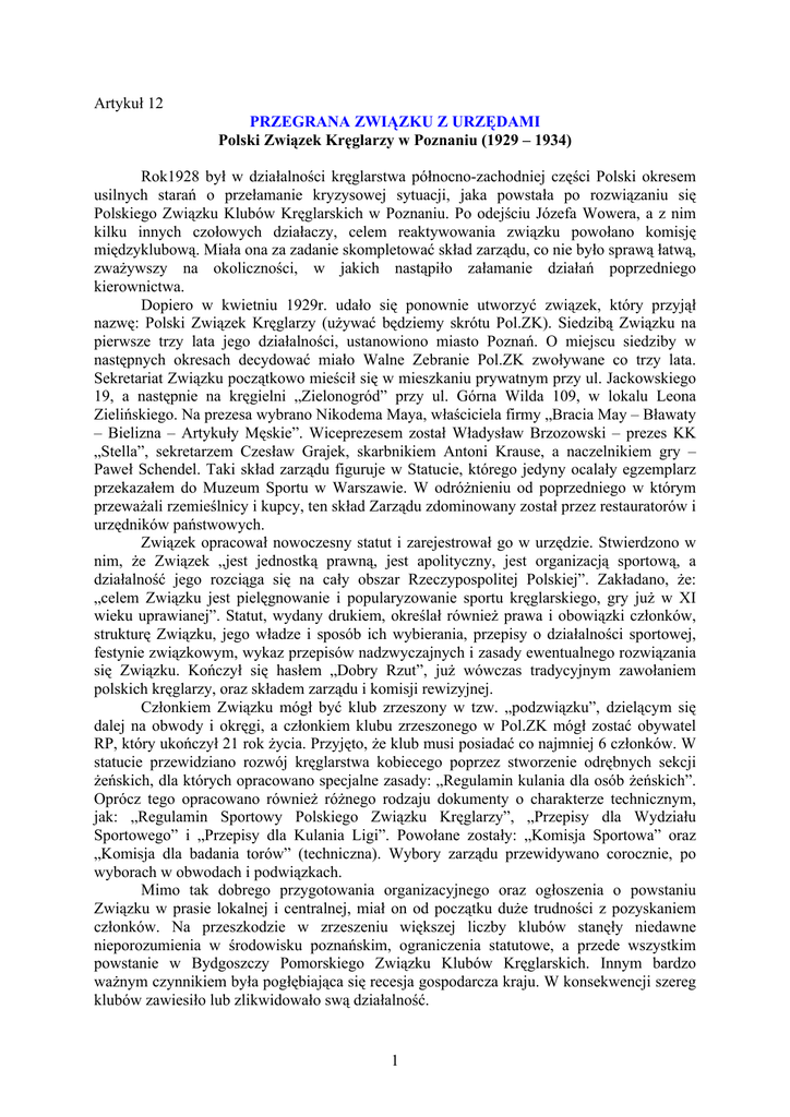 Artykuł 12 PRZEGRANA ZWIĄZKU Z URZĘDAMI Polski Związek Kręglarzy w Poznaniu (1929 – 1934) Rok1928 był w działalności kręglarstwa północno-zachodniej części Polski okresem usilnych starań o przełamanie kryzysowej sytuacji, jaka powstała po rozwiązaniu się Polskiego Związku Klubów Kręglarskich w Poznaniu. Po odejściu Józefa Wowera, a z nim kilku innych czołowych działaczy, celem reaktywowania związku powołano komisję międzyklubową. Miała ona za zadanie skompletować skład zarządu, co nie było sprawą łatwą, zważywszy na okoliczności, w jakich nastąpiło załamanie działań poprzedniego kierownictwa. Dopiero w kwietniu 1929r. udało się ponownie utworzyć związek, który przyjął nazwę: Polski Związek Kręglarzy (używać będziemy skrótu Pol.ZK). Siedzibą Związku na pierwsze trzy lata jego działalności, ustanowiono miasto Poznań. O miejscu siedziby w następnych okresach decydować miało Walne Zebranie Pol.ZK zwoływane co trzy lata. Sekretariat Związku początkowo mieścił się w mieszkaniu prywatnym przy ul. Jackowskiego 19, a następnie na kręgielni „Zielonogród” przy ul. Górna Wilda 109, w lokalu Leona Zielińskiego. Na prezesa wybrano Nikodema Maya, właściciela firmy „Bracia May – Bławaty – Bielizna – Artykuły Męskie”. Wiceprezesem został Władysław Brzozowski – prezes KK „Stella”, sekretarzem Czesław Grajek, skarbnikiem Antoni Krause, a naczelnikiem gry – Paweł Schendel. Taki skład zarządu figuruje w Statucie, którego jedyny ocalały egzemplarz przekazałem do Muzeum Sportu w Warszawie. W odróżnieniu od poprzedniego w którym przeważali rzemieślnicy i kupcy, ten skład Zarządu zdominowany został przez restauratorów i urzędników państwowych. Związek opracował nowoczesny statut i zarejestrował go w urzędzie. Stwierdzono w nim, że Związek „jest jednostką prawną, jest apolityczny, jest organizacją sportową, a działalność jego rozciąga się na cały obszar Rzeczypospolitej Polskiej”. Zakładano, że: „celem Związku jest pielęgnowanie i popularyzowanie sportu kręglarskiego, gry już w XI wieku uprawianej”. Statut, wydany drukiem, określał również prawa i obowiązki członków, strukturę Związku, jego władze i sposób ich wybierania, przepisy o działalności sportowej, festynie związkowym, wykaz przepisów nadzwyczajnych i zasady ewentualnego rozwiązania się Związku. Kończył się hasłem „Dobry Rzut”, już wówczas tradycyjnym zawołaniem polskich kręglarzy, oraz składem zarządu i komisji rewizyjnej. Członkiem Związku mógł być klub zrzeszony w tzw. „podzwiązku”, dzielącym się dalej na obwody i okręgi, a członkiem klubu zrzeszonego w Pol.ZK mógł zostać obywatel RP, który ukończył 21 rok życia. Przyjęto, że klub musi posiadać co najmniej 6 członków. W statucie przewidziano rozwój kręglarstwa kobiecego poprzez stworzenie odrębnych sekcji żeńskich, dla których opracowano specjalne zasady: „Regulamin kulania dla osób żeńskich”. Oprócz tego opracowano również różnego rodzaju dokumenty o charakterze technicznym, jak: „Regulamin Sportowy Polskiego Związku Kręglarzy”, „Przepisy dla Wydziału Sportowego” i „Przepisy dla Kulania Ligi”. Powołane zostały: „Komisja Sportowa” oraz „Komisja dla badania torów” (techniczna). Wybory zarządu przewidywano corocznie, po wyborach w obwodach i podwiązkach. Mimo tak dobrego przygotowania organizacyjnego oraz ogłoszenia o powstaniu Związku w prasie lokalnej i centralnej, miał on od początku duże trudności z pozyskaniem członków. Na przeszkodzie w zrzeszeniu większej liczby klubów stanęły niedawne nieporozumienia w środowisku poznańskim, ograniczenia statutowe, a przede wszystkim powstanie w Bydgoszczy Pomorskiego Związku Klubów Kręglarskich. Innym bardzo ważnym czynnikiem była pogłębiająca się recesja gospodarcza kraju. W konsekwencji szereg klubów zawiesiło lub zlikwidowało swą działalność. 1 Działacze Pol.ZK czynili wiele, aby zasięg wpływów Związku rozszerzyć na Pomorze i Kujawy poprzez ogłoszenia w prasie, inicjowanie kontaktów międzyokręgowych i międzyklubowych, czy włączanie do władz związkowych działaczy z tych terenów. Przykładowo, członek klubu kręglarskiego w Brodnicy wybrany został w skład Zarządu Pol.ZK, a prywatny jego adres służył jako miejsce zgłoszeń do Związku. Niestety, z podanych wyżej powodów, skutek tych zabiegów był mierny. Pomimo szczytnych celów, jakie przyświecały powołaniu związku bydgoskiego, fakt ten rozbił młody ruch kręglarski i uniemożliwił ponowne zrzeszenie się wszystkich klubów. Nie powiodły się też próby podporządkowania sobie związku w Bydgoszczy przez Polski Związek Kręglarzy w Poznaniu. Pomimo dostosowania statutu do istniejącego stanu rzeczy, Związkowi nie udało się nigdy skupić więcej niż dwanaście klubów. Były to: KK „Firet”, KK „Jedność”, KK „Mars”, KK „Patria”, KK „Polonia”, KK „Rzut Oka”, KK „Stella” – wszystkie z Poznania oraz KK „Dobry Rzut” z Kościana i KS „Pogoń” Środa Wlkp. Łącznie Pol.ZK zrzeszał w tych klubach zaledwie 115 zawodników. Kluby „Rzut Oka” i „Dobry Rzut” przystąpiły do Związku nieco później, bo dopiero w 1932r., co mogłoby też świadczyć o pewnym braku zaufania w początkowym okresie do nowego Związku. W trakcie działalności Związku, na skutek trudności finansowych ubył z jego składu KK „Firet”. W kwietniu 1930r. wybrany został nowy Zarząd, na czele którego stanął urodzony w 1910r. Franciszek Klause. Był członkiem KK „Pogoń”, urzędnikiem, a po wojnie od 26.03.1945r.radnym Miejskiej Rady Narodowej z ramienia Stronnictwa Demokratycznego. W dniu 11.11.1946r. powołano go na stanowisko wiceprezydenta Poznania z której funkcji zrezygnował 02.01.1950r. Zmarł w 1958r. w Poznaniu. Funkcję prezesa Pol.Z.K. pełnił d
