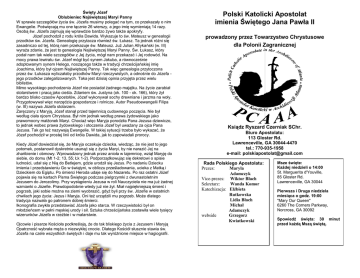 Święty Józef Oblubieniec Najświętszej Maryi Panny W sprawie szczegółów życia św. Józefa musimy polegać na tym, co przekazały o nim Ewangelie. Poświęcają mu one łącznie 26 wierszy, a jego imię wymieniają 14 razy. Osobą św. Józefa zajmują się wprawdzie bardzo żywo także apokryfy. Józef pochodził z rodu króla Dawida. Wykazuje to św. Mateusz w genealogii przodków św. Józefa. Genealogię przytacza również św. Łukasz. Ta jednak różni się zasadniczo od tej, którą nam przekazuje św. Mateusz. Już Julian Afrykański (w. III) wyraża zdanie, że jest to genealogia Najświętszej Maryi Panny. Św. Łukasz, który podał nam tak wiele szczegółów z Jej życia, mógł nam przekazać i Jej rodowód. Na mocy prawa lewiratu św. Józef mógł być synem Jakuba, a równocześnie adoptowanym synem Helego, noszącego także w tradycji chrześcijańskiej imię Joachima, który był ojcem Najświętszej Panny. Tak więc genealogia przytoczona przez św. Łukasza wyliczałaby przodków Maryi rzeczywistych, a odnośnie do Józefa jego przodków zalegalizowanych. Taka jest dzisiaj opinia przyjęta przez wielu biblistów. Mimo wysokiego pochodzenia Józef nie posiadał żadnego majątku. Na życie zarabiał stolarstwem i pracą jako cieśla. Zdaniem św. Justyna (ok. 100 - ok. 166), który żył bardzo blisko czasów Apostołów, Józef wykonywał sochy drewniane i jarzma na woły. Przygotowywał więc narzędzia gospodarcze i rolnicze. Autor Pseudoewangelii Filipa (w. III) nazywa Józefa stolarzem. Zaręczony z Maryją, Józef stanął przed tajemnicą cudownego poczęcia. Nie był według ciała ojcem Chrystusa. Był nim jednak według prawa żydowskiego jako prawomocny małżonek Maryi. Chociaż więc Maryja porodziła Pana Jezusa dziewiczo, to jednak wobec prawa żydowskiego i otoczenia Józef był uważany za ojca Pana Jezusa. Tak go też nazywają Ewangelie. W takiej sytuacji trzeba było wykazać, że Józef pochodził w prostej linii od króla Dawida, jak to zapowiadali prorocy. Kiedy Józef dowiedział się, że Maryja oczekuje dziecka, wiedząc, że nie jest to jego potomek, postanowił dyskretnie usunąć się z życia Maryi, by nie narazić Jej na zhańbienie i obmowy. Wprowadzony jednak przez anioła w tajemnicę, wziął Maryję do siebie, do domu (Mt 1-2; 13, 55; Łk 1-2). Podporządkowując się dekretowi o spisie ludności, udał się z Nią do Betlejem, gdzie urodził się Jezus. Po nadaniu Dziecku imienia i przedstawieniu Go w świątyni, w obliczu prześladowania, ucieka z Matką i Dzieckiem do Egiptu. Po śmierci Heroda udaje się do Nazaretu. Po raz ostatni Józef pojawia się na kartach Pisma Świętego podczas pielgrzymki z dwunastoletnim Jezusem do Jerozolimy. Przy wystąpieniu Jezusa w roli Nauczyciela nie ma już żadnej wzmianki o Józefie. Prawdopodobnie wtedy już nie żył. Miał najpiękniejszą śmierć i pogrzeb, jaki sobie można na ziemi wyobrazić, gdyż byli przy św. Józefie w ostatnich chwilach jego życia: Jezus i Maryja. Oni też urządzili mu pogrzeb. Może dlatego tradycja nazwała go patronem dobrej śmierci. Ikonografia zwykła przedstawiać Józefa jako starca. W rzeczywistości był on młodzieńcem w pełni męskiej urody i sił. Sztuka chrześcijańska zostawiła wiele tysięcy wizerunków Józefa w rzeźbie i w malarstwie. Ojcowie i pisarze Kościoła podkreślają, że do tak bliskiego życia z Jezusem i Maryją Opatrzność wybrała męża o niezwykłej cnocie. Dlatego Kościół słusznie stawia św. Józefa na czele wszystkich świętych i daje mu tak wyróżnione miejsce w hagiografii. Polski Katolicki Apostolat imienia Świętego Jana Pawła II prowadzony przez Towarzystwo Chrystusowe dla Polonii Zagranicznej Ksiądz Ryszard Czerniak SChr. Biuro Apostolatu: 113 Gloster Rd. Lawrenceville, GA 30044-4470 tel.: 770-935-1958 e-mail: [email protected] Rada Polskiego Apostolatu: Prezes: Maryla Adamczyk Vice-prezes: Wiktor Błach Sekretarz: Wanda Komor Katechizacja: Elżbieta Rutkowska Lidia Błach Michał Adamczyk webside Grzegorz Kwiatkowski Msze święte: Każdej niedzieli o 14:00 St. Marguerita d'Youville, 85 Gloster Rd. Lawrenceville, GA 30044 Pierwsza i Druga niedziela miesiąca o godz. 19:00 "Mary Our Queen" 6260 The Corners Parkway, Norcross, GA 30092 Spowiedź święta: 30 minut przed każdą Mszą świętą. Biuletyn: 15 marca 2015 IV NIEDZIELA WIELKIEGO POSTU B - LÆTARE Tak Bóg umiłował świat, że dał swojego Syna Jednorodzonego; każdy, kto w Niego wierzy, ma życie wieczne. Sakramentu w kaplicy wieczysej adoracji. W kaplicy znajdują się relikwie św. Jana Pawła II, patrona naszego Apostolatu. Przed obliczem Chrystusa ukrytego w Najświętszym Sakramencie za wstawiennictwem św. Jana Pawła II proszę o modlitwę w intencji naszej wspólnoty, naszego Apostolatu. 5. Spotkanie z młodzieżą (która już przyjęła Sakrament Bierzmowania) w niedzielę 15 marca po Mszy Świętej. 6. Dziękuję serdecznie księdzu Mirosławowi Stępień, za poprowadzenie Rekolekcji Wielkopostnych. ****************************************************************************************************************** Intencje Mszalne Niedziela, 15 marca 2015 Md'Y - 2:00pm + Maria Magdalena Marciniak + Barbara Sołdańska ++ Janina i Aleksander Rzędzian Czwartek, 19 marca 2015 - Uroczystość Świętego Józefa. Md'Y - 8:00pm + Zygmunt Komor i +Jóżef Komor. Niedziela, 22 marca 2015 Md'Y - 2:00pm * Dziękczyna za dobre wyniki zdrowia, z prośbą o opiekę Matki Bożej Częstochowskiej. Niedziela, 29 marca 2015 Md'Y - 2:00pm + Z okazji urodzin za świętej pamięci Zosię Nowina Konopka. Niedziela, 5 kwietnia 2015 Md'Y - 2:00pm + Jan Zajkowski i zmarłych z rodziny Zajkowski. Niedziela, 12 kwietnia 2015 Md'Y - 2:00pm + Edward Kurzępa w rocznicę śmierci. OGŁOSZENIA 1. W każdy piątek zapraszam na Nabożeństwo Drogi Krzyżowej o 8:00pm i Mszę Świętą. 2. Nabożeństwo Gorzkich Żali w każdą niedielę o 1:40pm. 3. Ur