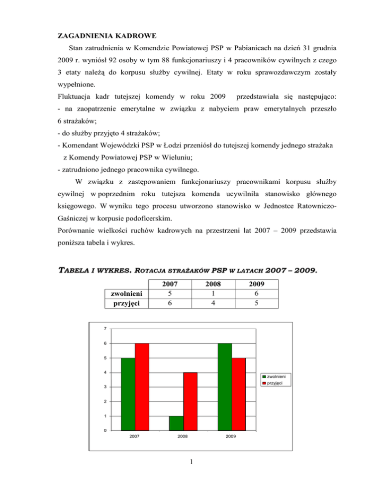 ZAGADNIENIA KADROWE Stan zatrudnienia w Komendzie Powiatowej PSP w Pabianicach na dzień 31 grudnia 2009 r. wyniósł 92 osoby w tym 88 funkcjonariuszy i 4 pracowników cywilnych z czego 3 etaty naleŜą do korpusu słuŜby cywilnej. Etaty w roku sprawozdawczym zostały wypełnione. Fluktuacja kadr tutejszej komendy w roku 2009 przedstawiała się następująco: - na zaopatrzenie emerytalne w związku z nabyciem praw emerytalnych przeszło 6 straŜaków; - do słuŜby przyjęto 4 straŜaków; - Komendant Wojewódzki PSP w Łodzi przeniósł do tutejszej komendy jednego straŜaka z Komendy Powiatowej PSP w Wieluniu; - zatrudniono jednego pracownika cywilnego. W związku z zastępowaniem funkcjonariuszy pracownikami korpusu słuŜby cywilnej w poprzednim roku tutejsza komenda ucywilniła stanowisko głównego księgowego. W wyniku tego procesu utworzono stanowisko w Jednostce RatowniczoGaśniczej w korpusie podoficerskim. Porównanie wielkości ruchów kadrowych na przestrzeni lat 2007 – 2009 przedstawia poniŜsza tabela i wykres. TABELA I WYKRES. ROTACJA STRAśAKÓW PSP W LATACH 2007 – 2009. zwolnieni przyjęci 2007 5 6 2008 1 4 2009 6 5 7 6 5 4 zwolnieni przyjęci 3 2 1 0 2007 2008 2009 1 PoniŜsza tabela i wykres przedstawiają strukturę zatrudnienia straŜaków tutejszej komendy wg wysługi lat słuŜby na przestrzeni 2008 r. i 2009 r. : TABELA I WYKRES. STRUKTURA ZATRUDNIENIA FUNKCJONARIUSZY PSP WG WYSŁUGI LAT SŁUśBY STAN NA 31.12.2009 R. Liczba zatrudnionych Wysługa lat w następujących latach słuŜby 2009 2008 29 0-5 25 10 6 - 10 14 11 11 - 15 12 13 16 - 20 17 21 21 - 25 16 3 26 - 30 3 1 31 - 35 1 0 pow. 35 0 88 RAZEM 88 35 30 25 20 2008 2009 15 10 5 0 0-5 6-10 11-15 16 - 20 21 - 25 26 - 30 31 - 35 2 pow. 35 Okres sprawozdawczy charakteryzował się znaczna ilością przeprowadzonych szkoleń doskonalających koordynowanych przez Komendę Wojewódzką PSP w Łodzi. W połowie 2009 r. straŜacy oraz pracownicy cywilni tutejszej komendy przystąpili do uczestnictwa w szkoleniu, z zakresu języka angielskiego w ramach Projektu „Wykształcony i kompetentny ratownik Państwowej StraŜy PoŜarnej”, którego zakończenie przewidywane jest na okres wiosenny bieŜącego roku. Program współfinansowany jest przez Unię Europejską ze środków Europejskiego Funduszu Społecznego oraz budŜetu państwa. Realizacji szkolenia podjęła się szkoła języków obcych British Centre z siedzibą w Łodzi. MoŜliwość nauki języka angielskiego okazała się doskonałym pomysłem w związku z czym cieszyła się duŜym zainteresowaniem wśród pracowników tutejszej komendy. W wyniku rekrutacji wyłoniono 30 osób zakwalifikowanych do udziału w projekcie. Warto nadmienić, Ŝe szkolenie odbywa się w siedzibie komendy i jest całkowicie nieodpłatne. Kolejnymi projektami zrealizowanymi w ramach Europejskiego Funduszu Społecznego zrealizowanymi przez Zakład Doskonalenia Zawodowego w Łodzi oraz Ośrodek Szkolenia KW PSP w Łodzi z siedzibą w Sieradzu były: • „Szkolenie specjalistyczne kierowców-operatorów samochodów z drabiną mechaniczną”, w wyniku którego zostało przeszkolonych 5 straŜaków; oraz • „Kurs obsługi podnośników poŜarniczych (podestów ruchomych samojezdnych kategorii IP) dla straŜaków PSP”. Zajęcia teoretyczne oraz część zajęć praktycznych odbyły się w siedzibie tutejszej komendy. Przeszkolonych zostało 8 straŜaków. Ciekawym wydarzeniem dotyczącym wymiany doświadczeń z zakresu prewencji, było przeprowadzenie projektu „Skuteczna prewencja – wymiana kadry KW PSP w Łodzi i Shropshire Fire & Rescue Sernice”, zrealizowanego w ramach Programu „Uczenie się przez całe Ŝycie – Leonardo da Vinci”. W projekcie tym uczestniczyło 4 funkcjonariuszy wybranych spośród straŜaków PSP podległych Komendantowi Wojewódzkiemu PSP w Łodzi. W wydarzeniu wziął udział m.in. funkcjonariusz tutejszej komendy a mianowicie mł. bryg. Andrzej Bohdanowicz, Kierownik Sekcji Kontrolno-Rozpoznawczej. Celem przedsięwzięcia była poprawa kompetencji kulturowych i językowych jego uczestników. Wymiana polegała na jednotygodniowym wyjeździe straŜaków do hrabstwa Shropshire w Wielkiej Brytanii oraz zapoznaniu się z tamtejsza specyfiką pracy. W minionym roku straŜacy uczestniczyli równieŜ w kursach podnoszących kwalifikacje zawodowe, realizowanych przez Ośrodek Szkolenia KW PSP w Łodzi z siedzibą w Sieradzu a takŜe szkoły poŜarnicze. 3 Szkolenie podstawowe straŜaka ochrony przeciwpoŜarowej ukończyło dwóch funkcjonariuszy, przy tym koszt jednego miejsca na kursie pokrył Powiatowy Urząd Pracy w Pabianicach. Szkolenie uzupełniające straŜaka ochrony przeciwpoŜarowej ukończyło 4 funkcjonariuszy dzięki czemu awansowali na wyŜsze stopnie oraz stanowiska słuŜbowe. Dwuletnie Studium Przemienne Aspirantów w Centralnej Szkole PSP w Częstochowie w systemie zaocznym, ukończyło dwóch straŜaków co równieŜ skutkowało awansowaniem w stopniu a takŜe na wyŜsze stanowiska słuŜbowe. Obecnie do ww. szkoły uczęszczają dwie osoby, jedna z nich podjęła naukę w roku sprawozdawczym. PoniŜsza tabela i wykres przedstawiają poziom wykształcenia ogólnego straŜaków tutejszej komendy: TABELA I WYKRES. STRUKTURA ZATRUDNIENIA FUNKCJONARIUSZY PSP WG POZIOMU WYKSZTAŁCENIA STAN NA 31.12.2008 R. Poziom wykształcenia Zatrudnienie wyŜsze 21 licencjackie 1 policealne średnie zasadnicze podstawowe RAZEM 17 45 4 0 88 Zatrudnienie zasadnicze wyŜsze licencjackie średnie policealne 4 Komendant Powiatowy jako członek Komisji Bezpieczeństwa Porządku Starostwa Powiatowego uczestniczył w 4 posiedzeniach komisji. 5