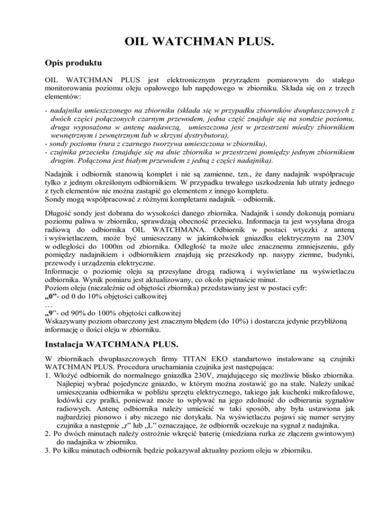OIL WATCHMAN PLUS. Opis produktu OIL WATCHMAN PLUS jest elektronicznym przyrz dem pomiarowym do sta ego monitorowania poziomu oleju opa owego lub nap dowego w zbiorniku. Sk ada si on z trzech elementów: - nadajnika umieszczonego na zbiorniku (sk ada si w przypadku zbiorników dwup aszczowych z dwóch cz ci po czonych czarnym przewodem, jedna cz znajduje si na sondzie poziomu, druga wyposa ona w anten nadawcz , umieszczona jest w przestrzeni miedzy zbiornikiem wewn trznym i zewn trznym lub w skrzyni dystrybutora), - sondy poziomu (rura z czarnego tworzywa umieszczona w zbiorniku), - czujnika przecieku (znajduje si na dnie zbiornika w przestrzeni pomi dzy jednym zbiornikiem drugim. Po czona jest bia ym przewodem z jedn z cz ci nadajnika). Nadajnik i odbiornik stanowi komplet i nie s zamienne, tzn., e dany nadajnik wspó pracuje tylko z jednym okre lonym odbiornikiem. W przypadku trwa ego uszkodzenia lub utraty jednego z tych elementów nie mo na zast pi go elementem z innego kompletu. Sondy mog wspó pracowa z ró nymi kompletami nadajnik – odbiornik. ugo sondy jest dobrana do wysoko ci danego zbiornika. Nadajnik i sondy dokonuj pomiaru poziomu paliwa w zbiorniku, sprawdzaj obecno przecieku. Informacja ta jest wysy ana droga radiow do odbiornika OIL WATCHMANA. Odbiornik w postaci wtyczki z anten i wy wietlaczem, mo e by umieszczany w jakimkolwiek gniazdku elektrycznym na 230V w odleg ci do 1000m od zbiornika. Odleg ta mo e ulec znacznemu zmniejszeniu, gdy pomi dzy nadajnikiem i odbiornikiem znajduj si przeszkody np. nasypy ziemne, budynki, przewody i urz dzenia elektryczne. Informacje o poziomie oleju s przesy ane drog radiow i wy wietlane na wy wietlaczu odbiornika. Wynik pomiaru jest aktualizowany, co oko o pi tna cie minut. Poziom oleju (niezale nie od obj to ci zbiornika) przedstawiany jest w postaci cyfr: „0”- od 0 do 10% obj to ci ca kowitej … „9”- od 90% do 100% obj to ci ca kowitej Wskazywany poziom obarczony jest znacznym b dem (do 10%) i dostarcza jedynie przybli on informacj o ilo ci oleju w zbiorniku. Instalacja WATCHMANA PLUS. W zbiornikach dwup aszczowych firmy TITAN EKO standartowo instalowane s czujniki WATCHMAN PLUS. Procedura uruchamiania czujnika jest nast puj ca: 1. W odbiornik do normalnego gniazdka 230V, znajduj cego si mo liwie blisko zbiornika. Najlepiej wybra pojedyncze gniazdo, w którym mo na zostawi go na sta e. Nale y unika umieszczania odbiornika w pobli u sprz tu elektrycznego, takiego jak kuchenki mikrofalowe, lodówki czy pralki, poniewa mo e to wp ywa na jego zdolno do odbierania sygna ów radiowych. Anten odbiornika nale y umie ci w taki sposób, aby by a ustawiona jak najbardziej pionowo i aby niczego nie dotyka a. Na wy wietlaczu pojawi si numer seryjny czujnika a nast pnie „r” lub „L” oznaczaj ce, e odbiornik oczekuje na sygna z nadajnika. 2. Po dwóch minutach nale y ostro nie wkr ci bateri (miedziana rurka ze z czem gwintowym) do nadajnika w zbiorniku. 3. Po kilku minutach odbiornik b dzie pokazywa aktualny poziom oleju w zbiorniku. Tempo zu ycia baterii zale y od odleg ci mi dzy zbiornikiem a gniazdem, do którego pod czony jest odbiornik Oil Watchmana, a tak e od rodzaju materia ów, przez które musz przej sygna y radiowe. Odczyty WATCHMANA „L” MIGA CZERWONA DIODA razem z wy wietlanymi cyframi „0” i „1” MIGA CZERWONA DIODA i na wy wietlaczu wy wietlana jest co 5s litera „r” CZERWONA DIODA PALI SI CI GLE BAT LOW Miganie wy wietlanego poziomu oleju „F” „C”- du e „c” – ma e wy wietlany na przemian z poziomem OPIS Odbiornik jest stanie oczekiwania na sygna z nadajnika na zbiorniku. Oznacza, e w zbiorniku jest niski poziom oleju i nale y zamówi now dostaw . Miganie diody razem z „r” oznacza, e odbiornik od momentu ostatniego za czenia nie odbiera sygna u z nadajnika na zbiorniku. Je eli nast pi a przerwa w dop ywie energii lub w pobli u korzystano z urz dzenia elektrycznego (radia, suszarki do w osów, miksera), mog o to by przyczyn takiego odczytu. Odbiornik zacznie pokazywa poziom oleju po nast pnej aktualizacji danych z nadajnika. Je li stan b dzie si utrzymywa nale y przeprowadzi procedur resetowania systemu: 1. Wyj odbiornik z gniazdka. 2. Wykr ci bateri z nadajnika na zbiorniku. 3. Sprawdzi kabel cz cy obie cz ci nadajnika na zbiorniku (oczy ci i dokr ci koncentryczne ko cówki kabla). 4. W odbiornik do gniazdka 230 V. 5. Poczeka 2 min. Ostro nie wkr ci bateri do nadajnika. Je li stan nie ulegnie zmianie nale y wezwa serwis. Nast pi przeciek – w zbiorniku zewn trznym znajduje si olej (lub inna ciecz). Nale y zweryfikowa , czy ciecz znajduj ca si pomi dzy p aszczami to olej, jaki jest poziom cieczy (np. za pomoc elastycznej miarki budowlanej) a nast pnie wezwa serwis. Informacja ta wy wietlana jest zamiast odczytu poziomu. Wskazuje ona, e nast pi o obni enie napi cia z baterii w nadajniku. Przy niskich temperaturach napi cie z baterii b dzie spada o. Gdy temperatura baterii znowu wzro nie, wzro nie te napi cie i informacja ta zniknie. Oil Watchman b dzie dalej normalnie pracowa w warunkach niskiego napi cia z baterii nadajnika przez okres kilku tygodni bez konieczno ci zmiany baterii. Bateria jest ca kowicie wyczerpana – nale y j wymieni . Zbiornik jest ca kowicie pe en. Je li „F” jest wy wietlane, a zbiornik w rzeczywisto ci nie jest pe en oznacza to, e w górnej cz ci sondy jest ciecz. Nale y zdemontowa nadajnik, wyj i dok adnie oczy ci sond . Symbol ten wskazuje b d po czenia pomi dzy nadajnikiem a sond . Nale y sprawdzi po czenie pomi dzy nadajnikiem a sond - je eli jest prawid owe, konieczna b dzie wymiana sondy. Uszkodzony czujnik przecieku. Nale y sprawdzi czujnik znajduj cy si na ko cu bia ego kabla wychodz cego z ko cówki na sondzie. Na ten produkt udzielana jest gwarancja na okres 12 miesi cy od daty zakupu. Ul. Pu askiego 17, 46-200 Kluczbork Tel. +48 77 417 05 06, Fax +48 77 544 93 23 Website: www.orome.pl e-mail: [email protected]