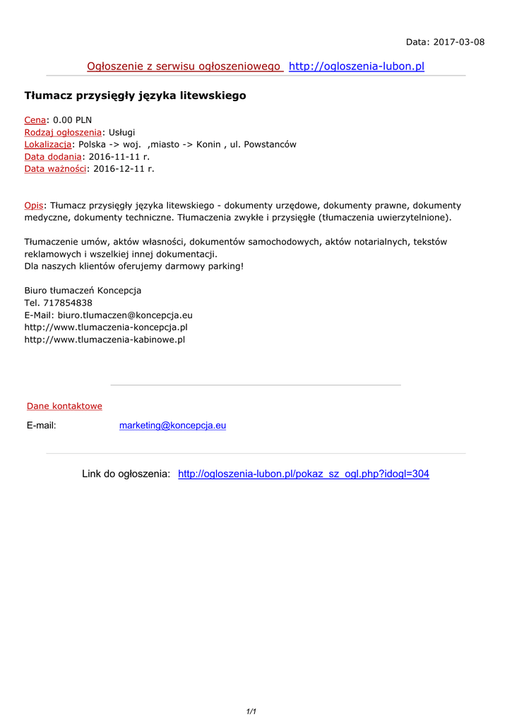 Data: 2017-03-08 Ogłoszenie z serwisu ogłoszeniowego http://ogloszenia-lubon.pl Tłumacz przysięgły języka litewskiego Cena: 0.00 PLN Rodzaj ogłoszenia: Usługi Lokalizacja: Polska -> woj. ,miasto -> Konin , ul. Powstanców Data dodania: 2016-11-11 r. Data ważności: 2016-12-11 r. Opis: Tłumacz przysięgły języka litewskiego - dokumenty urzędowe, dokumenty prawne, dokumenty medyczne, dokumenty techniczne. Tłumaczenia zwykłe i przysięgłe (tłumaczenia uwierzytelnione). Tłumaczenie umów, aktów własności, dokumentów samochodowych, aktów notarialnych, tekstów reklamowych i wszelkiej innej dokumentacji. Dla naszych klientów oferujemy darmowy parking! Biuro tłumaczeń Koncepcja Tel. 717854838 E-Mail: [email protected] http://www.tlumaczenia-koncepcja.pl http://www.tlumaczenia-kabinowe.pl Dane kontaktowe E-mail: [email protected] Link do ogłoszenia: http://ogloszenia-lubon.pl/pokaz_sz_ogl.php?idogl=304 1/1