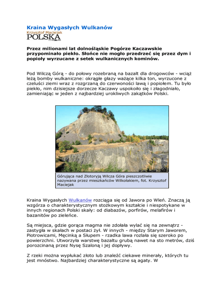 Kraina Wygasłych Wulkanów Krzysztof Maciejak Przez milionami lat dolnośląskie Pogórze Kaczawskie przypominało piekło. Słońce nie mogło przedrzeć się przez dym i popioły wyrzucane z setek wulkanicznych kominów. Pod Wilczą Górą - do połowy rozebraną na bazalt dla drogowców - wciąŜ leŜą bomby wulkaniczne: okrągłe głazy waŜące kilka ton, wyrzucone z czeluści ziemi wraz z rozgrzaną do czerwoności lawą i popiołem. Tu było piekło, nim dzisiejsze dorzecze Kaczawy uspokoiło się i złagodniało, zamieniając w jeden z najbardziej urokliwych zakątków Polski. Górująca nad Złotoryją Wilcza Góra pieszczotliwie nazywana przez mieszkańców Wilkołakiem, fot. Krzysztof Maciejak Kraina Wygasłych Wulkanów rozciąga się od Jawora po Wleń. Znaczą ją wzgórza o charakterystycznym stoŜkowym kształcie i niespotykane w innych regionach Polski skały: od diabazów, porfirów, melafirów i bazanitów po zieleńce. Są miejsca, gdzie gorąca magma nie zdołała wylać się na zewnątrz zastygła w skałach w postaci Ŝył. W innych - między Starym Jaworem, Piotrowicami, Męcinką a Słupem - rzadka lawa rozlała się szeroko po powierzchni. Utworzyła warstwę bazaltu grubą nawet na sto metrów, dziś porozcinaną przez Nysę Szaloną i jej dopływy. Z rzeki moŜna wypłukać złoto lub znaleźć ciekawe minerały, których tu jest mnóstwo. Najbardziej charakterystyczne są agaty. W Nowym Kościele i RóŜanej przez cały rok moŜna spotkać zbieraczy z róŜnych części Polski. Niektórzy szukają ich w Kaczawie, inni - ku utrapieniu leśników - rozkopują las w poszukiwaniu kamieni. Wilcza Góra, Czartowska Skała, Ostrzyca, Grodziec, Trupień, Owczarek, Obłoga, Górzec, Łysanka, Oścień, Radogost, Kostrza, Dębina itd. Rzadko które z tych wzniesień ma więcej niŜ 400 metrów n.p.m. Jako czynne wulkany były jednak znacznie wyŜsze (mogły wyrastać nawet 1000 m n.p.m.). Wije się wśród nich 85-kilometrowy Szlak Wygasłych Wulkanów, wiodąc turystów od Legnickiego Pola przez Jawor, Wąwóz Myśliborski, Proboszczów i Grodziec do Złotoryi.
