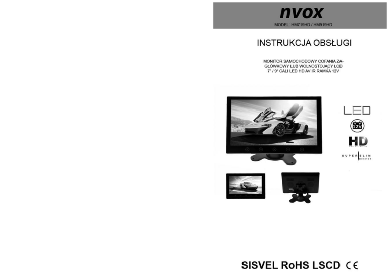 sygnałowych. WSTĘP UWAGA: ABY ZMNIEJSZYĆ RYZYKO PORAŻENIA PRĄDEM, NIE NALEŻY ZDEJMOWAĆ POKRYWY (LUB TYLNEJ PŁYTY). WEWNĄTRZ URZĄDZENIA NIE MA ŻADNYCH CZĘŚCI, KTÓRE MOŻE NAPRAWIĆ UŻYTKOWNIK. WSZYSTKIE CZYNNOŚCI SERWISOWE NALEŻY ZLECAĆ WYKWALIFIKOWANYM PRACOWNIKOM SERWISU Ten symbol oznacza obecność w środku urządzenia wysokiego napięcia, którego wielkość może stwarzać ryzyko porażenia ludzi prądem elektrycznym. Ten symbol oznacza, że do urządzenia dołączono dokumentację, zawierającą ważne informacje na temat jego działania i konserwacji (serwisowania). ABY NIE DOPUŚCIĆ DO USZKODZEŃ, MOGĄCYCH SPOWODOWAĆ POŻAR LUB RYZYKO PORAŻENIA PRĄDEM, NIE WYSTAWIAĆ URZĄDZENIA NA DESZCZ LUB WILGOĆ. ZAGROŻENIE PORAŻENIEM PRĄDEM ELEKTRYCZNYM, NIE OTWIERAĆ. UWAGA Instrukcja serwisowa przeznaczona jest tylko dla wykwalifikowanego personelu serwisowego. Aby zmniejszyć ryzyko porażenia prądem, użytkownik nieposiadający odpowiednich kwalifikacji nie może wykonywać przy urządzeniu żadnych czynności, poza opisanymi w tej instrukcji obsługi. UWAGA Stojak przeznaczony jest do użytku tylko z tym odbiornikiem. Użycie z innym urządzeniem może zagrażać jego stabilności i grozić zranieniem ludzi. OSTRZEŻENIE -Nie narażać odbiornika na przenikanie do jego wnętrza cieczy i nie stawiać na nim żadnych naczyń wypełnionych wodą (np. wazonów). -Jest to urządzenie klasy B, co oznacza, że może ono powodować zakłócenia radiowe w mieszkaniu. W takim przypadku, użytkownik powinien zastosować odpowiednie środki zapobiegawcze. Dla ograniczenia ryzyka pożaru i porażenia prądem, nie wystawiać urządzenia na deszcz lub wilgoć. UWAGI FEDERALNEJ KOMISJI ŁĄCZNOŚCI (FCC) Urządzenie zostało przebadane i stwierdzono jego zgodność z wartościami granicznymi dla urządzeń klasy B, zgodnie z Częścią 15 zasad FCC. Te wartości graniczne są tak dobrane, aby zapewnić dobrą ochronę przed szkodliwymi zakłóceniami w środowisku domowym, a także w otoczeniu handlowym, biurowym i przemysłowym. Urządzenie może generować, wykorzystywać i promieniować energię o częstotliwości radiowej i w razie podłączenia go niezgodnie z instrukcją, może powodować szkodliwe zakłócenia łączności radiowej. Jednak nie można zagwarantować, że takie zakłócenia nie występują w jakiejś konkretnej instalacji. W przypadku, gdy to urządzenie powoduje szkodliwe zakłócenia odbioru sygnału radiowego lub telewizyjnego, co można określić po jego wyłączeniu i włączeniu, zaleca się spróbować wyeliminować zakłócenia, wykonując jedną lub kilka z następujących czynności: -zmienić kierunek lub miejsce ustawienia anteny odbiorczej, -zwiększyć odstęp między urządzeniem a odbiornikiem, -podłączyć urządzenie do gniazdka w obwodzie innym, niż ten, do którego jest podłączony odbiornik, -zwrócić się o pomoc do sprzedawcy lub doświadczonego technika radiowo-telewizyjnego. Wszelkie zmiany lub modyfikacje niezatwierdzone jednoznacznie przez stronę, jako zgodne, grożą utratą przez użytkownika prawa do używania urządzeń łączności. Podłączanie urządzeń peryferyjnych wymaga stosowania uziemionych i ekranowanych przewodów Ważne zasady bezpieczeństwa Używając odbiornika, należy zawsze zachować ostrożność. Aby zmniejszyć ryzyko pożaru, porażenia prądem elektrycznym i innych obrażeń, zawsze pamiętaj o następujących środkach ostrożności podczas podłączania, używania lub konserwowania odbiornika TV. - Zapoznaj się z instrukcją obsługi i schowaj ją w bezpiecznym miejscu. - Przestrzegaj wszystkich ostrzeżeń. - Przestrzegaj wszystkich instrukcji. - Nie używaj telewizora w pobliżu wody. - Nie zasłaniaj otworów wentylacyjnych. - Podłącz odbiornik zgodnie z instrukcją producenta. - Nie ustawiaj go w pobliżu źródeł ciepła, np. kaloryferów, grzejników, pieców lub innych urządzeń wytwarzających ciepło (dotyczy też wzmacniaczy). - Nie lekceważ zabezpieczenia w postaci spolaryzowanej wtyczki lub wtyczki z uziemieniem. Wtyczka spolaryzowana posiada dwa płaskie wtyki, z których jeden jest szerszy. Wtyczka z uziemieniem ma dwa wtyki prądowe i bolec uziemiający. Szeroki wtyk lub bolec uziemiający służą do ochrony użytkownika. Jeśli wtyczka w dostarczonym urządzeniu nie pasuje do gniazdka, zwróć się do elektryka o wymianę gniazdka starszego typu. - Zabezpiecz kabel zasilający w taki sposób, aby nie można było po nim chodzić, ani go przygnieść, zwłaszcza przy wtyczkach, oprawach oraz w miejscu, w którym kabel wychodzi z telewizora. - Używaj tylko dodatków i akcesoriów określonych przez producenta. - Używaj tylko w połączeniu z wózkiem, stojakiem, statywem lub stolikiem określonym przez producenta lub sprzedawanym razem z odbiornikiem. Przewożąc telewizor na wózku zachowaj ostrożność, aby uniknąć obrażeń spowodowanych wywróceniem się wózka z telewizorem. - Wyłączaj telewizor z gniazdka podczas burz z piorunami, lub gdy nie używasz go przez dłuższy czas. - Całe serwisowanie zleć pracownikom serwisu. Serwisowanie jest wymagane w przypadku, gdy telewizor uległ uszkodzeniu, jakaś ciecz wlała się do jego wnętrza lub wpadł tam jakiś przedmiot, telewizor stał na deszczu lub w wilgotnym otoczeniu, nie działa normalnie lub został upuszczony. - Czyść urządzenie tylko niestrzępiącą się szmatką. Informacje ogólne: Monitor samochodowy 9” z 2 wejściami AV RCA chinch. Instalacja: Montaż monitora czy jakichkolwiek urządzeń powinien być wykonany przez wykfalifikowany personel. Osoby z odpowiednia wiedzą oraz doświadczeniem w instalacjach samochodowych systemów audiowizualnych. Monitor jest zasilany napięciem DC12V. 1. Nie należy instalować urządzenia w pozycji, która ogranicza pole widzenia kierowcy lub takiej, która ogranicza swobodne posługiwania się kierownicą, lewarkiem zmiany biegów lub też hamulcem ręc