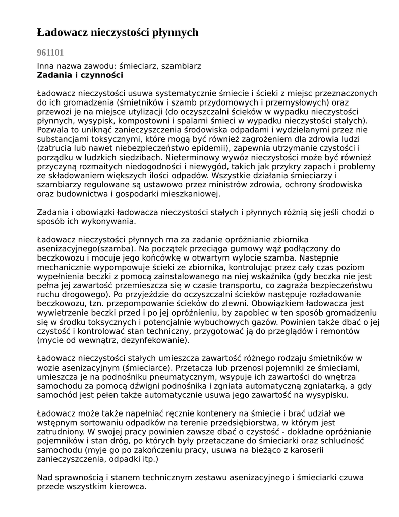 Ładowacz nieczystości płynnych 961101 Inna nazwa zawodu: śmieciarz, szambiarz Zadania i czynności Ładowacz nieczystości usuwa systematycznie śmiecie i ścieki z miejsc przeznaczonych do ich gromadzenia (śmietników i szamb przydomowych i przemysłowych) oraz przewozi je na miejsce utylizacji (do oczyszczalni ścieków w wypadku nieczystości płynnych, wysypisk, kompostowni i spalarni śmieci w wypadku nieczystości stałych). Pozwala to uniknąć zanieczyszczenia środowiska odpadami i wydzielanymi przez nie substancjami toksycznymi, które mogą być również zagrożeniem dla zdrowia ludzi (zatrucia lub nawet niebezpieczeństwo epidemii), zapewnia utrzymanie czystości i porządku w ludzkich siedzibach. Nieterminowy wywóz nieczystości może być również przyczyną rozmaitych niedogodności i niewygód, takich jak przykry zapach i problemy ze składowaniem większych ilości odpadów. Wszystkie działania śmieciarzy i szambiarzy regulowane są ustawowo przez ministrów zdrowia, ochrony środowiska oraz budownictwa i gospodarki mieszkaniowej. Zadania i obowiązki ładowacza nieczystości stałych i płynnych różnią się jeśli chodzi o sposób ich wykonywania. Ładowacz nieczystości płynnych ma za zadanie opróżnianie zbiornika asenizacyjnego(szamba). Na początek przeciąga gumowy wąż podłączony do beczkowozu i mocuje jego końcówkę w otwartym wylocie szamba. Następnie mechanicznie wypompowuje ścieki ze zbiornika, kontrolując przez cały czas poziom wypełnienia beczki z pomocą zainstalowanego na niej wskaźnika (gdy beczka nie jest pełna jej zawartość przemieszcza się w czasie transportu, co zagraża bezpieczeństwu ruchu drogowego). Po przyjeździe do oczyszczalni ścieków następuje rozładowanie beczkowozu, tzn. przepompowanie ścieków do zlewni. Obowiązkiem ładowacza jest wywietrzenie beczki przed i po jej opróżnieniu, by zapobiec w ten sposób gromadzeniu się w środku toksycznych i potencjalnie wybuchowych gazów. Powinien także dbać o jej czystość i kontrolować stan techniczny, przygotować ją do przeglądów i remontów (mycie od wewnątrz, dezynfekowanie). Ładowacz nieczystości stałych umieszcza zawartość różnego rodzaju śmietników w wozie asenizacyjnym (śmieciarce). Przetacza lub przenosi pojemniki ze śmieciami, umieszcza je na podnośniku pneumatycznym, wsypuje ich zawartości do wnętrza samochodu za pomocą dźwigni podnośnika i zgniata automatyczną zgniatarką, a gdy samochód jest pełen także automatycznie usuwa jego zawartość na wysypisku. Ładowacz może także napełniać ręcznie kontenery na śmiecie i brać udział we wstępnym sortowaniu odpadków na terenie przedsiębiorstwa, w którym jest zatrudniony. W swojej pracy powinien zawsze dbać o czystość - dokładne opróżnianie pojemników i stan dróg, po których były przetaczane do śmieciarki oraz schludność samochodu (myje go po zakończeniu pracy, usuwa na bieżąco z karoserii zanieczyszczenia, odpadki itp.) Nad sprawnością i stanem technicznym zestawu asenizacyjnego i śmieciarki czuwa przede wszystkim kierowca.