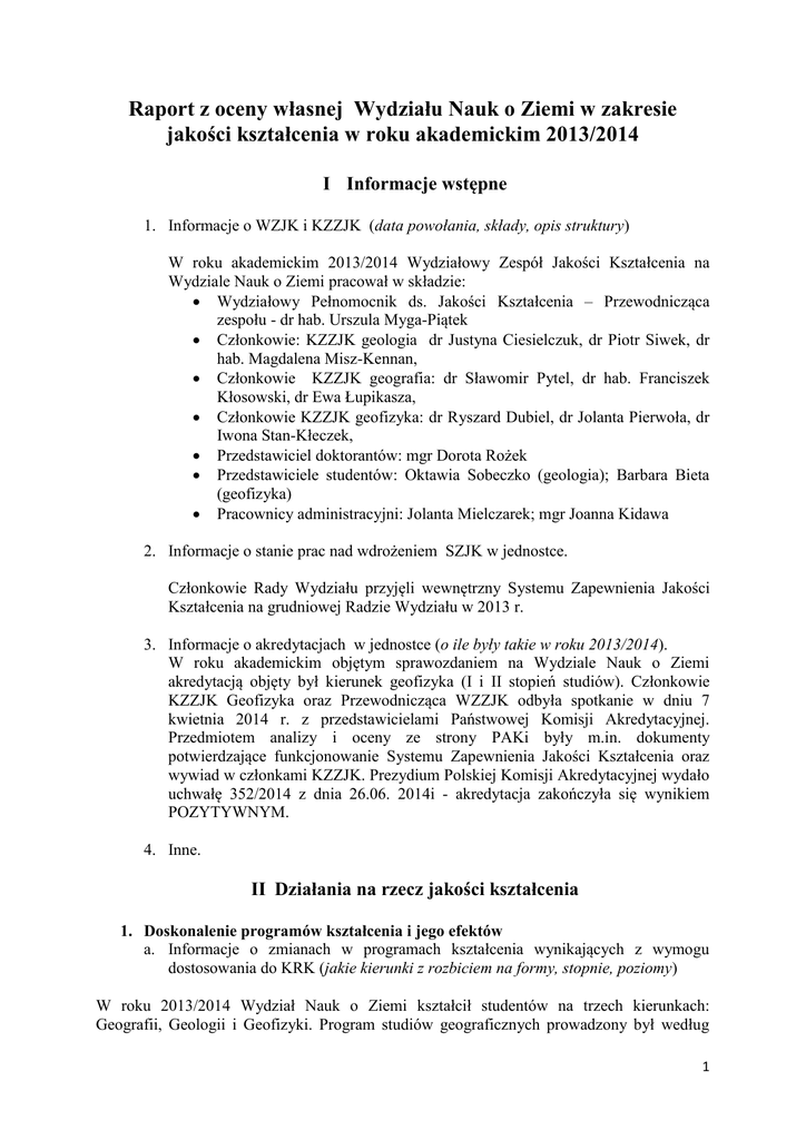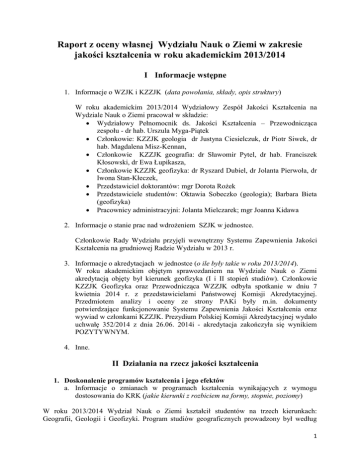 Raport z oceny własnej Wydziału Nauk o Ziemi w zakresie jakości