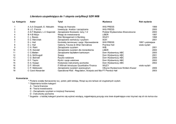 Literatura uzupełniająca do 1 stopnia certyfikacji SZR WIB Lp Kategoria 1 2 3 4 5 6 7 8 9 10 11 12 13 14 15 16 18 19 A B A B C D D D C C C D C D D D C C Autor Tytuł Wydawca A.A Groppelli, E. Nikbakht J.C. Francis E.F Brigham, L.C Gapenski H.B Mayo J. Bessis Z. Marciniak J. Hull J. Hull H. Riehl R. Kendall C.Matten A. McDougall D. Bennett F. Taylor A. Kasapi P. Wilmott P. Matkowski Carol Alexander Wstęp do finansów WIG PRESS Inwestycje. Analiza i zarządzanie WIG PRESS Zarządzanie finansami, tomy 1-2 Polskie Wydawnictwo Ekonomiczne Wstęp do inwestowania LIBER Risk Management in Banking WILEY Zarządzanie wartością i ryzykiem SGH Kontrakty terminowe i opcje. Wprowadzenie WIG PRESS Options, Futures & Other Derivatives Prentice Hall Zarządzanie ryzykiem WIB Zarządzanie ryzykiem dla menedŜerów LIBER Zarządzanie kapitałem bankowym Dom Wydawniczy ABC Swapy Dom Wydawniczy ABC Ryzyko walutowe Dom Wydawniczy ABC Rynki i opcje walutowe Dom Wydawniczy ABC Kredytowe instrumenty pochodne Dom Wydawniczy ABC P.Wilmott Introduces Quantitative Finance WILEY Zarządzanie ryzykiem operacyjnym Oficyna Wydawnicza Wolters Kluwer Operational Risk - Regulation, Analysis and Management FT Prentice Hall Rok wydania 1999 2000 2000 1997 1998 2001 1997 i późniejsze wiele wydań 2001 2000 2000 2001 2000 2000 2002 wiele wydań 2006 2003 Komentarze * Podane zostały tłumaczenia na j. polski, jeśli istnieją. WciąŜ są one tańsze od oryginalnych wydań. * Objaśnienia kodów kategorii A - Teoria finansów B - Teoria inwestowania C - Zarządzanie ryzykiem w instytucji finansowej D - Instrumenty pochodne * Sugestia - z kaŜdej kategorii powinno się wybrać wiodącą, najpełniejszą pozycję oraz dwie dopełniające oraz trzymać się ich do końca studium. Uwagi Wstęp do finansów oraz elementarz instrumentów pochodnych Solidny wykład CAPM, APT, zarys teorii uŜyteczności, dywersyfikacja portfela, wstęp do podstawowych instrumentów pochodnych Teoria finansów, zarządzanie strukturą kapitałową, wycena inwestycji, wstęp do zarządzania ryzykiem Przegląd teorii inwestowania, ciekawe, ale raczej nie wyczerpujące Są dwa wydania, pierwsze z 1998 jest mniejsze i wystarczające na 1 stopień certyfiakcji, drugie z 2002 znacznie większe i ambitniejsze Przegląd modeli z teorii inwestowania i zarządzania ryzykiem Konieczność dla kaŜdego początkującego w instrumentach pochodnych Im młodsze wydanie tym lepsze. Rozwija poprzednią pozycję tego autora. Konieczność dla wszystkich, którzy zawodowo stykają się z instrumentami pochodnymi. Bardzo dobre, praktyczne wprowadzenie do zarządzania ryzykiem bankowym Pozwala zapoznać się z organizacją procesu zarządzania ryzykiem Jedna z pierwszych pozycji o kapitale ekonomicznym O swapach, głównie procentowych przystępnie Przegląd metod i idei z zakresu zarządzania ryzykiem walutowym O opcjach bardzo przystępnie i wstępnie O pochodnych kredytowych przystepnie i wstępnie Dobry wstęp do modelowania instrumentów pochodnych Dobre kompendium podstawowej wiedzy z zakresu ryzyka operacyjnego. Dobry zakres materiały rozszerzający podstawową wiedzę z zakresu ryzyka operacyjnego, głównie o metody zaawansowane. Napisane w przystępny sposób. do końca studium.