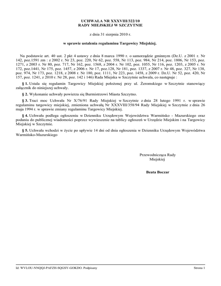 UCHWAŁA NR XXXVIII/322/10 RADY MIEJSKIEJ W SZCZYTNIE z dnia 31 sierpnia 2010 r. w sprawie ustalenia regulaminu Targowicy Miejskiej. Na podstawie art. 40 ust. 2 pkt 4 ustawy z dnia 8 marca 1990 r. o samorządzie gminnym (Dz.U. z 2001 r. Nr 142, poz.1591 zm : z 2002 r. Nr 23, poz. 220, Nr 62, poz. 558, Nr 113, poz. 984, Nr 214, poz. 1806, Nr 153, poz. 1271, z 2003 r. Nr 80, poz. 717, Nr 162, poz. 1568, z 2004 r. Nr 102, poz. 1055, Nr 116, poz. 1203, z 2005 r. Nr 172, poz.1441, Nr 175, poz. 1457, z 2006 r. Nr 17, poz.128, Nr 181, poz. 1337, z 2007 r. Nr 48, poz. 327, Nr 138, poz. 974, Nr 173, poz. 1218, z 2008 r. Nr 180, poz. 1111, Nr 223, poz. 1458, z 2009 r. Dz.U. Nr 52, poz. 420, Nr 157, poz. 1241, z 2010 r. Nr 28, poz. 142 i 146) Rada Miejska w Szczytnie uchwala, co następuje : § 1. Ustala się regulamin Targowicy Miejskiej położonej przy ul. Żeromskiego w Szczytnie stanowiący załącznik do niniejszej uchwały. § 2. Wykonanie uchwały powierza się Burmistrzowi Miasta Szczytno. § 3. Traci moc Uchwała Nr X/76/91 Rady Miejskiej w Szczytnie z dnia 28 lutego 1991 r. w sprawie regulaminu targowicy miejskiej, zmieniona uchwałą Nr XXXVIII/358/94 Rady Miejskiej w Szczytnie z dnia 26 maja 1994 r. w sprawie zmiany regulaminu Targowicy Miejskiej. § 4. Uchwała podlega ogłoszeniu w Dzienniku Urzędowym Województwa Warmińsko - Mazurskiego oraz podaniu do publicznej wiadomości poprzez wywieszenie na tablicy ogłoszeń w Urzędzie Miejskim i na Targowicy Miejskiej w Szczytnie. § 5. Uchwała wchodzi w życie po upływie 14 dni od dnia ogłoszenia w Dzienniku Urzędowym Województwa Warmińsko-Mazurskiego Przewodnicząca Rady Miejskiej Beata Boczar Id: WVLOU-NNQQJ-PAFZH-SQGSY-GOKDO. Podpisany Strona 1 Załącznik do Uchwały Nr XXXVIII/322/10 Rady Miejskiej w Szczytnie z dnia 31 sierpnia 2010 r. REGULAMIN TARGOWICY MIEJSKIE POŁOŻONEJ W SZCZYTNIE PRZY UL. ŻEROMSKIEGO I. Postanowienia ogólne § 1. Regulamin obowiązuje wszystkie osoby przebywające na targowisku. § 2. 1. Właścicielem targowiska jest Gmina Miejska Szczytno. § 3. 1. Targowisko czynne jest: 1) od poniedziałku do piątku w godzinach od 5:00 do godz.17:00 2) w soboty w godz. od 5:00 do godz. 14:00 z zastrzeżeniem ust. 2 2. Na uzasadniony wniosek handlowców targowisko może być czynne w innych dniach i godzinach niż określone w ust. 1. 3. Dowóz towarów do punktów handlowych targowiska i ich wywóz winien odbywać się w następujących godzinach: 1) dowóz – od 6:00 do 10:00, 2) wywóz – od 16:00 do 17:00. II. Warunki uczestniczenia w sprzedaży. § 4. Uprawnionymi do wykonywania handlu na targowicy są: 1. Organizacje handlu państwowego i spółdzielczego. 2. Osoby prawne sprzedające wyprodukowane przez siebie wyroby. 3. Osoby fizyczne posiadające odpowiednie zaświadczenie o wpisie do ewidencji działalności gospodarczej i inne wymagane uprawnienia. 4. Posiadacze indywidualnych gospodarstw rolnych, działek przydomowych oraz użytkownicy działek w pracowniczych ogrodach działkowych- w zakresie wyprodukowanych płodów rolnych, kwiatów. 5. Osoby sprzedające produkty pochodzenia leśnego, w tym grzyby jadalne z zastrzeżeniem z § 7 ust. 7 regulaminu. 6. Osoby fizyczne pozbywające się w drodze sprzedaży własnych przedmiotów lub produktów w drobnych ilościach. III. Organizacja Targowiska § 5. 1. Miejsce sprzedaży wyznacza administrator targowiska w drodze stosownej umowy z najemcą uprawnionym do wykonywania handlu lub jednorazowo. 2. Nie wolno odstępować wyznaczonego miejsca osobom trzecim. 3. Miejsce sprzedaży nie może być wyznaczone na jezdniach, chodnikach, przejściach przeznaczonych do ruchu w sposób utrudniających ruch pieszych. 4. Administrator targowiska może wyznaczyć stałe punkty sprzedaży dla określonych grup /rodzajów/ towarów. 5. Wszystkie towary mogą być wystawione tylko w określonych granicach stoiska handlowego lub obiektu. § 6. Rezerwacje miejsc: Id: WVLOU-NNQQJ-PAFZH-SQGSY-GOKDO. Podpisany Strona 1 1. Pierwszeństwo do zajęcia stoiska handlowego posiadają osoby, które dokonały rezerwacji miejsca na dany okres /w formie umowy/ najpóźniej w ostatnim dniu miesiąca poprzedzającego, zawartej z administratorem targowiska. 2. Prawo utrzymania rezerwacji danego miesiąca na następny miesiąc zachowują osoby, które na podstawie podania złożonego do administratora targowiska nie później niż w ostatnim dniu miesiąca poprzedzającego –zgłoszą wniosek o zawarcie umowy co najmniej na jeden miesiąc. 3. Osoba która chce zrezygnować z rezerwacji zobowiązana jest na podstawie podania złożonego nie później niż 14 dni przed upływem okresu rezerwacji określonego w umowie, powiadomić administratora targowiska. 4. Zarezerwowane miejsce handlowe nie zajęte do godz. 10.00 w danym dniu handlowym może być zagospodarowane zgodnie z potrzebami targowiska, tylko w tym dniu. § 7. Na targowisku obowiązuje zakaz: 1. Poruszania się i postoju pojazdów, za wyjątkiem pojazdów zaopatrzenia sklepów, straganów i innych urządzeń zlokalizowanych na targowisku za wyjątkiem sytuacji określonych w § 3 pkt. 3 regulaminu. 2. Wystawiania, reklamowania i spożywania napojów alkoholowych. 3. Wystawiania, reklamowania i spożywania napojów alkoholowych. 4. Używania urządzeń nagłaśniających, utrudniających komunikowanie się handlujących z kupującymi. 5. Instalowania tymczasowych elementów konstrukcyjnych straganów, kiosków tj. zadaszenia, zadaszenia wieszaków, lin i innych, powodujących utrudnienia w ruchu pieszym. 6. Rozbudowy stoisk, ław, straganów bez uzyskania pisemnej zgody właściciela targowiska. 7. Wprowadzenia do obrotu grzybów świeżych i suszonych rosnących w warunkach naturalnych bez uzyskania atestu na grzyby świeże lub grzyby suszone, oraz nie opakowanych grzybów suszonych pozyskiwanych z grzybów rosnących w naturalnych warunkach. 8. Ustawiania i przestawiania własnych bądź istniejących punktów sprzedaży, bez