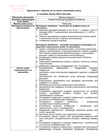 Ogłoszenie o naborze na na wolne stanowisko pracy w Urzędzie Gminy Wola Uhruska Oferowane stanowisko Młodszy księgowy Komórka organizacyjna Referat Finansowo-Księgowo-Podatkowy Ilość etatów 1 Wymiar czasu pracy Pełny etat Wymagania związane ze Wymagania niezbędne – konieczne do podjęcia pracy na stanowiskiem stanowisku: 1) spełnienie wymagań zawartych w art. 6 ust. 1 i 3 ustawy z dnia 21 listopada 2008 r. o pracownikach samorządowych (j. t. z 2014 r. poz.1202). 2) minimum wykształcenie średnie ekonomiczne lub średnie ogólne z ukończonym kursem z zakresu rachunkowości. 3) umiejętność obsługi komputera. Zakres zadań wykonywanych na stanowisku Wymagania dodatkowe – pozostałe wymagania pozwalające na optymalne wykonywanie zadań na stanowisku: 1) wiedza i umiejętność stosowania ustaw: o finansach publicznych, ustawy o rachunkowości, ordynacja podatkowa, ustawa o podatku VAT, Kodeks postępowania administracyjnego, o samorządzie gminnym, ustawy o pracownikach samorządowych; 2) Umiejętność obsługi programów komputerowych (Windows, Pakiet Office); 3) Preferowane wykształcenie wyższe z zakresu: ekonomia, finanse, rachunkowość; 4) preferowany staż pracy w księgowości, min. 12 miesięcy. dekretowanie i księgowanie dowodów 1. Kompletowanie, księgowych (faktur, rachunków, innych dokumentów księgowych) zgodnie z przyjętymi zasadami rachunkowości dla określonych przez głównego księgowego jednostek. 2. Przyjmowania, gromadzenia oraz segregacji dokumentów pod względem ich rodzaju. 3. Weryfikacji poprawności wystawionych dokumentów. 4. Sprawdzanie pod względem formalno-rachunkowym dokumentów księgowych. 5. Prowadzenie księgowych urządzeń syntetycznych do środków trwałych, pozostałych środków trwałych oraz wartości niematerialnych i prawnych. 6. Prowadzenie księgowych urządzeń analitycznych i syntetycznych do rachunku wyodrębnionego „Depozyty”. 7. Prowadzenie ewidencji analitycznej i syntetycznej wyodrębnionych środków unijnych. 8. Prowadzenie ewidencji analitycznej i syntetycznej sum depozytowych, w tym w szczególności: 9. księgowanie zabezpieczeń należytego wykonania umowy oraz innych depozytów, 10. terminowe zwroty wadium oraz wniesionych zabezpieczeń. 11. Prowadzenie rejestru zakupu VAT, sporządzanie deklaracji VAT oraz rozliczanie i przygotowywanie przelewu należnego podatku VAT. 12. Prowadzenie księgowych urządzeń analitycznych i syntetycznych do rachunku wyodrębnionego „VAT”. 13. Prowadzenie urządzeń analitycznych i syntetycznych dotyczących Zakładowego Funduszu Świadczeń Socjalnych. Prowadzenie rozrachunków pracowniczych ZFŚS. 14. Prowadzenie kasy w zakresie opłaty skarbowej. 15. Przygotowywanie przelewów bankowych. 16. Czynne uczestnictwo w przygotowaniu sprawozdań budżetowych i finansowych. 17. Wspomaganie głównego księgowego w czynnościach i zadaniach realizowanych przez dział finansowo-księgowy. 18. Obsługa programu „BESTIA” w zakresie Urzędu Gminy. 19. Zastepstwo podczas nieobecności pracownika ds. księgowości RFKP. Informacja o warunkach 1. Praca administracyjno-biurowa w siedzibie Urzędu Gminy Wola pracy na danym Uhruska. stanowisku 2. Praca z monitorem ekranowym. 3. Stanowisko pracy związane z pracą przy monitorze komputerowym. 4. Liczne kontakty wewnętrzne w ramach Urzędu oraz zewnętrzne z interesantami. 5. Miejsce pracy nie dostosowane do potrzeb osób niepełnosprawnych (brak windy). Dodatkowe informacje W miesiącu poprzedzającym datę publikacji niniejszego ogłoszenia wskaźnik zatrudnienia osób niepełnosprawnych w Urzędzie Gminy Wola Uhruska , w rozumieniu przepisów o rehabilitacji zawodowej i społecznej oraz zatrudnianiu osób niepełnosprawnych, nie przekroczył 6%. W związku z powyższym pierwszeństwo w zatrudnieniu na stanowisku urzędniczym, z wyłączeniem kierowniczych stanowisk urzędniczych, przysługuje osobie niepełnosprawnej, o ile w wyniku naboru znajdzie się w gronie pięciu najlepszych kandydatów spełniających wymagania niezbędne oraz w największym stopniu spełniających wymagania dodatkowe. Zatem kandydat, który zamierza skorzystać z powyższego uprawnienia zobowiązany jest do złożenia wraz z dokumentami aplikacyjnymi kopii dokumentu potwierdzającego niepełnosprawność. Wymagane dokumenty 1. List motywacyjny aplikacyjne 2. Życiorys (CV) 3. Kopie dokumentów potwierdzających posiadane wykształcenie. 4. Kserokopie świadectw pracy. 5. Oświadczenie kandydata o pełnej zdolności do czynności prawnych oraz korzystaniu z pełni praw publicznych i o niekaralności za umyślne przestępstwo ścigane z oskarżenia publicznego lub umyślne przestępstwo skarbowe. 6. Oświadczenie kandydata o wyrażeniu zgody na przetwarzanie danych osobowych. 5. Kwestionariusz osobowy dla osoby ubiegającej się o zatrudnienie. 7. Inne dodatkowe dokumenty o posiadanych kwalifikacjach lub umiejętnościach. Wszystkie oświadczenia, list motywacyjny, CV oraz kwestionariusz osobowy powinny być własnoręcznie podpisane, pod rygorem nieuzyskania pozytywnej oceny formalnej. Wszystkie dokumenty przedkładane w naborze przez kandydata muszą być sporządzone w języku polskim w formie umożliwiającej ich odczytanie, a dokumenty wydane w języku obcym powinny być przetłumaczone przez tłumacza przysięgłego. Miejsce i termin składania Wymagane dokumenty (z oznaczeniem nadawcy) należy: dokumentów 1) składać w zamkniętych kopertach do dnia 08.09.2015 r. do godz. 15.30 w Kancelarii Urzędu Gminy Wola Uhruska ul. Parkowa 5 22-230 Wola Uhruska, pok. 11 w godzinach urzędowania 2) lub 3) przesłać pocztą do dnia 08.09.2015 r. – (decyduje data wpływu do urzędu ) na adres: Urząd Gminy Wola Uhruska ul. Parkowa 5 22230 Wola Uhruska. Dokumenty należy składać w kopertach z dopiskiem: „Dotyczy naboru na stanowisko młodszego księgowego”. Informacja o wynikach naboru Uwagi Dodatkowe informacje pod nr tel. 82 591 50 54 W