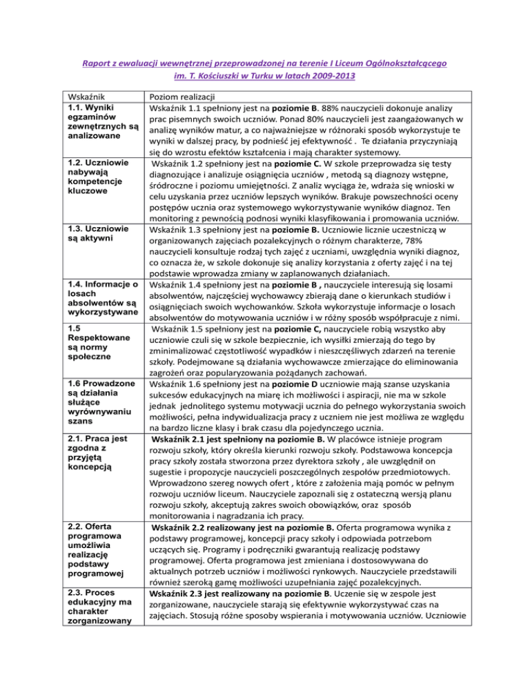 Raport z ewaluacji wewnętrznej przeprowadzonej na terenie I Liceum Ogólnokształcącego im. T. Kościuszki w Turku w latach 2009-2013 Wskaźnik 1.1. Wyniki egzaminów zewnętrznych są analizowane 1.2. Uczniowie nabywają kompetencje kluczowe 1.3. Uczniowie są aktywni 1.4. Informacje o losach absolwentów są wykorzystywane 1.5 Respektowane są normy społeczne 1.6 Prowadzone są działania służące wyrównywaniu szans 2.1. Praca jest zgodna z przyjętą koncepcją 2.2. Oferta programowa umożliwia realizację podstawy programowej 2.3. Proces edukacyjny ma charakter zorganizowany Poziom realizacji Wskaźnik 1.1 spełniony jest na poziomie B. 88% nauczycieli dokonuje analizy prac pisemnych swoich uczniów. Ponad 80% nauczycieli jest zaangażowanych w analizę wyników matur, a co najważniejsze w różnoraki sposób wykorzystuje te wyniki w dalszej pracy, by podnieść jej efektywność . Te działania przyczyniają się do wzrostu efektów kształcenia i mają charakter systemowy. Wskaźnik 1.2 spełniony jest na poziomie C. W szkole przeprowadza się testy diagnozujące i analizuje osiągnięcia uczniów , metodą są diagnozy wstępne, śródroczne i poziomu umiejętności. Z analiz wyciąga że, wdraża się wnioski w celu uzyskania przez uczniów lepszych wyników. Brakuje powszechności oceny postępów ucznia oraz systemowego wykorzystywanie wyników diagnoz. Ten monitoring z pewnością podnosi wyniki klasyfikowania i promowania uczniów. Wskaźnik 1.3 spełniony jest na poziomie B. Uczniowie licznie uczestniczą w organizowanych zajęciach pozalekcyjnych o różnym charakterze, 78% nauczycieli konsultuje rodzaj tych zajęć z uczniami, uwzględnia wyniki diagnoz, co oznacza że, w szkole dokonuje się analizy korzystania z oferty zajęć i na tej podstawie wprowadza zmiany w zaplanowanych działaniach. Wskaźnik 1.4 spełniony jest na poziomie B , nauczyciele interesują się losami absolwentów, najczęściej wychowawcy zbierają dane o kierunkach studiów i osiągnięciach swoich wychowanków. Szkoła wykorzystuje informacje o losach absolwentów do motywowania uczniów i w różny sposób współpracuje z nimi. Wskaźnik 1.5 spełniony jest na poziomie C, nauczyciele robią wszystko aby uczniowie czuli się w szkole bezpiecznie, ich wysiłki zmierzają do tego by zminimalizować częstotliwość wypadków i nieszczęśliwych zdarzeń na terenie szkoły. Podejmowane są działania wychowawcze zmierzające do eliminowania zagrożeń oraz popularyzowania pożądanych zachowań. Wskaźnik 1.6 spełniony jest na poziomie D uczniowie mają szanse uzyskania sukcesów edukacyjnych na miarę ich możliwości i aspiracji, nie ma w szkole jednak jednolitego systemu motywacji ucznia do pełnego wykorzystania swoich możliwości, pełna indywidualizacja pracy z uczniem nie jest możliwa ze względu na bardzo liczne klasy i brak czasu dla pojedynczego ucznia. Wskaźnik 2.1 jest spełniony na poziomie B. W placówce istnieje program rozwoju szkoły, który określa kierunki rozwoju szkoły. Podstawowa koncepcja pracy szkoły została stworzona przez dyrektora szkoły , ale uwzględnił on sugestie i propozycje nauczycieli poszczególnych zespołów przedmiotowych. Wprowadzono szereg nowych ofert , które z założenia mają pomóc w pełnym rozwoju uczniów liceum. Nauczyciele zapoznali się z ostateczną wersją planu rozwoju szkoły, akceptują zakres swoich obowiązków, oraz sposób monitorowania i nagradzania ich pracy. Wskaźnik 2.2 realizowany jest na poziomie B. Oferta programowa wynika z podstawy programowej, koncepcji pracy szkoły i odpowiada potrzebom uczących się. Programy i podręczniki gwarantują realizację podstawy programowej. Oferta programowa jest zmieniana i dostosowywana do aktualnych potrzeb uczniów i możliwości rynkowych. Nauczyciele przedstawili również szeroką gamę możliwości uzupełniania zajęć pozalekcyjnych. Wskaźnik 2.3 jest realizowany na poziomie B. Uczenie się w zespole jest zorganizowane, nauczyciele starają się efektywnie wykorzystywać czas na zajęciach. Stosują różne sposoby wspierania i motywowania uczniów. Uczniowie 2.4. Proces edukacyjny jest efektem współdziałania nauczycieli 2.5. Kształtuje się postawy uczniów 3.1. Wykorzystywan e są zasoby środowiska na rzecz rozwoju 3.2. Wartości edukacyjne są promowane i kształtowany jest wizerunek szkoły 3.3. Rodzice są partnerami szkoły lub placówki 4.1. Funkcjonuje współpraca w zespołach 4.2. Prowadzony jest wewnętrzny nadzór pedagogiczny 4.3. W szkole lub placówce pracuje się nad zapewnianiem jakości 4.4. Szkoła lub placówka ma odpowiednie warunki lokalowe i wyposażenie i rodzice w zróżnicowany sposób otrzymują informacje o osiągnięciach edukacyjnych, postępach i brakach w edukacji. W szkole istnieją procedury monitorowania jakości i efektywności procesu uczenia się uczniów. Baza dydaktyczna szkoły umożliwia płynny proces nauczania, choć wiadomo, że w związku z postępem techniki i nauki wymaga ciągłego doskonalenia i uzupełniania. Wskaźnik 2.4 jest realizowany na poziomie C. Nauczyciele współdziałają w tworzeniu warunków sprzyjających osiąganiu sukcesów edukacyjnych uczniów. Tworzą prężnie działające zespoły, które współpracują ze sobą w zakresie pokrywających się tematycznie zagadnień. Szkoła realizuje innowacje edukacyjne, lecz nie są one bardzo powszechne, najczęściej praca opiera się o sprawdzone już metody. W każdym zespole przedmiotowym znajdują się nauczyciele egzaminatorzy maturalni. Wskaźnik 2.5 realizowany jest na poziomie C . Uczniowie uczestniczą w działaniach edukacyjnych, sprzyjających kształtowaniu i uzyskiwaniu pożądanych postaw. Nauczyciele starają się uwzględniać potrzeby uczniów i rodziców, jest to jednak czasami trudne gdy oczekiwania uczniów i rodziców z jednej klasy są rozbieżne. Szkoła wymagania z obszaru 3.1 realizuje na poziomie B. Zasoby i uwarunkowania środo