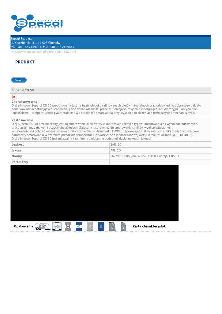 Specol Sp. z o.o. ul. Kluczborska 31, 41-508 Chorzów tel. +48 - 32 2459133, fax: +48 - 32 2459447 http://www.specol.com.pl/ain/produkt/652.html PRODUKT Superol CD 50 Charakterystyka Olej silnikowy Superol CD 50 produkowany jest na bazie głęboko rafinowanych olejów mineralnych oraz odpowiednio dobranego pakietu dodatków uszlachetniających. Zapewniają one dobre własności przeciwutleniające, myjąco-dyspergujące, antykorozyjne i antypienne, lepkościowo – temperaturowe gwarantujące dużą stabilność smarowania przy wysokich obciążeniach termicznych i mechanicznych. Zastosowanie Olej Superol CD 50 przeznaczony jest do smarowania silników wysokoprężnych różnych typów, doładowanych i wysokodoładowanych, pracujących przy małych i dużych obciążeniach. Zalecany jest również do smarowania silników wyeksploatowanych. W zależności od potrzeb można stosować całorocznie olej w klasie SAE: 15W/40 zapewniający łatwy rozruch silnika zimą oraz właściwe parametry smarowania w szerokim przedziale temperatur lub skorzystać z jednosezonowej wersji letniej w klasach SAE: 30, 40, 50. Olej silnikowy Superol CD 50 jest mieszalny i zamienny z olejami o podobnej klasie lepkości i jakości. Lepkość SAE: 50 Jakość API: CD Normy PN-79/C-96088/04, WT-SPEC-D-03 wersja 1 05.03 Parametry Parametry Superol CD 50 Lepkość kinematyczna w temp. 100 oC, mm2/s 18,0 Wskaźnik lepkości 90 Temperatura płynięcia, oC -18 Temperatura zapłonu, oC 220 Liczba zasadowa TBN, mg KOH/g 8,0 Zawartość wody, % Nie zawiera Zawartość ciał obcych, % Nie zawiera Uwaga: Powyższe wartości parametrów fizyko-chemicznych są wartościami typowymi. Wartości rzeczywiste umieszczone sa na świadectwach jakości dołączonych do każdej partii produktu. Opakowania Karta charakterystyk