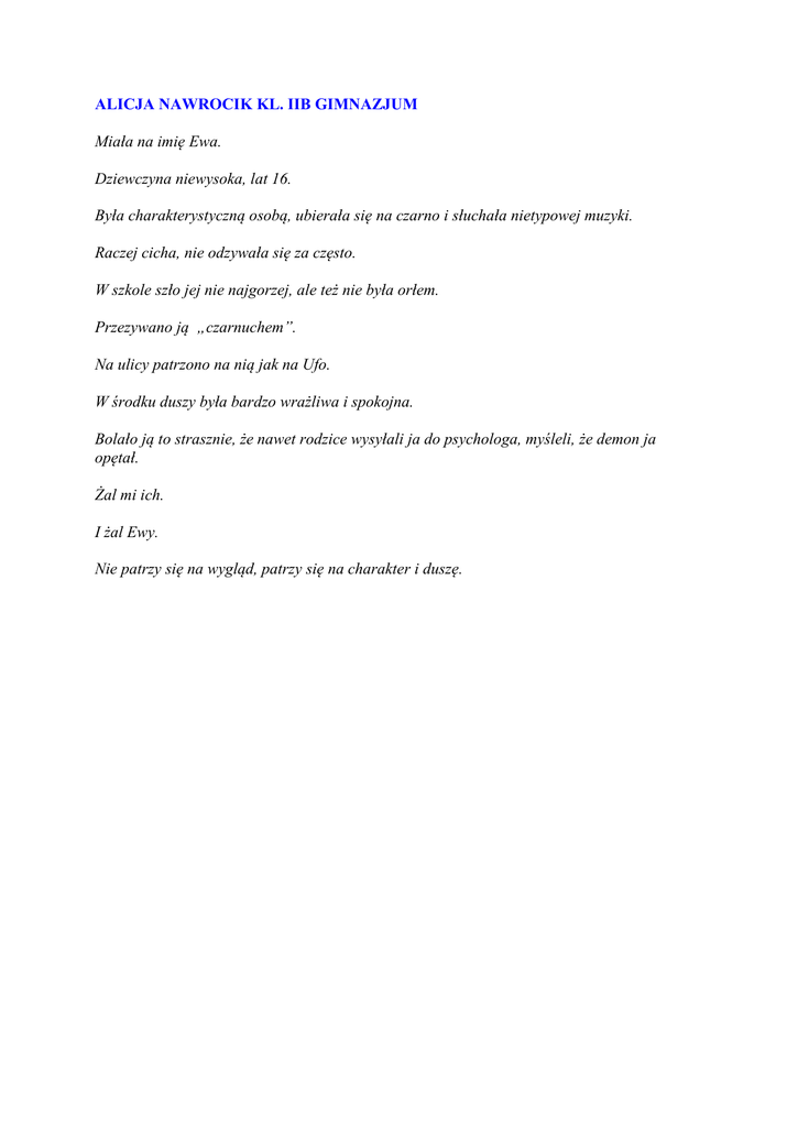 ALICJA NAWROCIK KL. IIB GIMNAZJUM Miała na imię Ewa. Dziewczyna niewysoka, lat 16. Była charakterystyczną osobą, ubierała się na czarno i słuchała nietypowej muzyki. Raczej cicha, nie odzywała się za często. W szkole szło jej nie najgorzej, ale też nie była orłem. Przezywano ją „czarnuchem”. Na ulicy patrzono na nią jak na Ufo. W środku duszy była bardzo wrażliwa i spokojna. Bolało ją to strasznie, że nawet rodzice wysyłali ja do psychologa, myśleli, że demon ja opętał. Żal mi ich. I żal Ewy. Nie patrzy się na wygląd, patrzy się na charakter i duszę.