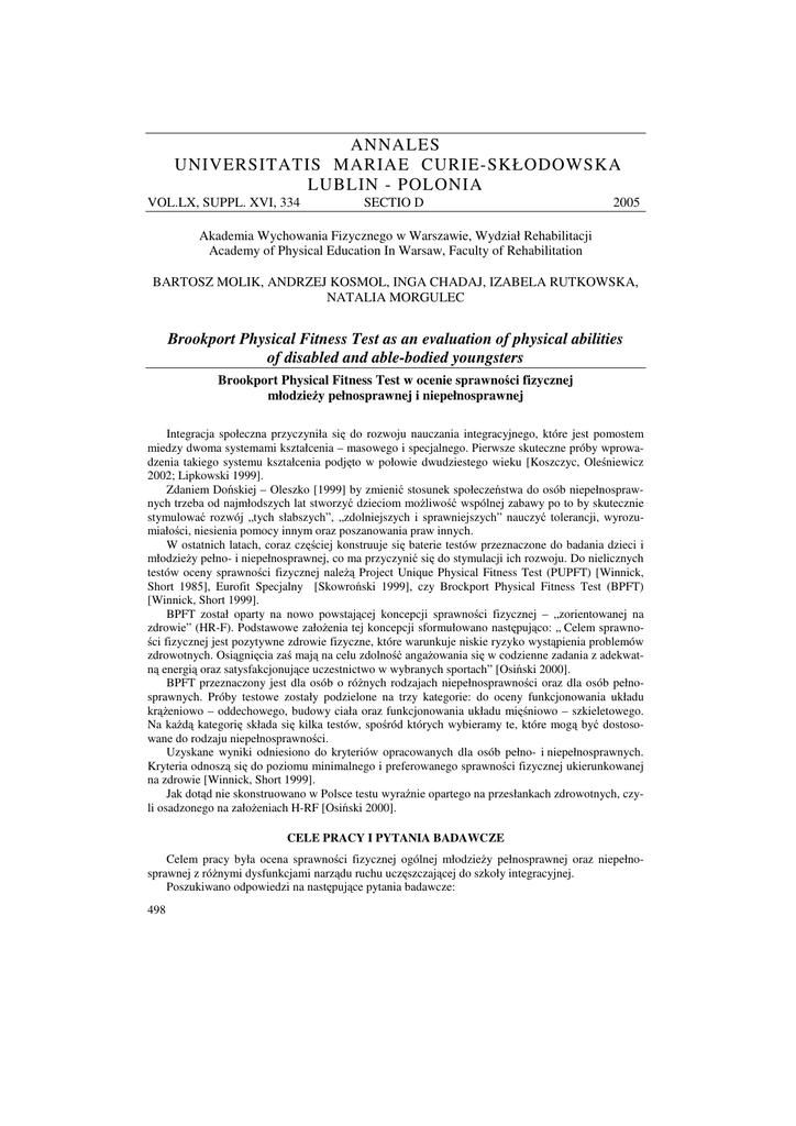 ANNALES UNIVERSITATIS MARIAE CURIE-SKŁODOWSKA LUBLIN - POLONIA VOL.LX, SUPPL. XVI, 334 SECTIO D 2005 Akademia Wychowania Fizycznego w Warszawie, Wydział Rehabilitacji Academy of Physical Education In Warsaw, Faculty of Rehabilitation BARTOSZ MOLIK, ANDRZEJ KOSMOL, INGA CHADAJ, IZABELA RUTKOWSKA, NATALIA MORGULEC Brookport Physical Fitness Test as an evaluation of physical abilities of disabled and able-bodied youngsters Brookport Physical Fitness Test w ocenie sprawności fizycznej młodzieży pełnosprawnej i niepełnosprawnej Integracja społeczna przyczyniła się do rozwoju nauczania integracyjnego, które jest pomostem miedzy dwoma systemami kształcenia – masowego i specjalnego. Pierwsze skuteczne próby wprowadzenia takiego systemu kształcenia podjęto w połowie dwudziestego wieku [Koszczyc, Oleśniewicz 2002; Lipkowski 1999]. Zdaniem Dońskiej – Oleszko [1999] by zmienić stosunek społeczeństwa do osób niepełnosprawnych trzeba od najmłodszych lat stworzyć dzieciom możliwość wspólnej zabawy po to by skutecznie stymulować rozwój „tych słabszych”, „zdolniejszych i sprawniejszych” nauczyć tolerancji, wyrozumiałości, niesienia pomocy innym oraz poszanowania praw innych. W ostatnich latach, coraz częściej konstruuje się baterie testów przeznaczone do badania dzieci i młodzieży pełno- i niepełnosprawnej, co ma przyczynić się do stymulacji ich rozwoju. Do nielicznych testów oceny sprawności fizycznej należą Project Unique Physical Fitness Test (PUPFT) [Winnick, Short 1985], Eurofit Specjalny [Skowroński 1999], czy Brockport Physical Fitness Test (BPFT) [Winnick, Short 1999]. BPFT został oparty na nowo powstającej koncepcji sprawności fizycznej – „zorientowanej na zdrowie” (HR-F). Podstawowe założenia tej koncepcji sformułowano następująco: „ Celem sprawności fizycznej jest pozytywne zdrowie fizyczne, które warunkuje niskie ryzyko wystąpienia problemów zdrowotnych. Osiągnięcia zaś mają na celu zdolność angażowania się w codzienne zadania z adekwatną energią oraz satysfakcjonujące uczestnictwo w wybranych sportach” [Osiński 2000]. BPFT przeznaczony jest dla osób o różnych rodzajach niepełnosprawności oraz dla osób pełnosprawnych. Próby testowe zostały podzielone na trzy kategorie: do oceny funkcjonowania układu krążeniowo – oddechowego, budowy ciała oraz funkcjonowania układu mięśniowo – szkieletowego. Na każdą kategorię składa się kilka testów, spośród których wybieramy te, które mogą być dostosowane do rodzaju niepełnosprawności. Uzyskane wyniki odniesiono do kryteriów opracowanych dla osób pełno- i niepełnosprawnych. Kryteria odnoszą się do poziomu minimalnego i preferowanego sprawności fizycznej ukierunkowanej na zdrowie [Winnick, Short 1999]. Jak dotąd nie skonstruowano w Polsce testu wyraźnie opartego na przesłankach zdrowotnych, czyli osadzonego na założeniach H-RF [Osiński 2000]. CELE PRACY I PYTANIA BADAWCZE Celem pracy była ocena sprawności fizycznej ogólnej młodzieży pełnosprawnej oraz niepełnosprawnej z różnymi dysfunkcjami narządu ruchu uczęszczającej do szkoły integracyjnej. Poszukiwano odpowiedzi na następujące pytania badawcze: 498 Jaki poziom sprawności fizycznej ogólnej reprezentuje młodzież niepełno- i pełnosprawna? Czy istnieją różnice w sprawności fizycznej ogólnej pomiędzy młodzieżą pełnosprawną uprawiającą sport, a młodzieżą pełnosprawną tzw. nieaktywną ruchowo, a także młodzieżą niepełnosprawną uprawiającą sport, a młodzieżą niepełnosprawną tzw. nieaktywną ruchowo? MATERIAŁ BADAWCZY Badaniom poddano 81 uczniów w tym 21 dzieci niepełnosprawnych, klas V–VI szkoły podstawowej oraz klasy I gimnazjum (tab. 1). Badanych podzielono na cztery grupy: dzieci niepełnosprawne „aktywne”, dzieci niepełnosprawne „nieaktywne”, dzieci pełnosprawne „aktywne”, dzieci pełnosprawne „nieaktywne”. Wśród niepełnosprawnych były osoby z porażeniami mózgowymi (12), uszkodzeniami rdzenia kręgowego (5) oraz wadami wrodzonymi (4). Tabela 1. Ogólna charakterystyka badanych grup Grupa N Niepełnosprawni aktywni Niepełnosprawni nieaktywni Pełnosprawni aktywni Pełnosprawni nieaktywni 10 10 24 7 Niepełnosprawni aktywni Niepełnosprawni nieaktywni Pełnosprawni aktywni Pełnosprawni nieaktywni 0 1 21 8 Średnia wieku [lata] Dziewczęta 13,4 13,8 12,75 13 Chłopcy 0 12 12,81 12,25 SD MIN MAX 1,35 1,48 0,79 0,82 12 12 12 12 15 16 14 14 0 0,75 0,71 0 12 12 12 0 12 14 14 W ramach zajęć szkolnych dzieci pełnosprawne uczęszczały na zajęcia wychowania fizycznego. Uczniowie niepełnosprawni dodatkowo brali udział w zajęciach rehabilitacyjnych. Osoby ze znacznym stopniem niepełnosprawności uczęszczały wyłącznie na zajęcia rehabilitacyjne. METODA BADAŃ Do oceny sprawności fizycznej zastosowano baterię testów Brookport Physical Fitness Test [Winnick, Short 1999]. Zastosowano następujące próby: 1. Próba marszowo-biegowa na 20m, 2. Pomiar wskaźnika masy ciała (BMI), 3. Wyprost stawów łokciowych w siadzie płaskim, 4. Wypychanie kuli, 5. Zwis z wyprostowanymi kończynami górnymi, 6. Zwis ze zgiętymi kończynami górnymi, 7. Siła chwytu ręki, 8. Zmodyfikowane podciąganie na drążku, 9. Skłony w przód z leżenia tyłem. Wyniki poszczególnych prób odniesiono do przygotowanych dla tego testu kryteriów [Winnick, Short 1999]. Kryteria zostały skonstruowane na bazie badań przeprowadzonych w USA. W przypadku zwisu z wyprostowanymi kończynami górnymi, zwisu ze zgiętymi kończynami górnymi i zmodyfikowanego podciągania przyjęto normy dla populacji pełnosprawnej dla wszystkich grup badawczych (w przypadku osób niepełnosprawnych, dysfunkcja dotyczyła głownie kończyn dolnych). Dodatkowo dokonano badań ankietowych, mających na celu ocenę zajęć wychowania fizycznego i rehabilitacji. WYNIKI BADAŃ Analiza sprawności fizycznej ogólnej wykazała różnice pom