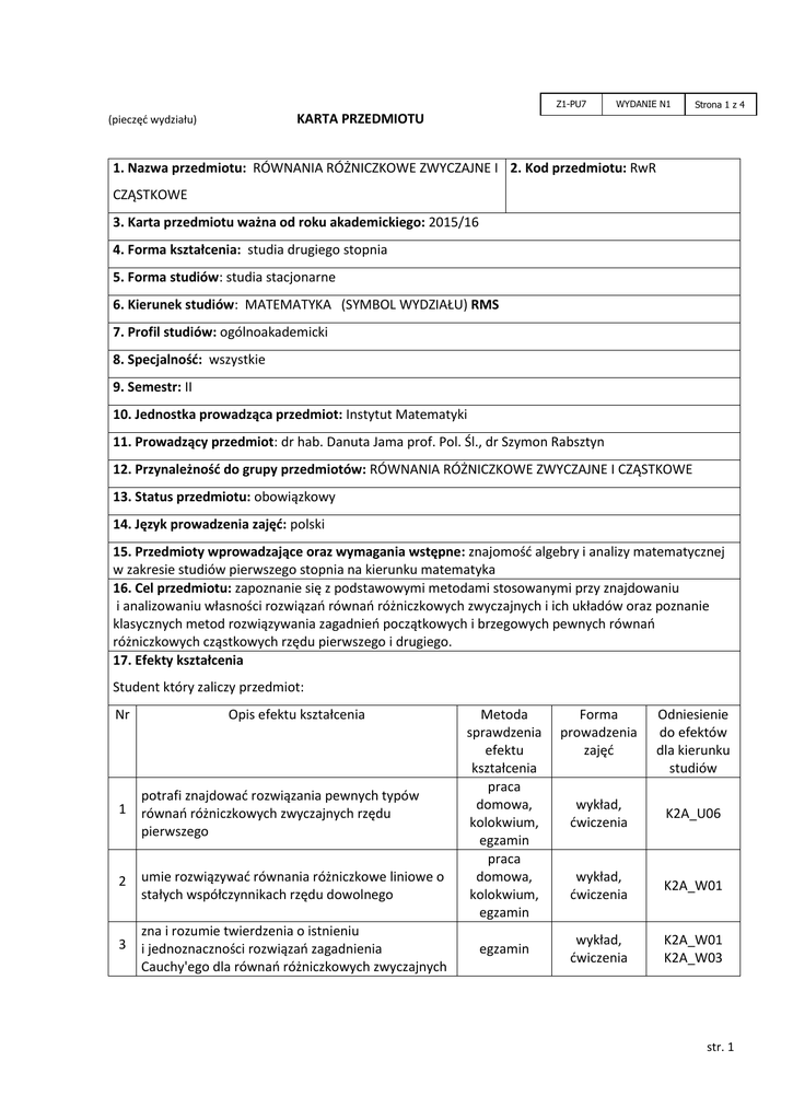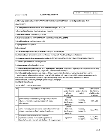 Z1-PU7 WYDANIE N1 Strona 1 z 4 KARTA PRZEDMIOTU (pieczęć wydziału) 1. Nazwa przedmiotu: RÓWNANIA RÓŻNICZKOWE ZWYCZAJNE I 2. Kod przedmiotu: RwR CZĄSTKOWE 3. Karta przedmiotu ważna od roku akademickiego: 2015/16 4. Forma kształcenia: studia drugiego stopnia 5. Forma studiów: studia stacjonarne 6. Kierunek studiów: MATEMATYKA (SYMBOL WYDZIAŁU) RMS 7. Profil studiów: ogólnoakademicki 8. Specjalność: wszystkie 9. Semestr: II 10. Jednostka prowadząca przedmiot: Instytut Matematyki 11. Prowadzący przedmiot: dr hab. Danuta Jama prof. Pol. Śl., dr Szymon Rabsztyn 12. Przynależność do grupy przedmiotów: RÓWNANIA RÓŻNICZKOWE ZWYCZAJNE I CZĄSTKOWE 13. Status przedmiotu: obowiązkowy 14. Język prowadzenia zajęć: polski 15. Przedmioty wprowadzające oraz wymagania wstępne: znajomość algebry i analizy matematycznej w zakresie studiów pierwszego stopnia na kierunku matematyka 16. Cel przedmiotu: zapoznanie się z podstawowymi metodami stosowanymi przy znajdowaniu i analizowaniu własności rozwiązań równań różniczkowych zwyczajnych i ich układów oraz poznanie klasycznych metod rozwiązywania zagadnień początkowych i brzegowych pewnych równań różniczkowych cząstkowych rzędu pierwszego i drugiego. 17. Efekty kształcenia Student który zaliczy przedmiot: Nr Opis efektu kształcenia 1 potrafi znajdować rozwiązania pewnych typów równań różniczkowych zwyczajnych rzędu pierwszego 2 umie rozwiązywać równania różniczkowe liniowe o stałych współczynnikach rzędu dowolnego 3 zna i rozumie twierdzenia o istnieniu i jednoznaczności rozwiązań zagadnienia Cauchy'ego dla równań różniczkowych zwyczajnych Metoda sprawdzenia efektu kształcenia praca domowa, kolokwium, egzamin praca domowa, kolokwium, egzamin egzamin Forma prowadzenia zajęć Odniesienie do efektów dla kierunku studiów wykład, ćwiczenia K2A_U06 wykład, ćwiczenia K2A_W01 wykład, ćwiczenia K2A_W01 K2A_W03 str. 1 4 zna różne zagadnienia, których rozwiązanie wymaga analizowania równań różniczkowych i potrafi otrzymać takie równania w pewnych prostych przypadkach 5 orientuje się w metodzie rozwiązywania równań różniczkowych liniowych rzędu drugiego za pomocą szeregów potęgowych kolokwium, egzamin praca domowa, kolokwium, egzamin kolokwium, egzamin potrafi rozwiązywać proste równania różniczkowe cząstkowe rzędu pierwszego rozpoznaje typy równań różniczkowych kolokwium, 7 cząstkowych rzędu drugiego i wie jak je sprowadzić egzamin do postaci kanonicznej zna i umie stosować metodę Fouriera do kolokwium, 8 rozwiązywania typowych zagadnień początkowo brzegowych dla klasycznych równań fizyki egzamin matematycznej 18. Formy zajęć dydaktycznych i ich wymiar (liczba godzin) 6 Wykład Ćwiczenia 30 h 30 h Laboratorium Projekt wykład, ćwiczenia K2A_U16 wykład, ćwiczenia K2A_U06 wykład, ćwiczenia K2A_U06 wykład, ćwiczenia K2A_U17 wykład, ćwiczenia K2A_U06 K2A_U17 Seminarium 19. Treści kształcenia: Wykład Przykłady zagadnień prowadzących do równań różniczkowych zwyczajnych i cząstkowych. Równania różniczkowe zwyczajne w postaci normalnej. Twierdzenia o istnieniu i jednoznaczności rozwiązań zagadnienia Cauchy'ego dla równań różniczkowych zwyczajnych. Rozwiązywanie pewnych równań rzędu pierwszego za pomocą kwadratur. Równania różniczkowe liniowe rzędu n-tego o stałych współczynnikach - metoda przewidywań i uzmienniania stałych. Układy równań liniowych rzędu pierwszego o stałych współczynnikach. Rozwiązywanie równań różniczkowych liniowych rzędu drugiego za pomocą szeregów potęgowych - pewne funkcje specjalne. Informacja o problemach stabilności rozwiązań równań. Całki pierwsze i równania różniczkowe cząstkowe rzędu pierwszego. Równania różniczkowe cząstkowe rzędu drugiego dla funkcji dwu zmiennych - klasyfikacja, postać kanoniczna, równania typu hiperbolicznego, eliptycznego i parabolicznego. Problemy początkowe i początkowobrzegowe dla klasycznych równań fizyki matematycznej - metoda Fouriera rozdzielenia zmiennych. Informacja o rozwiązaniach uogólnionych. Ćwiczenia Studenci rozwiązują (samodzielnie lub z pomocą prowadzącego) zadania związane z treścią wykładu. 20. Egzamin: tak str. 2 21. Literatura podstawowa: 1. J. Muszyński, A. D. Myszkis, Równania różniczkowe zwyczajne, PWN, Warszawa 1984, 2. J. Ombach, Wykłady z równań różniczkowych, WUJ, Kraków 1996, 3. H. Marcinkowska, Wstęp do teorii równań różniczkowych cząstkowych, PWN, Warszawa 1986, 4. L. C. Evans, Równania różniczkowe cząstkowe, PWN, Warszawa 2002, 5. M. Gewert, Z. Skoczylas, Równania różniczkowe zwyczajne. Teoria, przykłady, zadania, GiS Wrocław 2002, 6. N. M. Matwiejew, Metody całkowania równań różniczkowych zwyczajnych, PWN, Warszawa 1982. 22. Literatura uzupełniająca: 1. G. Birkhoff, G. Rota, Ordinary differential equations, John Wiley & Sons, New York 1989, 2. H. F. Weinberger, A first course in partial differential equations, John Wiley & Sons, New York 1965, 3. H. Marcinkowska, Dystrybucje, przestrzenie Sobolewa, równania różniczkowe, PWN, Warszawa 1993, 4. Z. Szmydt, Fourier transformation and linear differential equation, PWN, Warszawa 1977. 23. Nakład pracy studenta potrzebny do osiągnięcia efektów kształcenia Lp. Forma zajęć Liczba godzin kontaktowych / pracy studenta 30 / 25 1 Wykład 2 Ćwiczenia 3 Laboratorium / 4 Projekt / 5 Seminarium / 6 Inne: konsultacje i egzaminy Suma godzin 30 / 60 5/ 65 / 85 24. Suma wszystkich godzin 150 25. Liczba punktów ECTS 5 26. Liczba punktów ECTS uzyskanych na zajęciach z bezpośrednim udziałem nauczyciela akademickiego 5 27. Liczba punktów ECTS uzyskanych na zajęciach o charakterze praktycznym (laboratoria, projekty) str. 3 28. Uwagi: Zasady oceniania: Dwa kolokwia: 2x24 pkt. Praca domowa: 12 pkt. Egzamin: 40 pkt. Do zaliczenia niezbędne jest osiągnięcie łącznie 41 pkt., w tym co najmniej 30% punk