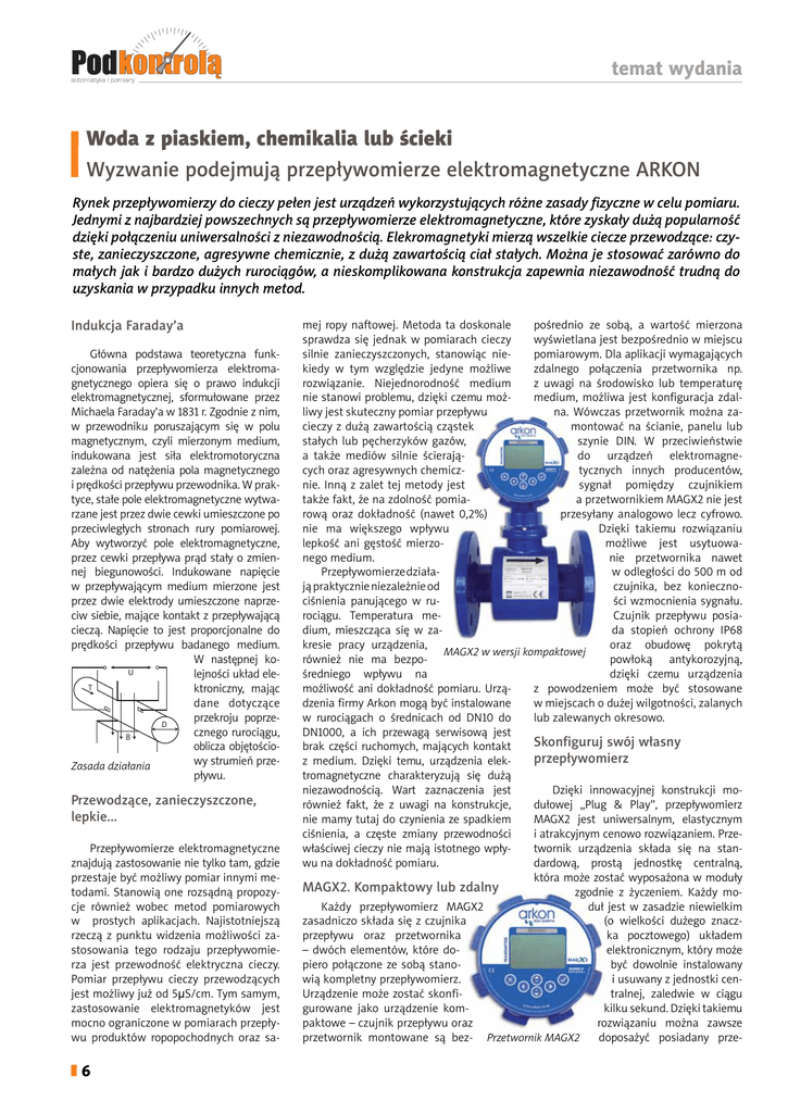 temat wydania Woda z piaskiem, chemikalia lub ścieki Wyzwanie podejmują przepływomierze elektromagnetyczne ARKON Rynek przepływomierzy do cieczy pełen jest urządzeń wykorzystujących różne zasady fizyczne w celu pomiaru. Jednymi z najbardziej powszechnych są przepływomierze elektromagnetyczne, które zyskały dużą popularność dzięki połączeniu uniwersalności z niezawodnością. Elekromagnetyki mierzą wszelkie ciecze przewodzące: czyste, zanieczyszczone, agresywne chemicznie, z dużą zawartością ciał stałych. Można je stosować zarówno do małych jak i bardzo dużych rurociągów, a nieskomplikowana konstrukcja zapewnia niezawodność trudną do uzyskania w przypadku innych metod. Indukcja Faraday’a Główna podstawa teoretyczna funkcjonowania przepływomierza elektromagnetycznego opiera się o prawo indukcji elektromagnetycznej, sformułowane przez Michaela Faraday’a w 1831 r. Zgodnie z nim, w przewodniku poruszającym się w polu magnetycznym, czyli mierzonym medium, indukowana jest siła elektromotoryczna zależna od natężenia pola magnetycznego i prędkości przepływu przewodnika. W praktyce, stałe pole elektromagnetyczne wytwarzane jest przez dwie cewki umieszczone po przeciwległych stronach rury pomiarowej. Aby wytworzyć pole elektromagnetyczne, przez cewki przepływa prąd stały o zmiennej biegunowości. Indukowane napięcie w przepływającym medium mierzone jest przez dwie elektrody umieszczone naprzeciw siebie, mające kontakt z przepływającą cieczą. Napięcie to jest proporcjonalne do prędkości przepływu badanego medium. W następnej koU lejności układ eleT ktroniczny, mając dane dotyczące przekroju poprzeD cznego rurociągu, B oblicza objętościowy strumień przeZasada działania pływu. Przewodzące, zanieczyszczone, lepkie... Przepływomierze elektromagnetyczne znajdują zastosowanie nie tylko tam, gdzie przestaje być możliwy pomiar innymi metodami. Stanowią one rozsądną propozycje również wobec metod pomiarowych w prostych aplikacjach. Najistotniejszą rzeczą z punktu widzenia możliwości zastosowania tego rodzaju przepływomierza jest przewodność elektryczna cieczy. Pomiar przepływu cieczy przewodzących jest możliwy już od 5μS/cm. Tym samym, zastosowanie elektromagnetyków jest mocno ograniczone w pomiarach przepływu produktów ropopochodnych oraz sa- 6 mej ropy naftowej. Metoda ta doskonale pośrednio ze sobą, a wartość mierzona sprawdza się jednak w pomiarach cieczy wyświetlana jest bezpośrednio w miejscu silnie zanieczyszczonych, stanowiąc niepomiarowym. Dla aplikacji wymagających kiedy w tym względzie jedyne możliwe zdalnego połączenia przetwornika np. rozwiązanie. Niejednorodność medium z uwagi na środowisko lub temperaturę nie stanowi problemu, dzięki czemu możmedium, możliwa jest konfiguracja zdalliwy jest skuteczny pomiar przepływu Wówczas przetwornik można zaepływu na. Wów cieczy z dużą zawartością cząstek montować na ścianie, panelu lub stek mont stałych lub pęcherzyków gazów, szynie DIN. W przeciwieństwie ów, szyn a także mediów silnie ścierająjądo urządzeń elektromagnecych oraz agresywnych chemicztycznych innych producentów, cztycz nie. Inną z zalet tej metody jest sygnał pomiędzy czujnikiem est sygn także fakt, że na zdolność pomiaprzetwornikiem MAGX2 nie jest miaa prz rową oraz dokładność (nawett 0,2%) przesyłany analogowo lecz cyfrowo. przesyła nie ma większego wpływu Dzięki takiemu rozwiązaniu lepkość ani gęstość mierzomożliwe jest usytuowanego medium. nie przetwornika nawet Przepływomierze działaw odległości do 500 m od ją praktycznie niezależnie od czujnika, bez koniecznociśnienia panującego w ruści wzmocnienia sygnału. rociągu. Temperatura meCzujnik przepływu posiadium, mieszcząca się w zada stopień ochrony IP68 kresie pracy urządzenia, oraz obudowę pokrytą MAGX2 w wersji kompaktowej również nie ma bezpopowłoką antykorozyjną, średniego wpływu na dzięki czemu urządzenia możliwość ani dokładność pomiaru. Urząz powodzeniem może być stosowane dzenia firmy Arkon mogą być instalowane w miejscach o dużej wilgotności, zalanych w rurociągach o średnicach od DN10 do lub zalewanych okresowo. DN1000, a ich przewagą serwisową jest Skonfiguruj swój własny brak części ruchomych, mających kontakt przepływomierz z medium. Dzięki temu, urządzenia elektromagnetyczne charakteryzują się dużą niezawodnością. Wart zaznaczenia jest Dzięki innowacyjnej konstrukcji morównież fakt, że z uwagi na konstrukcje, dułowej „Plug & Play”, przepływomierz nie mamy tutaj do czynienia ze spadkiem MAGX2 jest uniwersalnym, elastycznym ciśnienia, a częste zmiany przewodności i atrakcyjnym cenowo rozwiązaniem. Przewłaściwej cieczy nie mają istotnego wpłytwornik urządzenia składa się na stanwu na dokładność pomiaru. dardową, prostą jednostkę centralną, która może zostać wyposażona w moduły MAGX2. Kompaktowy lub zdalnyy zgodnie z życzeniem. Każdy moduł je jest w zasadzie niewielkim Każdy przepływomierz MAGX2 GX2 (o wielkości dużego znaczzasadniczo składa się z czujnika a ka przepływu oraz przetwornika k pocztowego) układem elektronicznym, który może – dwóch elementów, które doe być piero połączone ze sobą stanob dowolnie instalowany i usuwany z jednostki cenwią kompletny przepływomierz. tralnej, zaledwie w ciągu Urządzenie może zostać skonfit kilku gurowane jako urządzenie kom-ki sekund. Dzięki takiemu rozwiązaniu można zawsze paktowe – czujnik przepływu oraz az rozw doposażyć posiadany przeprzetwornik montowane są bezz- Przetwornik MAGX2 dop temat wydania pływomierz o kolejne moduły komunikacji, dostosowując układ do zmieniających się wymogów systemowych. Wyjątkowe opcje komunikacji Materiał zwilżany Guma twarda (Hard rubber) Guma miękka Rodzaj Temperatura medium medium woda pitna 0 ÷ 70°C oraz ścieki woda z cząsteczkami 