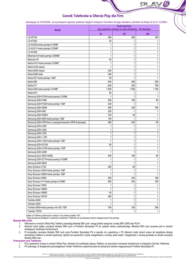 Cennik Telefonów w Ofercie Play dla Firm obowiązuje od 19.09.2008 r. do wyczerpania zapasów zestawów objętych niniejszym Cennikiem lub jego odwołania, jednakże nie dłużej niż do 31.12.2008 r. Model PLAY dla Firm przy zawarciu umowy na czas określony – 24 miesiące 50 LG KF750 LG KT520 LG KU250+karta pamięci 512MB* LG KU311+karta pamięci 512MB* LG KU385 Motorola K3+karta pamięci 256MB* Motorola V9 Nokia 6151+karta pamięci 512MB* Nokia 6120 classic Nokia 6500 classic Nokia 6500 slide Nokia E51+karta pamięci 1GB* Nokia E66 Nokia E71 Nokia E90+karta pamięci 512MB* Nokia N73 Samsung SGH-F330+karta pamięci 512MB Samsung SGH-F480 Samsung SGH-F500+karta pamięci 1GB* Samsung SGH-G800 Samsung SGH-i450 Samsung SGH-i550W Samsung SGH-i600+karta pamięci 1GB* Samsung SGH-i780 Navi (z oprogramowaniem GPS Automapa) Samsung SHG-J200 Samsung SGH-J400 Samsung SGH-J750 Samsung SGH- L700 Samsung SGH-L760+karta pamięci 1GB* Samsung SGH-S7330 Samsung SGH-U700+karta pamięci 1GB* Samsung SGH-U800 Samsung Soul (SGH-U900) Samsung SGH-Z170+karta pamięci 512MB* Samsung SGH-Z630 Sony Ericsson C702 Sony Ericsson K530i+karta pamięci 1GB* Sony Ericsson K800i+karta pamięci 1GB* Sony Ericsson K850i Sony Ericsson P1i+karta pamięci 512MB* Sony Ericsson T650i Sony Ericsson W660i Sony Ericsson W880i Sony Ericsson W910i Toshiba G450 Toshiba G500 Toshiba G900+karta pamięci mini SD 1GB* Toshiba TS705 125 599 49 1 1 1 1 49 1 1 249 249 99 649 649 1 599 99 1 399 329 599 229 329 149 499 1 1 1 1 1 99 1 1 499 1 1 299 1 1 599 909 1 1 49 499 1 1 799 1 300 499 1 1 1 1 1 1 1 1 1 1 1 399 229 1 399 1 1 159 1 329 1 39 1 249 1 1 1 1 1 1 1 1 169 1 1 99 1 1 329 459 1 1 1 1 1 1 329 1 199 1 1 1 1 1 1 1 1 1 1 1 299 199 1 199 1 1 99 1 199 1 1 1 99 1 1 1 1 1 1 1 1 99 1 1 1 1 1 199 199 1 1 1 1 1 1 299 1 Opłata za Telefony podana jest w złotych i nie zawiera podatku VAT. * Karty pamięci są dostępne w wybranych zestawach Telefonów do wyczerpania stanów magazynowych kart pamięci. Blokada SIM LOCK: 1. Oferowane w ramach Oferty Play Telefony posiadają blokadę SIM Lock i mogą działać wyłącznie z kartą SIM/ USIM sieci PLAY. 2. Abonent może żądać usunięcia blokady SIM Lock w Punktach Sprzedaży P4 po upływie okresu zastrzeżonego. Blokada SIM Lock usuwana jest w ramach istniejących możliwości technicznych. 3. W przypadku usunięcia blokady SIM Lock poza Punktem Sprzedaży P4 w sposób nie uzgodniony z P4 Abonent może stracić prawo do bezpłatnej obsługi serwisowej Telefonu w ramach gwarancji, rękojmi lub uprawnień z tytułu niezgodności z umową, jeżeli wada / niezgodność z umową powstała na skutek usunięcia blokady SIM Lock. Promocyjne ceny Telefonów: 1. Przy zawieraniu Umowy w ramach Oferty Play, Abonent ma możliwość zakupu Telefonu na warunkach cenowych określonych w niniejszym Cenniku Telefonów. 2. P4 zastrzega, iż dostępność poszczególnych modeli Telefonów uzależniona jest od aktualnych stanów magazynowych Punktów Sprzedaży P4. P4 sp. z o.o. z siedzibą i adresem w Warszawie, ul. Taśmowa 7, 02-677 Warszawa wpisana do rejestru przedsiębiorców Krajowego Rejestru Sądowego pod numerem KRS 0000217207, prowadzonego przez Sąd Rejonowy dla miasta stołecznego Warszawy, XIII Wydział Gospodarczy Krajowego Rejestru Sądowego, NIP 951-21-20-077, REGON 015808609, której kapitał zakładowy wynosi: 30 608 500,00 złotych. Niniejszy dokument zawiera informacje stanowiące tajemnicę przedsiębiorstwa Grupy P4, których rozpowszechnianie w jakiejkolwiek formie bez pisemnej zgody właściciela jest zabronione do momentu ich oficjalnej publikacji. Osoba która weszła w posiadanie tego dokumentu przez przypadek lub pomyłkę proszona jest o niezwłoczne powiadomienie P4 sp. z o.o. tel. 0 790 500 500