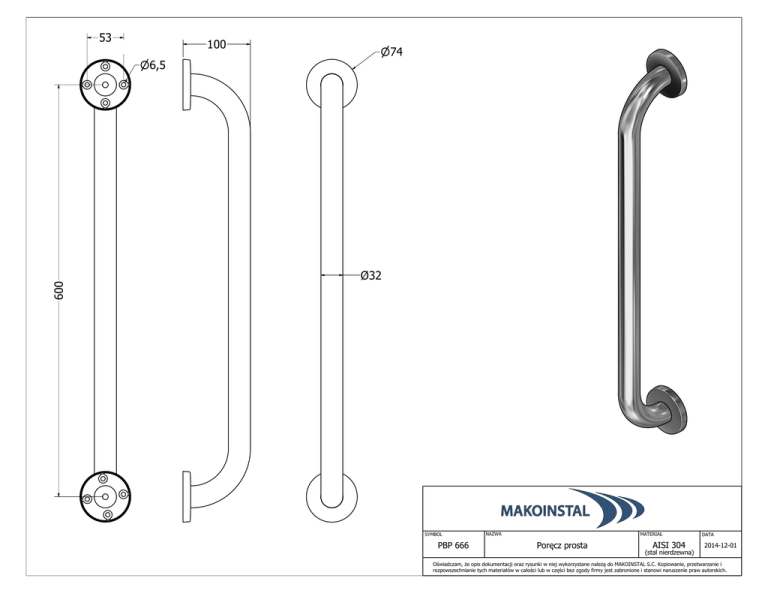 53 100 74 600 6,5 32 SYMBOL PBP 666 NAZWA MATERIA Por cz prosta AISI 304 DATA 2014-12-01 (stal nierdzewna) O wiadczam, e opis dokumentacji oraz rysunki w niej wykorzystane nale do MAKOINSTAL S.C. Kopiowanie, przetwarzanie i rozpowszechnianie tych materia w w ca o ci lub w cz ci bez zgody firmy jest zabronione i stanowi naruszenie praw autorskich.
