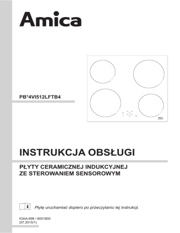 PB*4VI512LFTB4 INSTRUKCJA OBSŁUGI PŁYTY CERAMICZNEJ INDUKCYJNEJ ZE STEROWANIEM SENSOROWYM Płytę uruchamiać dopiero po przeczytaniu tej instrukcji. IOAA-696 / 8051800 (07.2015/1) SZANOWNY KLIENCIE, Płyta Amica to połączenie wyjątkowej łatwości obsługi i doskonałej efektywności. Po przeczytaniu instrukcji, obsługa płyty nie będzie problemem. Płyta, która opuściła fabrykę była dokładnie sprawdzona przed zapakowaniem pod względem bezpieczeństwa i funkcjonalności na stanowiskach kontrolnych. Prosimy Państwa o uważną lekturę instrukcji obsługi przed uruchomieniem urządzenia. Przestrzeganie zawartych w niej wskazówek uchroni Państwa przed niewłaściwym użytkowaniem. Instrukcję należy zachować i przechowywać tak, aby mieć ją zawsze pod ręką. Należy dokładnie przestrzegać instrukcji obsługi w celu uniknięcia nieszczęśliwych wypadków. Uwaga! Urządzenie obsługiwać tylko po przeczytaniu niniejszej instrukcji. Urządzenie zostało zaprojektowane wyłącznie jako urządzenie do gotowania.Każde inne jego zastosowanie (np. do ogrzewania pomieszczeń) jest niezgodne z jego przeznaczeniem i może być niebezpieczne. Producent zastrzega sobie możliwość dokonywania zmian nie wpływających na działanie urządzenia. Oświadczenie producenta Producent deklaruje niniejszym, że wyrób ten spełnia zasadnicze wymagania wymienionych poniżej dyrektyw europejskich: • dyrektywy niskonapięciowej 2006/95/WE, • dyrektywy kompatybilności elektromagnetycznej 2004/108/WE, • dyrektywy ekoprojektowania 2009/125/WE, i dlatego wyrób został oznakowany oraz została wystawiona dla niego deklaracja zgodności udostępniana organom nadzorującym rynek. Masz wątpliwości? Nie wszystko, co przeczytałeś w instrukcji jest zrozumiałe zadzwoń do Centrum Serwisowego, gdzie uzyskasz wszechstronną pomoc. tel. 801 801 800 2 SPIS TREŚCI Podstawowe informacje.........................................................................................2 Wskazówki dotyczące bezpieczeństwa użytkowania..............................................4 Opis wyrobu............................................................................................................9 Instalacja..................................................................................................................10 Obsługa..................................................................................................................13 Czyszczenie i konserwacja...................................................................................24 Postępowanie w sytuacjach awaryjnych............................................................26 Dane techniczne....................................................................................................28 Gwarancja, obsługa posprzedażna.....................................................................29 3 WSKAZÓWKI DOTYCZĄCE BEZPIECZEŃSTWA UŻYTKOWANIA Uwaga.Urządzenie i jego dostępne części stają się gorące podczas użycia. Możliwość dotknięcia elementów grzejnych powinno być objęte szczególną troską. Dzieci poniżej 8 roku życia powinny trzymać się z daleka, chyba że są pod stałą opieką. Niniejszy sprzęt może być używany przez dzieci w wieku od 8 lat i wyżej i osoby z ograniczeniami fizycznymi, czuciowymi albo umysłowymi albo brakiem doświadczenia i wiedzy, jeśli odbywa się pod nadzorem lub zgodnie z instrukcją użytkowania sprzętu, przekazanej przez osoby odpowiadające za ich bezpieczeństwo. Należy zwracać uwagę na dzieci, aby nie bawiły się sprzętem. Sprzątanie i czynności obsługowe nie powinny być robione przez dzieci bez nadzoru. Uwaga. Gotowanie bez nadzoru tłuszczu lub oleju na płycie kuchennej może być niebezpieczne i doprowadzić do pożaru. NIGDY nie próbuj gasić ognia wodą, ale wyłącz urządzenie i wtedy przykryj płomień np. pokrywką lub niepalnym kocem. Uwaga. Niebezpieczeństwo pożaru: nie gromadź rzeczy na powierzchni do gotowania. 4 WSKAZÓWKI DOTYCZĄCE BEZPIECZEŃSTWA UŻYTKOWANIA Uwaga. Jeżeli powierzchnia płyty jest pęknięta, wyłączyć prąd, aby uniknąć porażenia prądem elektrycznym. Przedmiotów metalowych, takich jak noże, widelce, łyżki i pokrywki oraz folii aluminiowej nie zaleca się kłaść na powierzchni płyty kuchennej, gdyż mogą się one stać gorące. Po użyciu wyłącz element grzejny płyty wyłącznikiem i nie polegaj na wskazaniach detektora naczyń. Urządzeniem nie należy sterować zewnętrznym zegarem lub niezależnym układem zdalnego sterowania. Do czyszczenia płyty nie wolno używać sprzętu do czyszczenia parą. 5 WSKAZÓWKI DOTYCZĄCE BEZPIECZEŃSTWA UŻYTKOWANIA • Przed pierwszym użyciem ceramicznej płyty grzejnej należy przeczytać instrukcję użytkowa nia. W ten sposób zapewniamy sobie bezpieczeństwo oraz unikamy uszkodzenia płyty. • Jeżeli płyta ceramiczna użytkowana jest w bezpośredniej bliskości radia, telewizora lub innego urządzenia emitującego, należy sprawdzić, czy zapewniona jest prawidłowość działania panelu sterującego płytą ceramiczną. • Nie wolno instalować płyty w pobliżu urządzeń chłodniczych. • Meble w których zabudowywana jest płyta, muszą być odporne na temperatury ok 100oC.Do tyczy to oklein,krawędzi,powierzchni wykonanych z tworzyw sztucznych, klejów oraz lakierów. • Płytę należy użytkować tylko po jej zabudowaniu. W ten sposób zabezpieczamy się przed dotknięciem części pozostających pod napięciem. • Naprawy urządzeń elektrycznych mogą przeprowadzać tylko specjaliści. Niefachowe naprawy powodują poważne niebezpieczeństwo dla użytkownika. • Uwaga! Jeżeli przewód zasilający nieodłączalny ulegnie uszkodzeniu, to powinien on być wymieniony u wytwórcy lub w specjalistycznym zakładzie naprawczym albo przez wykwalifikowaną osobę w celu uniknięcia zagrożenia. • Urządzenie zostaje tylko wówczas odłączone