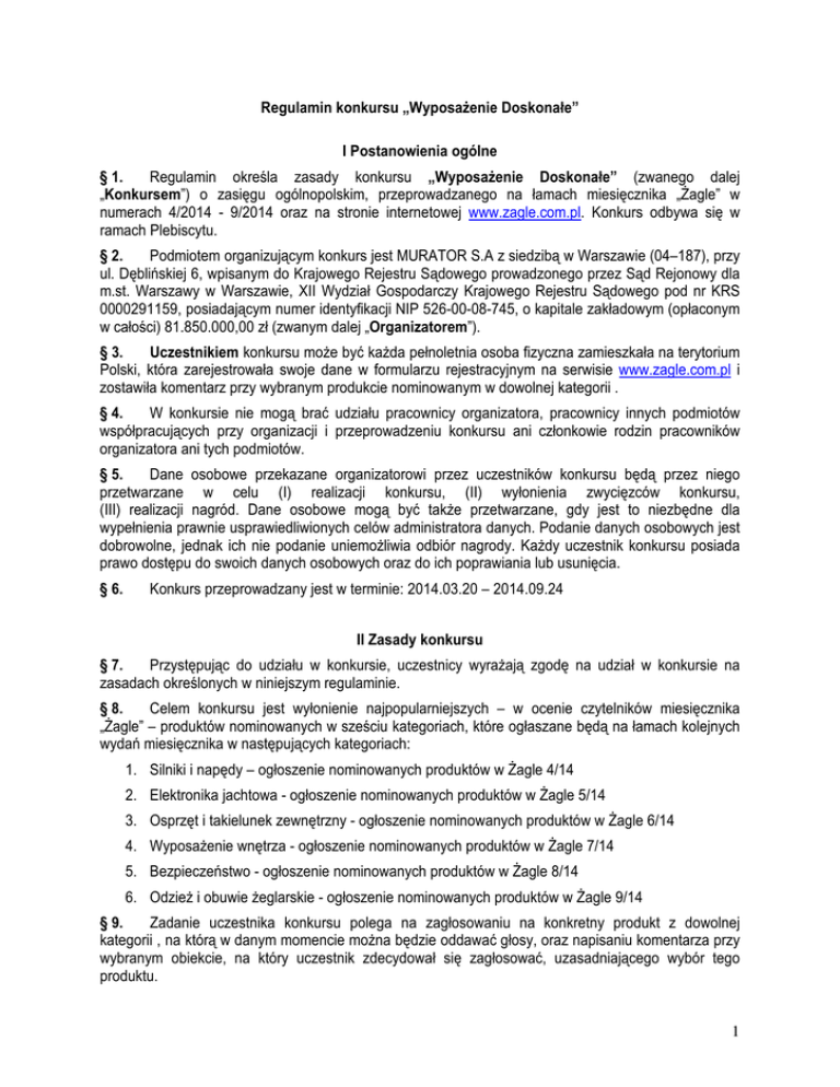 Regulamin konkursu „Wyposażenie Doskonałe” I Postanowienia ogólne § 1. Regulamin określa zasady konkursu „Wyposażenie Doskonałe” (zwanego dalej „Konkursem”) o zasięgu ogólnopolskim, przeprowadzanego na łamach miesięcznika „Żagle” w numerach 4/2014 - 9/2014 oraz na stronie internetowej www.zagle.com.pl. Konkurs odbywa się w ramach Plebiscytu. § 2. Podmiotem organizującym konkurs jest MURATOR S.A z siedzibą w Warszawie (04–187), przy ul. Dęblińskiej 6, wpisanym do Krajowego Rejestru Sądowego prowadzonego przez Sąd Rejonowy dla m.st. Warszawy w Warszawie, XII Wydział Gospodarczy Krajowego Rejestru Sądowego pod nr KRS 0000291159, posiadającym numer identyfikacji NIP 526-00-08-745, o kapitale zakładowym (opłaconym w całości) 81.850.000,00 zł (zwanym dalej „Organizatorem”). § 3. Uczestnikiem konkursu może być każda pełnoletnia osoba fizyczna zamieszkała na terytorium Polski, która zarejestrowała swoje dane w formularzu rejestracyjnym na serwisie www.zagle.com.pl i zostawiła komentarz przy wybranym produkcie nominowanym w dowolnej kategorii . § 4. W konkursie nie mogą brać udziału pracownicy organizatora, pracownicy innych podmiotów współpracujących przy organizacji i przeprowadzeniu konkursu ani członkowie rodzin pracowników organizatora ani tych podmiotów. § 5. Dane osobowe przekazane organizatorowi przez uczestników konkursu będą przez niego przetwarzane w celu (I) realizacji konkursu, (II) wyłonienia zwycięzców konkursu, (III) realizacji nagród. Dane osobowe mogą być także przetwarzane, gdy jest to niezbędne dla wypełnienia prawnie usprawiedliwionych celów administratora danych. Podanie danych osobowych jest dobrowolne, jednak ich nie podanie uniemożliwia odbiór nagrody. Każdy uczestnik konkursu posiada prawo dostępu do swoich danych osobowych oraz do ich poprawiania lub usunięcia. § 6. Konkurs przeprowadzany jest w terminie: 2014.03.20 – 2014.09.24 II Zasady konkursu § 7. Przystępując do udziału w konkursie, uczestnicy wyrażają zgodę na udział w konkursie na zasadach określonych w niniejszym regulaminie. § 8. Celem konkursu jest wyłonienie najpopularniejszych – w ocenie czytelników miesięcznika „Żagle” – produktów nominowanych w sześciu kategoriach, które ogłaszane będą na łamach kolejnych wydań miesięcznika w następujących kategoriach: 1. Silniki i napędy – ogłoszenie nominowanych produktów w Żagle 4/14 2. Elektronika jachtowa - ogłoszenie nominowanych produktów w Żagle 5/14 3. Osprzęt i takielunek zewnętrzny - ogłoszenie nominowanych produktów w Żagle 6/14 4. Wyposażenie wnętrza - ogłoszenie nominowanych produktów w Żagle 7/14 5. Bezpieczeństwo - ogłoszenie nominowanych produktów w Żagle 8/14 6. Odzież i obuwie żeglarskie - ogłoszenie nominowanych produktów w Żagle 9/14 § 9. Zadanie uczestnika konkursu polega na zagłosowaniu na konkretny produkt z dowolnej kategorii , na którą w danym momencie można będzie oddawać głosy, oraz napisaniu komentarza przy wybranym obiekcie, na który uczestnik zdecydował się zagłosować, uzasadniającego wybór tego produktu. 1 § 10. Terminy oddawania głosów na poszczególne kategorie wynikają z harmonogramu wydawniczego miesięcznika „Żagle” i okresów w których dane wydanie jest w sprzedaży i kształtują się następująco : 1. Silniki i napędy – głosowanie w terminie 20.03-23.04 2. Elektronika jachtowa - głosowanie w terminie 24.04-21.05 3. Osprzęt i takielunek zewnętrzny - głosowanie w terminie 22.05-17.06 4. Wyposażenie wnętrza - głosowanie w terminie 18.06-23.07 5. Bezpieczeństwo - głosowanie w terminie 24.07-20.08 6. Odzież i obuwie żeglarskie - głosowanie w terminie 21.08-24.09 § 11. Jedna osoba może zagłosować na dowolną ilość produktów nominowanych w każdej z kategorii. § 12. Jeden uczestnik może otrzymać tylko jedną nagrodę w całym czasie trwania konkursu. § 13. Nagrodzonych zostanie 30 autorów najciekawszych komentarzy. Podstawowe kryteria oceny prac konkursowych są następujące: oryginalność i merytoryczny aspekt wypowiedzi. § 14. Laureatów wybierze w dniu 30.09.2014 r. Jury powołane przez Organizatora, w skład którego wejdą: - Redaktor naczelny miesięcznika „Żagle”, - Redaktor prowadzący serwisu www.zagle.com.pl - Dyrektor marketingu Sport, Hobby, Wypoczynek. § 15. Nagrodami w konkursie są: Pozycje 1.-10. Koszula bawełniana z długim rękawem z haftem logo „Żagle” – wartość brutto 72,57 zł Pozycje 11-20 Album „Eksploracja” autor: Jacek Pałkiewicz – wartość brutto 69,90 zł Pozycje 21-30 Worek żeglarski z logo „Żagle” – wartość brutto 36,90 zł § 17. Przed wydaniem nagrody, której wartość przekracza 760 zł brutto, Organizator pobierze i odprowadzi do właściwego urzędu skarbowego podatek od nagród w wysokości 10% wartości nagrody (art. 30 ust. 1 pkt 2 ustawy z dnia 26 lipca 1991 roku o podatku dochodowym od osób fizycznych, tekst jednolity Dz.U. 00.14.176 ze zm.). Zapłata podatku jest warunkiem wydania nagrody. Wszelkie koszty związane z otrzymaniem przez Uczestnika nagród wymienionych w niniejszym regulaminie ponosi Uczestnik. § 18. Nagrodzona osoba nie jest uprawniona do żądania ekwiwalentu pieniężnego nagrody lub zamiany na inną nagrodę rzeczową. § 19. Laureat konkursu zostanie powiadomiony o przyznaniu nagrody mailowo. Dodatkowo jego nazwisko zostanie opublikowane na łamach miesięcznika „Żagle” wydanie 12/2014 oraz na portalu www.zagle.com.pl w dniu 20.11.2014. § 20. . Uczestnik wyraża zgodę na opublikowanie w miesięczniku „Żagle” swoich danych: imienia, nazwiska i miejsca zamieszkania w przypadku otrzymania nagrody. § 21. Organizator prześle laureatom nagrody drogą pocztową, w terminie 30 dni od daty zamieszczenia na portalu www.zagle.com.pl listy laureatów . Jeśli nagroda, przesłana zgodnie z niniejszym punktem, nie zostanie odebrana, Organi