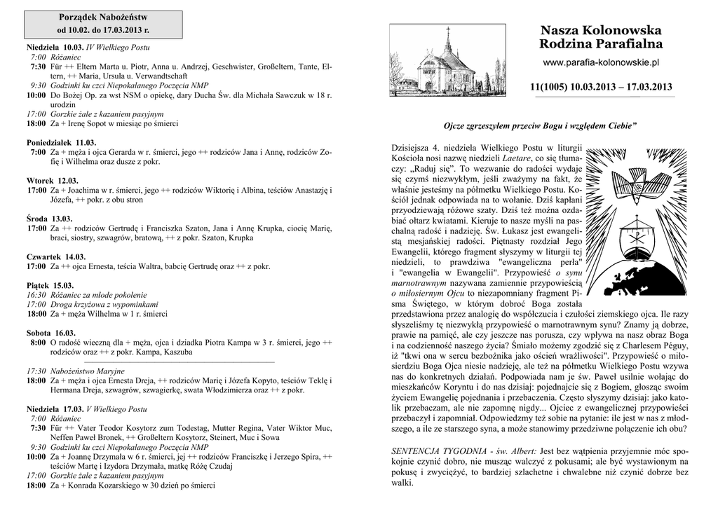 Porządek Nabożeństw od 10.02. do 17.03.2013 r. Niedziela 10.03. IV Wielkiego Postu 7:00 Różaniec 7:30 Für ++ Eltern Marta u. Piotr, Anna u. Andrzej, Geschwister, Großeltern, Tante, Eltern, ++ Maria, Ursula u. Verwandtschaft 9:30 Godzinki ku czci Niepokalanego Poczęcia NMP 10:00 Do Bożej Op. za wst NSM o opiekę, dary Ducha Św. dla Michała Sawczuk w 18 r. urodzin 17:00 Gorzkie żale z kazaniem pasyjnym 18:00 Za + Irenę Sopot w miesiąc po śmierci Poniedziałek 11.03. 7:00 Za + męża i ojca Gerarda w r. śmierci, jego ++ rodziców Jana i Annę, rodziców Zofię i Wilhelma oraz dusze z pokr. Wtorek 12.03. 17:00 Za + Joachima w r. śmierci, jego ++ rodziców Wiktorię i Albina, teściów Anastazję i Józefa, ++ pokr. z obu stron Środa 13.03. 17:00 Za ++ rodziców Gertrudę i Franciszka Szaton, Jana i Annę Krupka, ciocię Marię, braci, siostry, szwagrów, bratową, ++ z pokr. Szaton, Krupka Czwartek 14.03. 17:00 Za ++ ojca Ernesta, teścia Waltra, babcię Gertrudę oraz ++ z pokr. Piątek 15.03. 16:30 Różaniec za młode pokolenie 17:00 Droga krzyżowa z wypominkami 18:00 Za + męża Wilhelma w 1 r. śmierci Sobota 16.03. 8:00 O radość wieczną dla + męża, ojca i dziadka Piotra Kampa w 3 r. śmierci, jego ++ rodziców oraz ++ z pokr. Kampa, Kaszuba ——–—————————————–——————— 17:30 Nabożeństwo Maryjne 18:00 Za + męża i ojca Ernesta Dreja, ++ rodziców Marię i Józefa Kopyto, teściów Teklę i Hermana Dreja, szwagrów, szwagierkę, swata Włodzimierza oraz ++ z pokr. Niedziela 17.03. V Wielkiego Postu 7:00 Różaniec 7:30 Für ++ Vater Teodor Kosytorz zum Todestag, Mutter Regina, Vater Wiktor Muc, Neffen Paweł Bronek, ++ Großeltern Kosytorz, Steinert, Muc i Sowa 9:30 Godzinki ku czci Niepokalanego Poczęcia NMP 10:00 Za + Joannę Drzymała w 6 r. śmierci, jej ++ rodziców Franciszkę i Jerzego Spira, ++ teściów Martę i Izydora Drzymała, matkę Różę Czudaj 17:00 Gorzkie żale z kazaniem pasyjnym 18:00 Za + Konrada Kozarskiego w 30 dzień po śmierci Nasza Kolonowska Rodzina Parafialna www.parafia-kolonowskie.pl 11(1005) 10.03.2013 – 17.03.2013 Ojcze zgrzeszyłem przeciw Bogu i względem Ciebie” Dzisiejsza 4. niedziela Wielkiego Postu w liturgii Kościoła nosi nazwę niedzieli Laetare, co się tłumaczy: „Raduj się”. To wezwanie do radości wydaje się czymś niezwykłym, jeśli zważymy na fakt, że właśnie jesteśmy na półmetku Wielkiego Postu. Kościół jednak odpowiada na to wołanie. Dziś kapłani przyodziewają różowe szaty. Dziś też można ozdabiać ołtarz kwiatami. Kieruje to nasze myśli na paschalną radość i nadzieję. Św. Łukasz jest ewangelistą mesjańskiej radości. Piętnasty rozdział Jego Ewangelii, którego fragment słyszymy w liturgii tej niedzieli, to prawdziwa "ewangeliczna perła" i "ewangelia w Ewangelii". Przypowieść o synu marnotrawnym nazywana zamiennie przypowieścią o miłosiernym Ojcu to niezapomniany fragment Pisma Świętego, w którym dobroć Boga została przedstawiona przez analogię do współczucia i czułości ziemskiego ojca. Ile razy słyszeliśmy tę niezwykłą przypowieść o marnotrawnym synu? Znamy ją dobrze, prawie na pamięć, ale czy jeszcze nas porusza, czy wpływa na nasz obraz Boga i na codzienność naszego życia? Śmiało możemy zgodzić się z Charlesem Péguy, iż "tkwi ona w sercu bezbożnika jako oścień wrażliwości". Przypowieść o miłosierdziu Boga Ojca niesie nadzieję, ale też na półmetku Wielkiego Postu wzywa nas do konkretnych działań. Podpowiada nam je św. Paweł usilnie wołając do mieszkańców Koryntu i do nas dzisiaj: pojednajcie się z Bogiem, głosząc swoim życiem Ewangelię pojednania i przebaczenia. Często słyszymy dzisiaj: jako katolik przebaczam, ale nie zapomnę nigdy... Ojciec z ewangelicznej przypowieści przebaczył i zapomniał. Odpowiedzmy też sobie na pytanie: ile jest w nas z młodszego, a ile ze starszego syna, a może stanowimy przedziwne połączenie ich obu? SENTENCJA TYGODNIA - św. Albert: Jest bez wątpienia przyjemnie móc spokojnie czynić dobro, nie musząc walczyć z pokusami; ale być wystawionym na pokusę i zwyciężyć, to bardziej szlachetne i chwalebne niż czynić dobrze bez walki. 11/2013 Uczynny Pewien chłop wiózł do młynarza na ośle ciężki wór ziarna. Po drodze worek ześlizgnął się z grzbietu osła i leżał teraz na drodze. Chłop wprawdzie bardzo się wysilał, aby podnieść worek, ale mu się to nie udawało, bo dla jednego człowieka był on zbyt ciężki. Tak więc nic mu innego nie pozostało, jak tylko poczekać, aż będzie ktoś przechodził, kto mógłby mu pomóc. Po chwili usłyszał zbliżającego się jeźdźca, i najchętniej zaszyłby się w mysią dziurę, kiedy rozpoznał w nim pana hrabiego we własnej osobie z położonego nieopodal zamku. Zdecydowanie wolałby naturalnie poprosić o pomoc innego chłopa lub też czeladnika, ale prosić o pomoc tak wysoko postawionego pana – to wydawało mu się rzeczą zupełnie niemożliwą. Hrabia podjechał bliżej, zobaczył, w czym problem, zsiadł z konia i powiedział: Jak widzę, miałeś małego pecha, mój przyjacielu. Przybywam ci więc w samą porę z pomocą. To powiedziawszy, chwycił worek z jednej strony, chłop zaś wziął jego drugi koniec i wspólnie zarzucili go na grzbiet osła. Wciąż jeszcze całkiem osłupiały chłop wy dukał: Mój panie, jak mogę ci to wynagrodzić? Całkiem prosto, powiedział panicz. Jeśli kiedykolwiek zobaczysz człowieka w tarapatach, uczyń to samo, co ja. —–—————————————–——————————––—––—— W Roku Wiary planowane wyjazdy z naszej parafii: * od marca do października wyjazdy na Apel Jasnogórski. Terminy będą podawane na bieżąco (najbliższy 13.03.). W kwietniu wyjazd na Apel Jasnogórski trzech grup kandydatów do Bierzmowania. * wyjazdy do Opola do kościoła św. Piotra i P