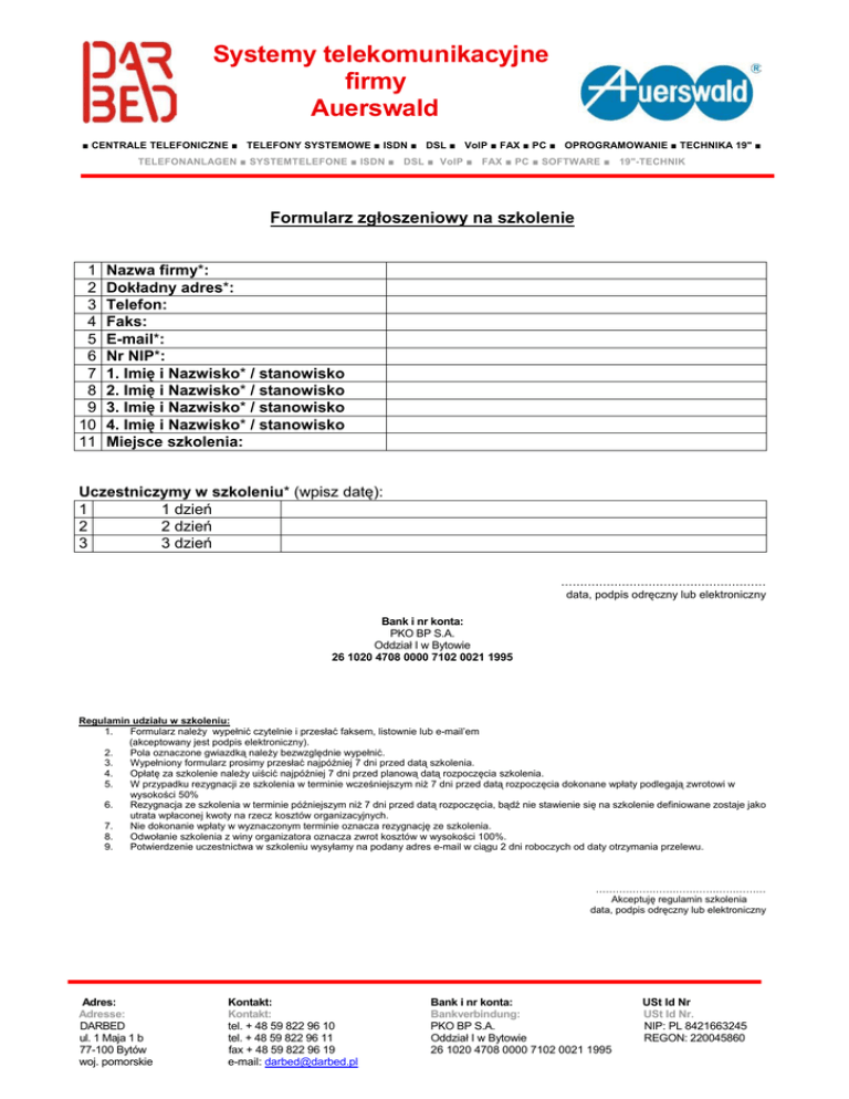 Systemy telekomunikacyjne firmy Auerswald ■ CENTRALE TELEFONICZNE ■ TELEFONY SYSTEMOWE ■ ISDN ■ DSL ■ VoIP ■ FAX ■ PC ■ OPROGRAMOWANIE ■ TECHNIKA 19" ■ TELEFONANLAGEN ■ SYSTEMTELEFONE ■ ISDN ■ DSL ■ VoIP ■ FAX ■ PC ■ SOFTWARE ■ 19"-TECHNIK Formularz zgłoszeniowy na szkolenie 1 2 3 4 5 6 7 8 9 10 11 Nazwa firmy*: Dokładny adres*: Telefon: Faks: E-mail*: Nr NIP*: 1. Imię i Nazwisko* / stanowisko 2. Imię i Nazwisko* / stanowisko 3. Imię i Nazwisko* / stanowisko 4. Imię i Nazwisko* / stanowisko Miejsce szkolenia: Uczestniczymy w szkoleniu* (wpisz datę): 1 1 dzień 2 2 dzień 3 3 dzień ……………………………………………… data, podpis odręczny lub elektroniczny Bank i nr konta: PKO BP S.A. Oddział I w Bytowie 26 1020 4708 0000 7102 0021 1995 Regulamin udziału w szkoleniu: 1. Formularz należy wypełnić czytelnie i przesłać faksem, listownie lub e-mail’em (akceptowany jest podpis elektroniczny). 2. Pola oznaczone gwiazdką należy bezwzględnie wypełnić. 3. Wypełniony formularz prosimy przesłać najpóźniej 7 dni przed datą szkolenia. 4. Opłatę za szkolenie należy uiścić najpóźniej 7 dni przed planową datą rozpoczęcia szkolenia. 5. W przypadku rezygnacji ze szkolenia w terminie wcześniejszym niż 7 dni przed datą rozpoczęcia dokonane wpłaty podlegają zwrotowi w wysokości 50% 6. Rezygnacja ze szkolenia w terminie późniejszym niż 7 dni przed datą rozpoczęcia, bądź nie stawienie się na szkolenie definiowane zostaje jako utrata wpłaconej kwoty na rzecz kosztów organizacyjnych. 7. Nie dokonanie wpłaty w wyznaczonym terminie oznacza rezygnację ze szkolenia. 8. Odwołanie szkolenia z winy organizatora oznacza zwrot kosztów w wysokości 100%. 9. Potwierdzenie uczestnictwa w szkoleniu wysyłamy na podany adres e-mail w ciągu 2 dni roboczych od daty otrzymania przelewu. …………………………………………… Akceptuję regulamin szkolenia data, podpis odręczny lub elektroniczny Adres: Adresse: DARBED ul. 1 Maja 1 b 77-100 Bytów woj. pomorskie Kontakt: Kontakt: tel. + 48 59 822 96 10 tel. + 48 59 822 96 11 fax + 48 59 822 96 19 e-mail: [email protected] Bank i nr konta: Bankverbindung: PKO BP S.A. Oddział I w Bytowie 26 1020 4708 0000 7102 0021 1995 USt Id Nr USt Id Nr. NIP: PL 8421663245 REGON: 220045860