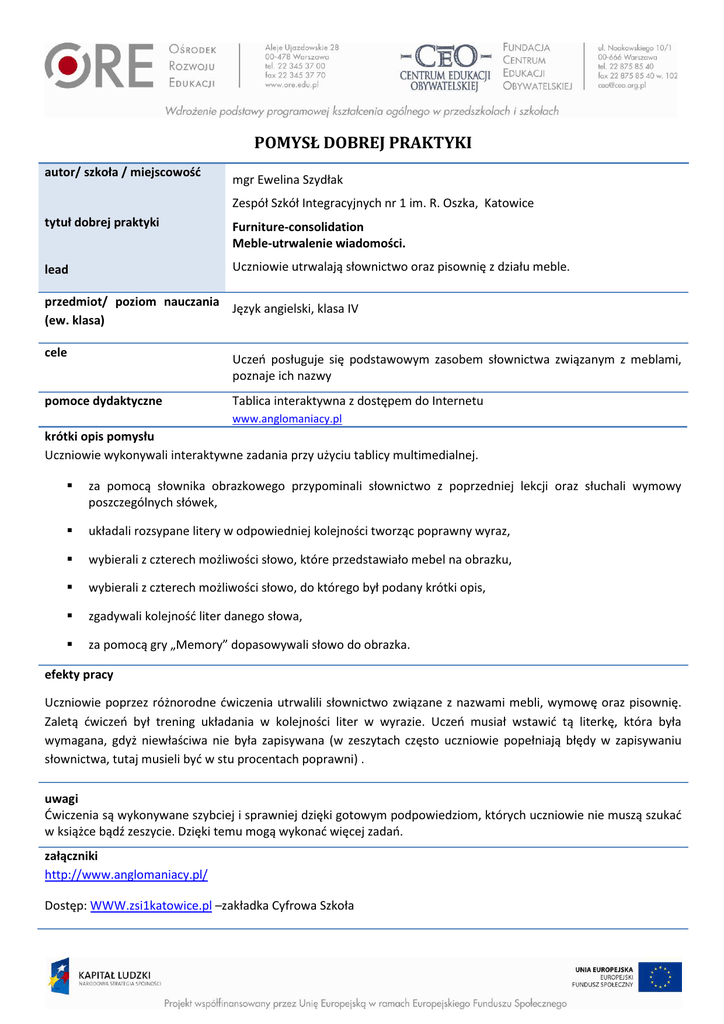 POMYSŁ DOBREJ PRAKTYKI autor/ szkoła / miejscowość mgr Ewelina Szydłak Zespół Szkół Integracyjnych nr 1 im. R. Oszka, Katowice tytuł dobrej praktyki Furniture-consolidation Meble-utrwalenie wiadomości. lead Uczniowie utrwalają słownictwo oraz pisownię z działu meble. przedmiot/ poziom nauczania Język angielski, klasa IV (ew. klasa) cele Uczeń posługuje się podstawowym zasobem słownictwa związanym z meblami, poznaje ich nazwy pomoce dydaktyczne Tablica interaktywna z dostępem do Internetu www.anglomaniacy.pl krótki opis pomysłu Uczniowie wykonywali interaktywne zadania przy użyciu tablicy multimedialnej. za pomocą słownika obrazkowego przypominali słownictwo z poprzedniej lekcji oraz słuchali wymowy poszczególnych słówek, układali rozsypane litery w odpowiedniej kolejności tworząc poprawny wyraz, wybierali z czterech możliwości słowo, które przedstawiało mebel na obrazku, wybierali z czterech możliwości słowo, do którego był podany krótki opis, zgadywali kolejność liter danego słowa, za pomocą gry „Memory” dopasowywali słowo do obrazka. efekty pracy Uczniowie poprzez różnorodne ćwiczenia utrwalili słownictwo związane z nazwami mebli, wymowę oraz pisownię. Zaletą ćwiczeń był trening układania w kolejności liter w wyrazie. Uczeń musiał wstawić tą literkę, która była wymagana, gdyż niewłaściwa nie była zapisywana (w zeszytach często uczniowie popełniają błędy w zapisywaniu słownictwa, tutaj musieli być w stu procentach poprawni) . uwagi Ćwiczenia są wykonywane szybciej i sprawniej dzięki gotowym podpowiedziom, których uczniowie nie muszą szukać w książce bądź zeszycie. Dzięki temu mogą wykonać więcej zadań. załączniki http://www.anglomaniacy.pl/ Dostęp: WWW.zsi1katowice.pl –zakładka Cyfrowa Szkoła