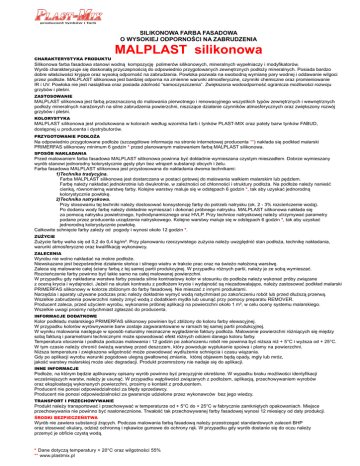 SILIKONOWA FARBA FASADOWA O WYSOKIEJ ODPORNOŚCI NA ZABRUDZENIA CHARAKTERYSTYKA PRODUKTU MALPLAST silikonowa Silikonowa farba fasadowa stanowi wodną kompozycję polimerów silikonowych, mineralnych wypełniaczy i modyfikatorów. Wyrób charakteryzuje się doskonałą przyczepnością do odpowiednio przygotowanych zewnętrznych podłoży mineralnych. Posiada bardzo dobre właściwości kryjące oraz wysoką odporność na zabrudzenia. Powłoka pozwala na swobodną wymianę pary wodnej i oddawanie wilgoci przez podłoże. MALPLAST silikonowa jest bardziej odporna na zmienne warunki atmosferyczne, czynniki chemiczne oraz promieniowanie IR i UV. Powłoka nie jest nasiąkliwa oraz posiada zdolność “samoczyszczenia”. Zwiększona wodoodporność ogranicza możliwości rozwoju grzybów i pleśni. ZASTOSOWANIE MALPLAST silikonowa jest farbą przeznaczoną do malowania pierwotnego i renowacyjnego wszystkich typów zewnętrznych i wewnętrznych podłoży mineralnych narażonych na silne zabrudzenia powierzchni, niszczące działanie czynników atmosferycznych oraz zwiększony rozwój grzybów i pleśni. KOLORYSTYKA MALPLAST silikonowa jest produkowana w kolorach według wzornika farb i tynków PLAST-MIX oraz palety barw tynków FABUD, dostępnej u producenta i dystrybutorów. PRZYGOTOWANIE PODŁOŻA Na odpowiednio przygotowane podłoże (szczegółowe informacje na stronie internetowej producenta **) nakłada się podkład malarski PRIMERFAS silikonowy minimum 6 godzin * przed planowanym malowaniem farbą MALPLAST silikonowa. SPOSÓB NAKŁADANIA Przed malowaniem farba fasadowa MALPLAST silikonowa powinna być dokładnie wymieszana czystym mieszadłem. Dobrze wymieszany wyrób stanowi jednorodny kolorystycznie gęsty płyn bez wtrąceń substancji obcych i żelu. Farba fasadowa MALPLAST silikonowa jest przystosowana do nakładania dwoma technikami: 1)Technika tradycyjna. Farba MALPLAST silikonowa jest dostarczana w postaci gotowej do malowania wałkiem malarskim lub pędzlem. Farbę należy nakładać jednokrotnie lub dwukrotnie, w zależności od chłonności i struktury podłoża. Na podłoże należy nanieść cienką, równomierną warstwę farby. Kolejne warstwy maluje się w odstępach 6 godzin *, tak aby uzyskać jednorodną kolorystycznie powłokę. 2)Technika natryskowa. Przy stosowaniu tej techniki należy dostosować konsystencję farby do potrzeb natrysku (ok. 2 - 3% rozcieńczenie wodą). Po dodaniu wody farbę należy dokładnie wymieszać i dokonać próbnego natrysku. MALPLAST silikonowa nakłada się za pomocą natrysku powietrznego, hydrodynamicznego oraz HVLP. Przy technice natryskowej należy utrzymywać parametry podane przez producenta urządzenia natryskowego. Kolejne warstwy maluje się w odstępach 6 godzin *, tak aby uzyskać jednorodną kolorystycznie powłokę. Całkowite schnięcie farby zależy od pogody i wynosi około 12 godzin *. ZUŻYCIE Zużycie farby waha się od 0,2 do 0,4 kg/m². Przy planowaniu rzeczywistego zużycia należy uwzględnić stan podłoża, technikę nakładania, warunki atmosferyczne oraz kwalifikację wykonawcy. ZALECENIA Wyrobu nie wolno nakładać na mokre podłoże. Niewskazane jest bezpośrednie działanie słońca i silnego wiatru w trakcie prac oraz na świeżo nałożoną warstwę. Zaleca się malowanie całej ściany farbą z tej samej partii produkcyjnej. W przypadku różnych partii, należy je ze sobą wymieszać. Rozcieńczenie farby powinno być takie samo na całej malowanej powierzchni. W przypadku gdy nakładana warstwa farby posiada silnie kontrastowy kolor w stosunku do podłoża należy wykonać próby związane z oceną krycia i wydajności. Jeżeli na skutek kontrastu z podłożem krycie i wydajność są niezadowalające, należy zastosować podkład malarski PRIMERFAS silikonowy w kolorze zbliżonym do farby fasadowej. Nie mieszać z innymi produktami. Narzędzia i aparaty używane podczas prac należy dokładnie wymyć wodą natychmiast po zakończeniu robót lub przed dłuższą przerwą. Wszelkie zabrudzenia powierzchni należy zmyć wodą z dodatkiem mydła lub usunąć przy pomocy preparatu REMOVER. Producent zaleca, przed użyciem wyrobu, wykonanie próbnej aplikacji na powierzchni około 1 m², w celu oceny systemu malarskiego. Wszelkie uwagi prosimy natychmiast zgłaszać do producenta. INFORMACJE DODATKOWE Kolor podkładu malarskiego PRIMERFAS silikonowy powinien być zbliżony do koloru farby elewacyjnej. W przypadku kolorów wyrównywanie barw zostaje zagwarantowane w ramach tej samej partii produkcyjnej. W wyniku malowania następuje w sposób naturalny nieznaczne wygładzenie faktury podłoża. Malowanie powierzchni różniących się między sobą fakturą i parametrami technicznymi może spowodować efekt różnych odcieni danego koloru farby. Temperatura otoczenia i podłoża podczas malowania i 12 godzin po zakończeniu robót nie powinna być niższa niż + 5°C i wyższa od + 25°C. W tym czasie należy chronić świeżą warstwę przed deszczem, który powoduje wypłukanie spoiwa i plamy na powierzchni. Niższa temperatura i zwiększona wilgotność może powodować wydłużenie schnięcia i czasu wiązania. Gdy po aplikacji wyrobu warunki pogodowe ulegną gwałtownej zmianie, której objawem będą opady, mgły lub mróz, jakość warstwy malarskiej może ulec degradacji. Produkt przemrożony nie nadaje się do aplikacji. INNE INFORMACJE Podłoże, na którym będzie aplikowany opisany wyrób powinno być precyzyjnie określone. W wypadku braku możliwości identyfikacji wcześniejszych warstw, należy je usunąć. W przypadku wątpliwości związanych z podłożem, aplikacją, przechowywaniem wyrobów oraz eksploatacją wykonanych powierzchni, prosimy o kontakt z producentem. Producent nie ponosi odpowiedzialności za błędy sprzedawcy. Producent nie ponosi odpowiedzialności za gwarancje udzielone przez wykonawców bez jego wiedzy. TRANSPORT I PRZECHOWYWANIE Produkt należy transportować i pr