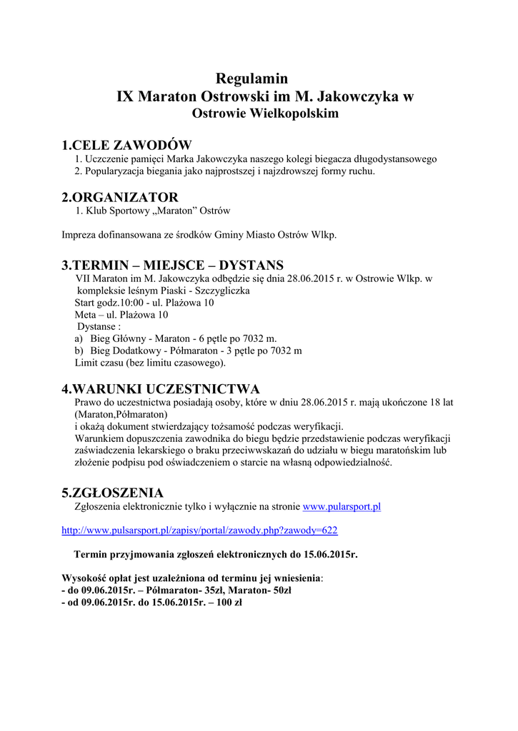 Regulamin IX Maraton Ostrowski im M. Jakowczyka w Ostrowie Wielkopolskim 1.CELE ZAWODÓW 1. Uczczenie pamięci Marka Jakowczyka naszego kolegi biegacza długodystansowego 2. Popularyzacja biegania jako najprostszej i najzdrowszej formy ruchu. 2.ORGANIZATOR 1. Klub Sportowy „Maraton” Ostrów Impreza dofinansowana ze środków Gminy Miasto Ostrów Wlkp. 3.TERMIN – MIEJSCE – DYSTANS VII Maraton im M. Jakowczyka odbędzie się dnia 28.06.2015 r. w Ostrowie Wlkp. w kompleksie leśnym Piaski - Szczygliczka Start godz.10:00 - ul. Plażowa 10 Meta – ul. Plażowa 10 Dystanse : a) Bieg Główny - Maraton - 6 pętle po 7032 m. b) Bieg Dodatkowy - Półmaraton - 3 pętle po 7032 m Limit czasu (bez limitu czasowego). 4.WARUNKI UCZESTNICTWA Prawo do uczestnictwa posiadają osoby, które w dniu 28.06.2015 r. mają ukończone 18 lat (Maraton,Półmaraton) i okażą dokument stwierdzający tożsamość podczas weryfikacji. Warunkiem dopuszczenia zawodnika do biegu będzie przedstawienie podczas weryfikacji zaświadczenia lekarskiego o braku przeciwwskazań do udziału w biegu maratońskim lub złożenie podpisu pod oświadczeniem o starcie na własną odpowiedzialność. 5.ZGŁOSZENIA Zgłoszenia elektronicznie tylko i wyłącznie na stronie www.pularsport.pl http://www.pulsarsport.pl/zapisy/portal/zawody.php?zawody=622 Termin przyjmowania zgłoszeń elektronicznych do 15.06.2015r. Wysokość opłat jest uzależniona od terminu jej wniesienia: - do 09.06.2015r. – Półmaraton- 35zł, Maraton- 50zł - od 09.06.2015r. do 15.06.2015r. – 100 zł 6.WARUNKI FINANSOWE Opłata startowa płatna na konto organizatora: KS MARATON ul Raszkowska 4 63-400 Ostrów Wlkp. Nr konta 07 1050 1201 1000 0023 6643 0151 Tytuł wpłaty: Startowe Maraton lub Półmaraton 2015 oraz imię i nazwisko uczestnika. Opłata startowa dokonana z błędami bez wystarczających danych umożliwiających identyfikację zawodnika lub w niepełnej wysokości nie będzie honorowana i nie podlega zwrotowi. Wysokość opłaty jest uzależniona od terminu jej wniesienia. Liczy się data zaksięgowania na koncie organizatora. Za zgłoszenie uważa się zgłoszenie poprzez rejestrację na stronie PULSAR SPORT oraz uiszczenie opłaty startowej. OPŁTA RAZ WNIESIONA NIE MOŻE BYĆ SCEDOWANA NA INNEGO ZAWODNIKA I NIE PODLEGA ZWROTOWI. Członkowie klubu KS MARATON, którzy mają uregulowane składki płacą: PÓŁMARATON 25 zł MARATON 40 zł Opłata musi być wniesiona do dnia 09.06.2015 7.BIURO ZAWODÓW Biuro zawodów będzie czynne w dniu 28.06.2015r. w godz:7:00 - 8:30 w okolicach byłej Restauracja „Zielona Laguna” ul. Plażowa 10 8.KLASYFIKACJE NAGRODY W KLASYFIKACJACH GENERALNYCH I WIEKOWYCH MĘŻCZYN NIE DUBLUJĄ SIĘ Generalna kobiet i mężczyzn oraz w kategoriach wiekowych mężczyzn i kobiet Maraton i Półmaraton: mężczyźni: M-20 (18 do 29 lata) M-30 (30 do 39 lata) M-40 (40 do 49 lata) M-50 (50 do 59 lata) M-60 (60+) kobiety: M-20 (18 do 29 lata) M-30 (30 do 39 lata) M-40 (40 do 49 lata) M-50 (50 do 59 lata) M-60 (60+) W trakcie trwania maratonu zostaną rozegrane mistrzostwa KS MARATON w Maratonie i Półmaratonie. Nagrodzonych zostanie pierwszych dziesięciu zawodników na każdym dystansie. 9.NAGRODY Dla trójek zwycięzców w kategorii generalnej kobiet i mężczyzn przewidujemy puchary, nagrody rzeczowe. Trzej pierwsi zawodnicy w każdej kategorii wiekowej otrzymają puchary. Nagrody nie dublują się. Każdy uczestnik otrzymuje na miejscu pamiątkowy medal i posiłek po ukończeniu biegu. Rozdanie nagród o godzinie 16:00. 10.ZASADY FINANSOWANIA Uczestnicy startują na własny koszt. Koszty organizacyjne pokrywa organizator i sponsorzy oraz zawodnicy 11.POZOSTAŁE SPRAWY ORGANIZACYJNE Bieg będzie rozgrywany bez względu na warunki atmosferyczne. Uczestnicy ubezpieczeni są od następstw nieszczęśliwych wypadków. Bieg odbędzie się przy ruchu ograniczonym. W czasie biegu organizator zapewnia opiekę medyczną. Na trasie biegu będą punkty odżywcze i odświeżania, na których organizator zapewnia: woda, owoce. Organizator zapewnia bezpłatne noclegi na sali sportowej po wcześniejszej rezerwacji u kolegi Tomasza Stodolskiego tel. 509659484 Noclegi w warunkach hotelowych należy zamawiać indywidualnie. Nad przebiegiem zawodów sprawuje nadzór sędzia główny z licencją PZLA. Interpretacja regulaminu należy do organizatora. 12. Punktacja do GP Ostrowa Wlkp. W związku z dwoma biegami, które będą rozgrywane równolegle. Pierwszy zawodnik w maratonie otrzyma sumę punktów wszystkich uczestników z obu biegów. Zwycięzca półmaratonu otrzyma o jeden punkt mniej niż ostatni zawodnik w maratonie. Bonusu będą przyznawane tylko uczestnikom maratonu ( bieg główny). DYREKTOR MARATONU Witold Olejniczak