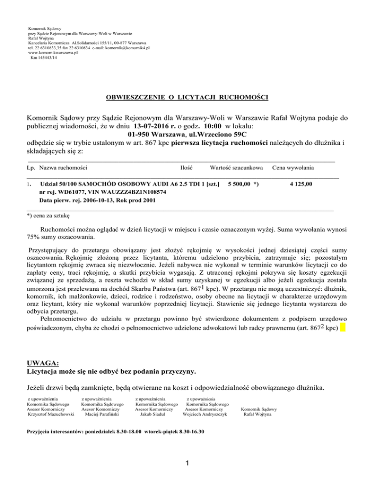 Komornik Sądowy przy Sądzie Rejonowym dla Warszawy-Woli w Warszawie Rafał Wojtyna Kancelaria Komornicza Al.Solidarności 155/11, 00-877 Warszawa tel. 22 6310833,35 fax 22 6310834 e-mail: [email protected] www.komornikwarszawa.pl Km 145443/14 OBWIESZCZENIE O LICYTACJI RUCHOMOŚCI Komornik Sądowy przy Sądzie Rejonowym dla Warszawy-Woli w Warszawie Rafał Wojtyna podaje do publicznej wiadomości, że w dniu 13-07-2016 r. o godz. 10:00 w lokalu: 01-950 Warszawa, ul.Wrzeciono 59C odbędzie się w trybie ustalonym w art. 867 kpc pierwsza licytacja ruchomości należących do dłużnika i składających się z: _______________________________________________________________________________________________________________________ Lp. Nazwa ruchomości Ilość Wartość szacunkowa Cena wywołania _________________________________________________________________________________________________________________________ 1. Udział 50/100 SAMOCHÓD OSOBOWY AUDI A6 2.5 TDI 1 [szt.] nr rej. WD61077, VIN WAUZZZ4BZ1N108574 Data pierw. rej. 2006-10-13, Rok prod 2001 5 500,00 *) 4 125,00 _______________________________________________________________________________________________________________________ *) cena za sztukę Ruchomości można oglądać w dzień licytacji w miejscu i czasie oznaczonym wyżej. Suma wywołania wynosi 75% sumy oszacowania. Przystępujący do przetargu obowiązany jest złożyć rękojmię w wysokości jednej dziesiątej części sumy oszacowania. Rękojmię złożoną przez licytanta, któremu udzielono przybicia, zatrzymuje się; pozostałym licytantom rękojmię zwraca się niezwłocznie. Jeżeli nabywca nie wykonał w terminie warunków licytacji co do zapłaty ceny, traci rękojmię, a skutki przybicia wygasają. Z utraconej rękojmi pokrywa się koszty egzekucji związanej ze sprzedażą, a reszta wchodzi w skład sumy uzyskanej w egzekucji albo jeżeli egzekucja została umorzona jest przelewana na dochód Skarbu Państwa (art. 8671 kpc). W przetargu nie mogą uczestniczyć: dłużnik, komornik, ich małżonkowie, dzieci, rodzice i rodzeństwo, osoby obecne na licytacji w charakterze urzędowym oraz licytant, który nie wykonał warunków poprzedniej licytacji. Stawienie się jednego licytanta wystarcza do odbycia przetargu. Pełnomocnictwo do udziału w przetargu powinno być stwierdzone dokumentem z podpisem urzędowo poświadczonym, chyba że chodzi o pełnomocnictwo udzielone adwokatowi lub radcy prawnemu (art. 8672 kpc) UWAGA: Licytacja może się nie odbyć bez podania przyczyny. Jeżeli drzwi będą zamknięte, będą otwierane na koszt i odpowiedzialność obowiązanego dłużnika. z upoważnienia Komornika Sądowego Asesor Komorniczy Krzysztof Mazuchowski z upoważnienia Komornika Sądowego Asesor Komorniczy Maciej Parafiński z upoważnienia z upoważnienia Komornika Sądowego Komornika Sądowego Asesor Komorniczy Asesor Komorniczy Jakub Siadul Wojciech Andryszczyk Przyjęcia interesantów: poniedziałek 8.30-18.00 wtorek-piątek 8.30-16.30 1 Komornik Sądowy Rafał Wojtyna