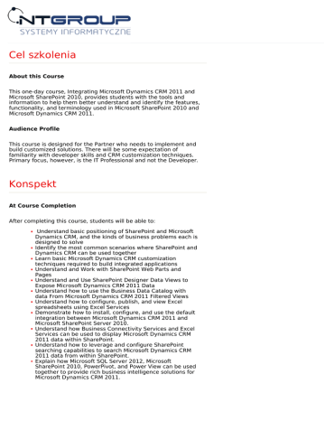 Cel szkolenia About this Course This one-day course, Integrating Microsoft Dynamics CRM 2011 and Microsoft SharePoint 2010, provides students with the tools and information to help them better understand and identify the features, functionality, and terminology used in Microsoft SharePoint 2010 and Microsoft Dynamics CRM 2011. Audience Profile This course is designed for the Partner who needs to implement and build customized solutions. There will be some expectation of familiarity with developer skills and CRM customization techniques. Primary focus, however, is the IT Professional and not the Developer. Konspekt At Course Completion After completing this course, students will be able to: Understand basic positioning of SharePoint and Microsoft Dynamics CRM, and the kinds of business problems each is designed to solve Identify the most common scenarios where SharePoint and Dynamics CRM can be used together Learn basic Microsoft Dynamics CRM customization techniques required to build integrated applications Understand and Work with SharePoint Web Parts and Pages Understand and Use SharePoint Designer Data Views to Expose Microsoft Dynamics CRM 2011 Data Understand how to use the Business Data Catalog with data From Microsoft Dynamics CRM 2011 Filtered Views Understand how to configure, publish, and view Excel spreadsheets using Excel Services Demonstrate how to install, configure, and use the default integration between Microsoft Dynamics CRM 2011 and Microsoft SharePoint Server 2010. Understand how Business Connectivity Services and Excel Services can be used to display Microsoft Dynamics CRM 2011 data within SharePoint. Understand how to leverage and configure SharePoint searching capabilities to search Microsoft Dynamics CRM 2011 data from within SharePoint. Explain how Microsoft SQL Server 2012, Microsoft SharePoint 2010, PowerPivot, and Power View can be used together to provide rich business intelligence solutions for Microsoft Dynamics CRM 2011. Dodatkowe informacje W cenę szkolenia wliczony jest: Certyfikat Microsoft Materiały szkoleniowe, notatnik, długopis Kontakt z trenerem po szkoleniu Kawa, herbata, słodki poczęstunek Obiad Nazwa: Firma posiada wpis w Urzędzie Miasta Łodzi jako placówka kształcenia ustawicznego. Szkolenie MS 80447 Integrating Microsoft Dynamics CRM 2011 with Microsoft Office SharePoint Server 2010 Czas trwania: 1 dni Ilość godzin: 8 Język: Prowadzący: Certyfikowany Trener Microsoft Lokalizacja: NT Group Łódź, siedziba klienta, lub dowolne miasto w Polsce Cena szkolenia: 1400 PLN Dostępne terminy NT GROUP Sp. z o.o. 90-418 Łódź, Al. T. Kościuszki 39 III piętro infolina 801 011 684 Tel.: +48 42 655-33-77; Fax: +48 42 630-15-63 e-mail: [email protected] NT Group Systemy Informatyczne Sp. z o.o. Krajowy Rejestr Sądowy Konto Bankowe 90-418 Łódź, Al. T. Kościuszki 39 III piętro KRS 0000214993 Kredyt Bank S.A. tel.: +42 6553377 Sąd Rejonowy dla Łodzi-Śródmieścia Rozliczenie Krajowe: tel. / fax. +42 6301563 w Łodzi, XX Wydział KRS 71 1500 1246 1215 4005 5991 0000 e-mail: [email protected] www.ntgroup.pl Rozliczenie Zagraniczne: Regon: 470557218 PL 71 1500 1246 1215 4005 5991 0000 NIP: 7251888624 KRDBPLPW