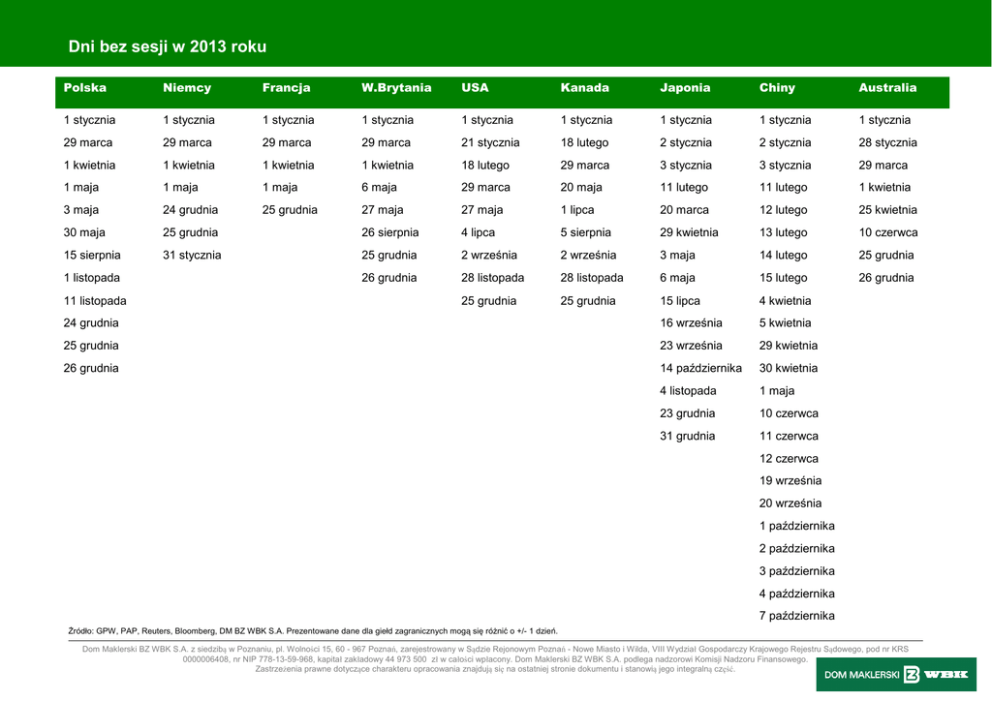 Dni bez sesji w 2013 roku Polska Niemcy Francja W.Brytania USA Kanada Japonia Chiny Australia 1 stycznia 1 stycznia 1 stycznia 1 stycznia 1 stycznia 1 stycznia 1 stycznia 1 stycznia 1 stycznia 29 marca 29 marca 29 marca 29 marca 21 stycznia 18 lutego 2 stycznia 2 stycznia 28 stycznia 1 kwietnia 1 kwietnia 1 kwietnia 1 kwietnia 18 lutego 29 marca 3 stycznia 3 stycznia 29 marca 1 maja 1 maja 1 maja 6 maja 29 marca 20 maja 11 lutego 11 lutego 1 kwietnia 3 maja 24 grudnia 25 grudnia 27 maja 27 maja 1 lipca 20 marca 12 lutego 25 kwietnia 30 maja 25 grudnia 26 sierpnia 4 lipca 5 sierpnia 29 kwietnia 13 lutego 10 czerwca 15 sierpnia 31 stycznia 25 grudnia 2 września 2 września 3 maja 14 lutego 25 grudnia 26 grudnia 28 listopada 28 listopada 6 maja 15 lutego 26 grudnia 25 grudnia 25 grudnia 15 lipca 4 kwietnia 24 grudnia 16 września 5 kwietnia 25 grudnia 23 września 29 kwietnia 26 grudnia 14 października 30 kwietnia 4 listopada 1 maja 23 grudnia 10 czerwca 31 grudnia 11 czerwca 1 listopada 11 listopada 12 czerwca 19 września 20 września 1 października 2 października 3 października 4 października 7 października Źródło: GPW, PAP, Reuters, Bloomberg, DM BZ WBK S.A. Prezentowane dane dla giełd zagranicznych mogą się różnić o +/- 1 dzień. Dom Maklerski BZ WBK S.A. z siedzibą w Poznaniu, pl. Wolności 15, 60 - 967 Poznań, zarejestrowany w Sądzie Rejonowym Poznań - Nowe Miasto i Wilda, VIII Wydział Gospodarczy Krajowego Rejestru Sądowego, pod nr KRS 0000006408, nr NIP 778-13-59-968, kapitał zakładowy 44 973 500 zł w całości wpłacony. Dom Maklerski BZ WBK S.A. podlega nadzorowi Komisji Nadzoru Finansowego. Zastrzeżenia prawne dotyczące charakteru opracowania znajdują się na ostatniej stronie dokumentu i stanowią jego integralną część.