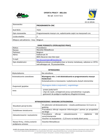 OFERTA PRACY - BELGIA Nr ref. 53447303 22.12.2014r. Stanowisko: PROGRAMISTA CNC Kod ISCO: 7223 Opis stanowiska Programowanie maszyn cnc, wykańczanie części na maszynach cnc Liczba etatów: 2 Miejsce zatrudnienia – kraj: Belgium DANE PODMIOTU OFERUJĄCEGO PRACĘ Pracodawca Status: Nazwa: Państwo: Adres: Stavelse Metaalbouw Belgium Kallestraat 25 8691 Beveren-Aan-Den-Ijzer E-mail: [email protected] Międzynarodowe przedsiębiorstwo w branży metalowej, założone w 1972r, zatrudniające ok. 70 pracowników. Opis działalności: WYMAGANIA Wykształcenie: Nie określono Doświadczenie zawodowe: Wymagany min. 1 rok doświadczenia w programowaniu maszyn Heidenhain Doświadczenie w mocowaniu i wykańczaniu dużych elementów Wymagana dobra znajomość j. angielskiego Znajomość języków: - prawo jazdy kat B - chęć do nauki, umiejętność pracy samodzielnej i w grupie, - gotowość do podjęcia współpracy długoterminowej Inne: WYNAGRODZENIE I WARUNKI ZATRUDNIENIA Wysokość pensji brutto: Dodatkowe świadczenia Zakwaterowanie i wyżywienie: Nazwa firmy, z którą zostanie podpisana umowa: W zależności od doświadczenia – stawka podstawowa 12,5 euro za godzinę Pracodawca oferuje wsparcie informacyjne i pomoc po przyjeździe do Belgii Pracodawca oferuje zakwaterowanie – odpłatnie 150 euro/miesięcznie Voucher na wyżywienie – 2,23 euro na każdy dzień pracy Stavelse Metaalbouw EURES (Europejskie Służby Zatrudnienia) to sieć współpracy pomiędzy Komisją Europejską, Publicznymi Służbami Zatrudnienia krajów UE/ EOG oraz innych organizacji partnerskich, w celu dostarczania informacji, usług pośrednictwa pracy i poradnictwa zawodowego dla pracodawców i pracowników chcących skorzystać z zasady wolnego przepływu osób Rodzaj umowy: Umowa o pracę Wymiar czasu pracy Pełny wymiar czasu pracy Czas trwania umowy: Na czas nieokreślony Data rozpoczęcia: Jak najszybciej – do uzgodnienia z pracodawcą SPOSÓB SKŁADANIA WNIOSKU Wymagane dokumenty CV + List motywacyjny W tytule maila należy wpisać stanowisko i numer referencyjny oferty „CNC PROGRAMMER ref. 53383204” Język, w którym muszą być sporządzone j. angielski przedkładane dokumenty: Do kogo należy wysłać dokumenty: Pracodawca: [email protected] I do wiadomości: [email protected] Dane teleadresowe doradcy EURES: Annelies Thomas Euresadviser VDAB, Dienst Eures Koning Albert I-laan, 1.2. 8200 Brugge Belgium e-mail: [email protected] tel. + 32 (0) 50 44 04 97 fax +32 (0) 50 44 04 81 http://www.workinflanders.be WAŻNOŚĆ Termin przedkładania podań o pracę Do odwołania Uprzejmie informujemy, że pracodawca skontaktuje się wyłącznie z wybranymi kandydatami. UWAGA: 1. Umowa z zagranicznym pracodawcą zostanie zawarta zgodnie z prawem kraju zatrudnienia. Oznacza to, że wszystkie roszczenia odnośnie do warunków, które obejmuje umowa, można kierować wyłącznie do odpowiedniego sądu w kraju zatrudnienia. Publiczne służby zatrudnienia (EURES) nie mogą pośredniczyć ani reprezentować pracownika w sądzie kraju zatrudnienia w przypadku sporu z pracodawcą. 2. Publiczne służby zatrudnienia (EURES) dokładają wszelkich starań, aby zapewnić rzetelność i wiarygodność ofert pracy zgłoszonych w lokalnym urzędzie pracy. Należy wyjaśnić, że oferta pracy została zgłoszona przez stronę trzecią i EURES nie odpowiada za ewentualne rozbieżności między warunkami pracy określonymi w ofercie pracy i warunkami oferowanymi przez potencjalnego pracodawcę. 3. Publiczne służby zatrudnienia (EURES) informują, że będą zbierać, przetwarzać i przekazywać potencjalnym pracodawcom zgodnie z przepisami dotyczącymi ochrony danych osobowych wszystkie dane osobowe dostarczone przez osoby poszukujące pracy. EURES (Europejskie Służby Zatrudnienia) to sieć współpracy pomiędzy Komisją Europejską, Publicznymi Służbami Zatrudnienia krajów UE/ EOG oraz innych organizacji partnerskich, w celu dostarczania informacji, usług pośrednictwa pracy i poradnictwa zawodowego dla pracodawców i pracowników chcących skorzystać z zasady wolnego przepływu osób