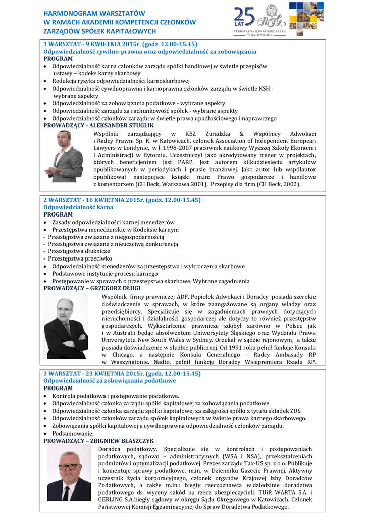 HARMONOGRAM WARSZTATÓW W RAMACH AKADEMII KOMPETENCJI CZŁONKÓW ZARZĄDÓW SPÓŁEK KAPITAŁOWYCH 1 WARSZTAT - 9 KWIETNIA 2015r. (godz. 12.00-15.45) Odpowiedzialność cywilno-prawna oraz odpowiedzialność za zobowiązania PROGRAM Odpowiedzialność karna członków zarządu spółki handlowej w świetle przepisów ustawy – kodeks karny skarbowy Redukcja ryzyka odpowiedzialności karnoskarbowej Odpowiedzialność cywilnoprawna i karnoprawna członków zarządu w świetle KSH wybrane aspekty Odpowiedzialność za zobowiązania podatkowe - wybrane aspekty Odpowiedzialność zarządu za rachunkowość spółek - wybrane aspekty Odpowiedzialność członków zarządu w świetle prawa upadłościowego i naprawczego PROWADZĄCY - ALEKSANDER STUGLIK Wspólnik zarządzający w KBZ Żuradzka & Wspólnicy Adwokaci i Radcy Prawni Sp. K. w Katowicach, członek Association of Independent European Lawyers w Londynie, w l. 1998-2007 pracownik naukowy Wyższej Szkoły Ekonomii i Administracji w Bytomiu. Uczestniczył jako akredytowany trener w projektach, których beneficjentem jest PARP. Jest autorem kilkudziesięciu artykułów opublikowanych w periodykach i prasie branżowej. Jako autor lub współautor opublikował następujące książki m.in: Prawo gospodarcze i handlowe z komentarzem (CH Beck, Warszawa 2001), Przepisy dla firm (CH Beck, 2002). 2 WARSZTAT - 16 KWIETNIA 2015r. (godz. 12.00-15.45) Odpowiedzialność karna PROGRAM Zasady odpowiedzialności karnej menedżerów Przestępstwa menedżerskie w Kodeksie karnym - Przestępstwa związane z niegospodarnością - Przestępstwa związane z nieuczciwą konkurencją - Przestępstwa dłużnicze - Przestępstwa przeciwko Odpowiedzialność menedżerów za przestępstwa i wykroczenia skarbowe Podstawowe instytucje procesu karnego Postępowanie w sprawach o przestępstwa skarbowe. Wybrane zagadnienia PROWADZĄCY – GRZEGORZ DŁUGI Wspólnik firmy prawniczej ADP, Popiołek Adwokaci i Doradcy posiada szerokie doświadczenie w sprawach, w które zaangażowane są organy władzy oraz przedsiębiorcy. Specjalizuje się w zagadnieniach prawnych dotyczących nieruchomości i działalności gospodarczej ale dotyczy to również przestępstw gospodarczych. Wykształcenie prawnicze zdobył zarówno w Polsce jak i w Australii będąc absolwentem Uniwersytety Śląskiego oraz Wydziału Prawa Universytetu New South Wales w Sydney. Orzekał w sądzie rejonowym, a także posiada doświadczenie w służbie publicznej. Od 1991 roku pełnił funkcje Konsula w Chicago, a następnie Konsula Generalnego - Radcy Ambasady RP w Waszyngtonie. Nadto, pełnił funkcję Doradcy Wicepremiera Rządu RP. 3 WARSZTAT - 23 KWIETNIA 2015r. (godz. 12.00-15.45) Odpowiedzialność za zobowiązania podatkowe PROGRAM Kontrola podatkowa i postępowanie podatkowe. Odpowiedzialność członka zarządu spółki kapitałowej za zobowiązania podatkowe. Odpowiedzialność członka zarządu spółki kapitałowej za zaległości spółki z tytułu składek ZUS. Odpowiedzialność członków zarządu spółek kapitałowych w świetle prawa karnego skarbowego. Zobowiązania spółki kapitałowej a cywilnoprawna odpowiedzialność członków zarządu. Podsumowanie. PROWADZĄCY – ZBIGNIEW BŁASZCZYK Doradca podatkowy. Specjalizuje się w kontrolach i postępowaniach podatkowych, sądowo – administracyjnych (WSA i NSA), przekształceniach podmiotów i optymalizacji podatkowej. Prezes zarządu Tax-US sp. z o.o. Publikuje i komentuje sprawy podatkowe, m.in. w Dzienniku Gazecie Prawnej. Aktywny uczestnik życia korporacyjnego, członek organów Krajowej Izby Doradców Podatkowych, a także m.in.: biegły rzeczoznawca w dziedzinie doradztwa podatkowego ds. wyceny szkód na rzecz ubezpieczycieli: TUiR WARTA S.A. i GERLING S.A.biegły sądowy w okręgu Sądu Okręgowego w Katowicach. Członek Państwowej Komisji Egzaminacyjnej do Spraw Doradztwa Podatkowego. 4 WARSZTAT – 7 MAJA 2015r. (godz. 12.00-15.45) Prawo upadłościowe i naprawcze – obowiązki i ryzyka PROGRAM Przesłanki ogłoszenia upadłości Przebieg postępowania upadłościowego, Postępowanie naprawcze i jego przebieg Upadłość konsumencka Pozycja i uprawnienia syndyka masy upadłości Zgromadzenie wierzycieli Pojęcie i ustalenie masy upadłości PROWADZĄCY – AGATA ŻURADZKA STUGLIK Sędzia, zastępca przewodniczącego w Wydziale Gospodarczym Sądu Rejonowego w Gliwicach, poprzednio w Wydziale Gospodarczym ds. Upadłościowych i Naprawczych SR w Gliwicach. Współautorka monografii „Ochrona mienia pracodawcy. Odpowiedzialność pracownicza” (CH Beck, 2003). Prowadziła szkolenia m.in. dla TP S.A. w Katowicach, wykładała w Wyższej Szkole Ekonomii i Administracji w Bytomiu. 5 WARSZTAT – 15 MAJA 2015r. (godz. 12.00-15.45) Sprawozdawczość finansowa – obowiązki i odpowiedzialność PROGRAM Za co odpowiada członek zarządu przy sporządzaniu sprawozdania finansowego Odpowiedzialność głównego księgowego / biura rachunkowego a odpowiedzialność zarządu Podpis pod sprawozdaniem finansowym – mogę, muszę, czy chcę? Terminarz sporządzania sprawozdania finansowego Sprawozdanie finansowe – co musi zawierać Zarząd a sprawozdanie z działalności jednostki Co grozi w praktyce członkowi zarządu z tytułu nierzetelnego sprawozdania finansowego Jak zminimalizować ryzyko „bycia członkiem zarządu” Odpowiedzialność rad nadzorczych za sprawozdanie finansowe PROWADZĄCY – PIOTR RYBICKI Biegły rewident, specjalizuje się w finansach korporacyjnych, sprawozdawczości, nadzorze właścicielskim oraz rachunkowości kreatywnej. Posiada doświadczenie jako wiceprezes zarządu ds. finansowych w spółce giełdowej, zasiada w radach nadzorczych. Przeprowadził ponad 500 specjalistycznych szkoleń oraz opublikował ponad 400 specjalistycznych publikacji. Wykładowca na kursach dla kandydatów na członków rad nadzorczych, inicjator „Konferencji Rada Nadzorcza”. Wiceprezes Regionalnej Izbie Gospodarczej w Kato