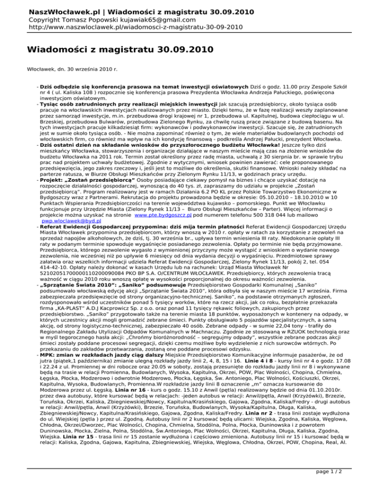 NaszWłocławek.pl | Wiadomości z magistratu 30.09.2010 Copyright Tomasz Popowski [email protected] http://www.naszwloclawek.pl/wiadomosci-z-magistratu-30-09-2010 Wiadomości z magistratu 30.09.2010 Włocławek, dn. 30 września 2010 r. - Dziś odbędzie się konferencja prasowa na temat inwestycji oświatowych Dziś o godz. 11.00 przy Zespole Szkół nr 4 ( ul. Kaliska 108 ) rozpocznie się konferencja prasowa Prezydenta Włocławka Andrzeja Pałuckiego, poświęcona inwestycjom oświatowym. - Tysiąc osób zatrudnionych przy realizacji miejskich inwestycji Jak szacują przedsiębiorcy, około tysiąca osób pracuje na włocławskich inwestycjach realizowanych przez miasto. Dzięki temu, że w fazę realizacji weszły zaplanowane przez samorząd inwestycje, m.in. przebudowa drogi krajowej nr 1, przebudowa ul. Kapitulnej, budowa ciepłociągu w ul. Brzeskiej, przebudowa Bulwarów, przebudowa Zielonego Rynku, za chwilę ruszą prace związane z budową basenu. Na tych inwestycjach pracuje kilkadziesiąt firm: wykonawców i podwykonawców inwestycji. Szacuje się, że zatrudnionych jest w sumie około tysiąca osób. - Nie można zapominać również o tym, że wiele materiałów budowlanych pochodzi od włocławskich firm, co również ma wpływ na ich kondycję finansową - podkreśla Andrzej Pałucki, prezydent Włocławka. - Dziś ostatni dzień na składanie wniosków do przyszłorocznego budżetu Włocławka! Jeszcze tylko dziś mieszkańcy Włocławka, stowarzyszenia i organizacje działające w naszym mieście mają czas na złożenie wniosków do budżetu Włocławka na 2011 rok. Termin został określony przez radę miasta, uchwałą z 30 sierpnia br. w sprawie trybu prac nad projektem uchwały budżetowej. Zgodnie z wytycznymi, wniosek powinien zawierać: cele proponowanego przedsięwzięcia, jego zakres rzeczowy i, jeśli jest to możliwe do określenia, skutki finansowe. Wnioski należy składać na parterze ratusza, w Biurze Obsługi Mieszkańców przy Zielonym Rynku 11/13, w godzinach pracy urzędu. - Projekt: „Zostań przedsiębiorcą” Osoby posiadające ciekawy pomysł na biznes i chcące uzyskać dotację na rozpoczęcie działalności gospodarczej, wynoszącą do 40 tys. zł, zapraszamy do udziału w projekcie „Zostań przedsiębiorcą”. Program realizowany jest w ramach Działania 6.2 PO KL przez Polskie Towarzystwo Ekonomiczne w Bydgoszczy wraz z Partnerami. Rekrutacja do projektu prowadzona będzie w okresie: 05.10.2010 – 18.10.2010 w 10 Punktach Wspierania Przedsiębiorczości na terenie województwa kujawsko – pomorskiego. Punkt we Włocławku funkcjonuje przy Urzędzie Miasta (Zielony Rynek 11/13 – Biuro Obsługi Mieszkańców – Parter). Więcej informacji o projekcie można uzyskać na stronie www.pte.bydgoszcz.pl, pod numerem telefonu 500 318 044 lub mailowo [email protected]. - Referat Ewidencji Gospodarczej przypomina: dziś mija termin płatności Referat Ewidencji Gospodarczej Urzędu Miasta Włocławek przypomina przedsiębiorcom, którzy wnoszą w 2010 r. opłaty w ratach za korzystanie z zezwoleń na sprzedaż napojów alkoholowych, że dziś, tj. 30 września br., upływa termin wniesienia III raty. Niedokonanie opłaty III raty w podanym terminie spowoduje wygaśnięcie posiadanego zezwolenia. Opłaty po terminie nie będą przyjmowane. Przedsiębiorca, którego zezwolenie wygasło z wymienionej przyczyny może wystąpić z wnioskiem o wydanie nowego zezwolenia, nie wcześniej niż po upływie 6 miesięcy od dnia wydania decyzji o wygaśnięciu. Przedmiotowe sprawy załatwia oraz wszelkich informacji udziela Referat Ewidencji Gospodarczej, Zielony Rynek 11/13, pokój 2, tel. 054 414-42-10. Opłaty należy dokonać w kasach Urzędu lub na rachunek: Urząd Miasta Włocławek Nr 52102051700000110200090084 PKO BP S.A. O/CENTRUM WŁOCŁAWEK. Przedsiębiorcy, których zezwolenia tracą ważność w ciągu 2010 roku wnoszą opłatę w wysokości proporcjonalnej do okresu ważności zezwolenia. - „Sprzątanie Świata 2010”: „Saniko” podsumowuje Przedsiębiorstwo Gospodarki Komunalnej „Saniko” podsumowało włocławską edycję akcji „Sprzątanie Świata 2010”, która odbyła się w naszym mieście 17 września. Firma zabezpieczała przedsięwzięcie od strony organizacyjno-technicznej. Saniko”, na podstawie otrzymanych zgłoszeń, rozdysponowało wśród uczestników ponad 5 tysięcy worków, które na rzecz akcji, jak co roku, bezpłatnie przekazała firma „KA-PLAST” A.D.J Kacprowicz Sp. z o.o. oraz ponad 11 tysięcy rękawic foliowych, zakupionych przez przedsiębiorstwo. „Saniko” przygotowało także na terenie miasta 18 punktów, wyposażonych w kontenery na odpady, w których uczestnicy akcji mogli gromadzić zebrane śmieci. Punkty obsługiwało 5 pojazdów specjalistycznych, a samą akcję, od strony logistyczno-technicznej, zabezpieczało 40 osób. Zebrane odpady - w sumie 22,04 tony - trafiły do Regionalnego Zakładu Utylizacji Odpadów Komunalnych w Machnaczu. Zgodnie ze stosowaną w RZUOK technologią oraz w myśl tegorocznego hasła akcji: „Chrońmy bioróżnorodność – segregujmy odpady”, wszystkie zebrane podczas akcji śmieci zostały poddane procesowi segregacji, dzięki czemu możliwe było wydzielenie z nich surowców wtórnych. Po przekazaniu do zakładów przetwarzania, zostaną one poddane procesowi odzysku. - MPK: zmian w rozkładach jazdy ciąg dalszy Miejskie Przedsiębiorstwo Komunikacyjne informuje pasażerów, że od jutra (piątek,1 października) zmianie ulegną rozkłady jazdy linii 2, 4, 8, 15 i 16. Linie 4 i 8 - kursy linii nr 4 o godz. 17.08 i 22.24 z ul. Promiennej w dni robocze oraz 20.05 w soboty, zostają przesunięte do rozkładu jazdy linii nr 8 i wykonywane będą na trasie w relacji Promienna, Budowlanych, Wysoka, Kapitulna, Okrzei, POW, Plac Wolności, Chopina, Chmielna, Łęgska, Płocka, Modzerowo i odwrotnie Modzerowo, Płocka, Łęgska, Św. Antoniego, Plac Wolności