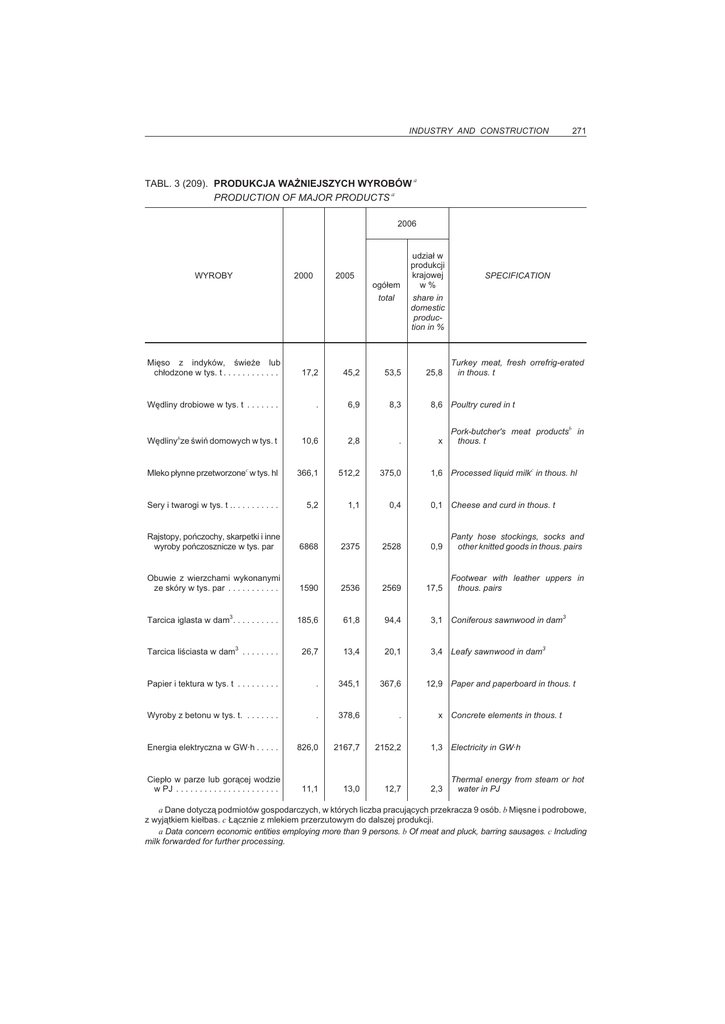 INDUSTRY AND CONSTRUCTION 271 TABL. 3 (209). PRODUKCJA WA¯NIEJSZYCH WYROBÓW a PRODUCTION OF MAJOR PRODUCTS a 2006 WYROBY 2000 2005 ogó³em total udzia³ w produkcji krajowej w% SPECIFICATION share in domestic production in % Miêso z indyków, œwie¿e lub ch³odzone w tys. t . . . . . . . . . . . . 17,2 45,2 53,5 Wêdliny drobiowe w tys. t . . . . . . . . 6,9 8,3 Wêdlinybze œwiñ domowych w tys. t 10,6 2,8 . Mleko p³ynne przetworzonec w tys. hl 366,1 512,2 375,0 Sery i twarogi w tys. t .. . . . . . . . . . 5,2 1,1 0,4 Rajstopy, poñczochy, skarpetki i inne wyroby poñczosznicze w tys. par 6868 2375 2528 0,9 Panty hose stockings, socks and other knitted goods in thous. pairs Obuwie z wierzchami wykonanymi ze skóry w tys. par . . . . . . . . . . . 1590 2536 2569 17,5 Footwear with leather uppers in thous. pairs Tarcica iglasta w dam3 . . . . . . . . . . 185,6 61,8 94,4 3,1 Coniferous sawnwood in dam3 Tarcica liœciasta w dam3 . . . . . . . . 26,7 13,4 20,1 3,4 Leafy sawnwood in dam3 Papier i tektura w tys. t . . . . . . . . . . 345,1 367,6 Wyroby z betonu w tys. t. . . . . . . . . 378,6 . Energia elektryczna w GW·h . . . . . 826,0 2167,7 2152,2 Ciep³o w parze lub gor¹cej wodzie w PJ . . . . . . . . . . . . . . . . . . . . . . 11,1 13,0 12,7 25,8 Turkey meat, fresh orrefrig-erated in thous. t 8,6 Poultry cured in t x Pork-butcher's meat productsb in thous. t 1,6 Processed liquid milkc in thous. hl 0,1 Cheese and curd in thous. t 12,9 Paper and paperboard in thous. t x Concrete elements in thous. t 1,3 Electricity in GW·h 2,3 Thermal energy from steam or hot water in PJ a Dane dotycz¹ podmiotów gospodarczych, w których liczba pracuj¹cych przekracza 9 osób. b Miêsne i podrobowe, z wyj¹tkiem kie³bas. c £¹cznie z mlekiem przerzutowym do dalszej produkcji. a Data concern economic entities employing more than 9 persons. b Of meat and pluck, barring sausages. c Including milk forwarded for further processing.