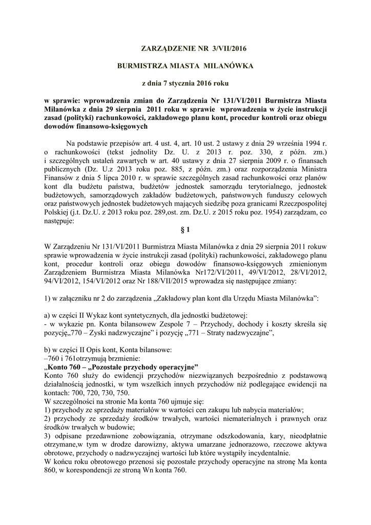 ZARZĄDZENIE NR 3/VII/2016 BURMISTRZA MIASTA MILANÓWKA z dnia 7 stycznia 2016 roku w sprawie: wprowadzenia zmian do Zarządzenia Nr 131/VI/2011 Burmistrza Miasta Milanówka z dnia 29 sierpnia 2011 roku w sprawie wprowadzenia w życie instrukcji zasad (polityki) rachunkowości, zakładowego planu kont, procedur kontroli oraz obiegu dowodów finansowo-księgowych Na podstawie przepisów art. 4 ust. 4, art. 10 ust. 2 ustawy z dnia 29 września 1994 r. o rachunkowości (tekst jednolity Dz. U. z 2013 r. poz. 330, z późn. zm.) i szczególnych ustaleń zawartych w art. 40 ustawy z dnia 27 sierpnia 2009 r. o finansach publicznych (Dz. U.z 2013 roku poz. 885, z późn. zm.) oraz rozporządzenia Ministra Finansów z dnia 5 lipca 2010 r. w sprawie szczególnych zasad rachunkowości oraz planów kont dla budżetu państwa, budżetów jednostek samorządu terytorialnego, jednostek budżetowych, samorządowych zakładów budżetowych, państwowych funduszy celowych oraz państwowych jednostek budżetowych mających siedzibę poza granicami Rzeczpospolitej Polskiej (j.t. Dz.U. z 2013 roku poz. 289,ost. zm. Dz.U. z 2015 roku poz. 1954) zarządzam, co następuje: §1 W Zarządzeniu Nr 131/VI/2011 Burmistrza Miasta Milanówka z dnia 29 sierpnia 2011 rokuw sprawie wprowadzenia w życie instrukcji zasad (polityki) rachunkowości, zakładowego planu kont, procedur kontroli oraz obiegu dowodów finansowo-księgowych zmienionym Zarządzeniem Burmistrza Miasta Milanówka Nr172/VI/2011, 49/VI/2012, 28/VI/2012, 94/VI/2012, 154/VI/2012 oraz Nr 188/VII/2015 wprowadza się następujące zmiany: 1) w załączniku nr 2 do zarządzenia „Zakładowy plan kont dla Urzędu Miasta Milanówka”: a) w części II Wykaz kont syntetycznych, dla jednostki budżetowej: - w wykazie pn. Konta bilansowew Zespole 7 – Przychody, dochody i koszty skreśla się pozycję„770 – Zyski nadzwyczajne” i pozycję „771 – Straty nadzwyczajne”, b) w części II Opis kont, Konta bilansowe: –760 i 761otrzymują brzmienie: „Konto 760 – „Pozostałe przychody operacyjne” Konto 760 służy do ewidencji przychodów niezwiązanych bezpośrednio z podstawową działalnością jednostki, w tym wszelkich innych przychodów niż podlegające ewidencji na kontach: 700, 720, 730, 750. W szczególności na stronie Ma konta 760 ujmuje się: 1) przychody ze sprzedaży materiałów w wartości cen zakupu lub nabycia materiałów; 2) przychody ze sprzedaży środków trwałych, wartości niematerialnych i prawnych oraz środków trwałych w budowie; 3) odpisane przedawnione zobowiązania, otrzymane odszkodowania, kary, nieodpłatnie otrzymane,w tym w drodze darowizny, aktywa umarzane jednorazowo, rzeczowe aktywa obrotowe, przychody o nadzwyczajnej wartości lub które wystąpiły incydentalnie. W końcu roku obrotowego przenosi się pozostałe przychody operacyjne na stronę Ma konta 860, w korespondencji ze stroną Wn konta 760. Na koniec roku konto 760 nie wykazuje salda. Konto 761 – „Pozostałe koszty operacyjne” Konto 761 służy do ewidencji kosztów niezwiązanych bezpośrednio z podstawową działalnością jednostki. W szczególności na stronie Wn konta 761 ujmuje się: 1) koszty osiągnięcia pozostałych przychodów w wartości cen zakupu lub nabycia materiałów; 2) kary, odpisane przedawnione, umorzone i nieściągalne należności, odpisy aktualizujące od należności, koszty postępowania spornego i egzekucyjnego oraz nieodpłatnie przekazane rzeczowe aktywa obrotowe, koszty o nadzwyczajnej wartości lub które wystąpiły incydentalnie. W końcu roku obrotowego przenosi sięna stronę Wn konta 860 – pozostałe koszty operacyjne, w korespondencji ze stroną Ma konta 761. Na koniec roku konto 761 nie wykazuje salda.”, – skreśla sięopis konta 770 - "Zyski nadzwyczajne" i konta 771- "Straty nadzwyczajne", – konta 840 i 860 otrzymują brzmienie: „Konto 840 – „Rezerwy i rozliczenia międzyokresowe przychodów” Konto 840 służy do ewidencji przychodów zaliczanych do przyszłych okresów oraz innych rozliczeń międzyokresowych i rezerw. Na stronie Ma konta 840 ujmuje się utworzenie i zwiększenie rezerwy, a na stronie Wn – ich zmniejszenie lub rozwiązanie. Na stronie Ma konta 840 ujmuje się również powstanie i zwiększenia rozliczeń międzyokresowych przychodów, a na stronie Wn – ich rozliczenie poprzez zaliczenie ich do przychodów roku obrotowego. Ewidencja szczegółowa prowadzona do konta 840 powinna zapewnić możliwość ustalenia stanu: 1) rezerwy oraz przyczyn jej zwiększeń i zmniejszeń; 2) rozliczeń międzyokresowych przychodów z poszczególnych tytułów oraz przyczyn ich zwiększeń i zmniejszeń. Konto 840 może wykazywać saldo Ma, które oznacza stan rezerw i rozliczeń międzyokresowych przychodów. Konto 860 – „Wynik finansowy” Konto 860 służy do ustalania wyniku finansowego jednostki. W końcu roku obrotowego na stronie Wn konta 860 ujmuje się sumę: 1) poniesionych kosztów, w korespondencji z kontem: 400, 401, 402, 403, 404, 405 i 409; 2) wartości sprzedanych materiałów, w korespondencji z kontem 760; 3) kosztów operacji finansowych, w korespondencji z kontem 751, oraz pozostałych kosztów operacyjnych,w korespondencji z kontem 761; Na stronie Ma konta 860 ujmuje się w końcu roku obrotowego sumę: 1) uzyskanych przychodów, w korespondencji z poszczególnymi kontami zespołu 7; 2)dotacji otrzymanych na finansowanie działalności podstawowej, w korespondencji z kontem 740. Saldo konta 860 wyraża na koniec roku obrotowego wynik finansowy jednostki, saldo Wn – stratę netto, saldo Ma – zysk netto. Saldo jest przenoszone w roku następnym na konto 800.”; 2) w załączniku nr 5 do zarządzenia „Wykaz programów komputerowych wykorzystywanych do prowadzenia ksiąg rachunkowych” po literze C dodaje się literę D w brzmieniu: „D) autorstwa firmy „ARISCO” z siedzibą w Łodzi 2013 r. program GOMiG– gospodarka odpadami na terenie miasta i 