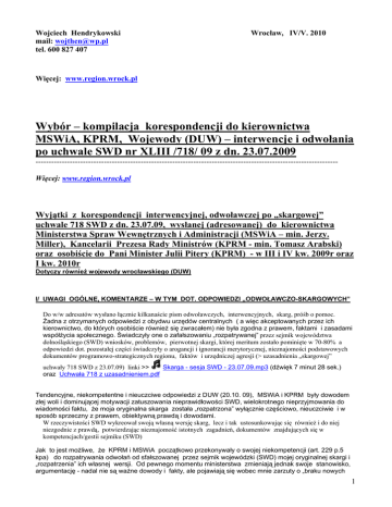 Wojciech Hendrykowski mail: [email protected] tel. 600 827 407 Wrocław, IV/V. 2010 Więcej: www.region.wrock.pl Wybór – kompilacja korespondencji do kierownictwa MSWiA, KPRM, Wojewody (DUW) – interwencje i odwołania po uchwale SWD nr XLIII /718/ 09 z dn. 23.07.2009 ------------------------------------------------------------------------------------------------------------------Więcej: www.region.wrock.pl Wyjątki z korespondencji interwencyjnej, odwoławczej po „skargowej” uchwale 718 SWD z dn. 23.07.09, wysłanej (adresowanej) do kierownictwa Ministerstwa Spraw Wewnętrznych i Administracji (MSWiA – min. Jerzy. Miller), Kancelarii Prezesa Rady Ministrów (KPRM - min. Tomasz Arabski) oraz osobiście do Pani Minister Julii Pitery (KPRM) - w III i IV kw. 2009r oraz I kw. 2010r Dotyczy również wojewody wrocławskiego (DUW) I/ UWAGI OGÓLNE, KOMENTARZE – W TYM DOT. ODPOWIEDZI „ODWOŁAWCZO-SKARGOWYCH” Do w/w adresatów wysłano łącznie kilkanaście pism odwoławczych, interwencyjnych, skarg, próśb o pomoc. Żadna z otrzymanych odpowiedzi z obydwu urzędów centralnych ( a więc akceptowanych przez ich kierownictwo, do których osobiście również się zwracałem) nie była zgodna z prawem, faktami i zasadami współżycia społecznego. Świadczyły one o zafałszowaniu „rozpatrywanej” przez sejmik województwa dolnośląskiego (SWD) wniosków, problemów, pierwotnej skargi, której meritum zostało pominięte w 70-80% a odpowiedzi dot. pozostałej części świadczyły o arogancji i ignorancji merytorycznej, nieznajomości podstawowych dokumentów programowo-strategicznych regionu, faktów i urzędniczej agresji (> uzasadnienia „skargowej” Skarga - sesja SWD - 23.07.09.mp3 (dźwięk 7 minut 28 sek.) uchwały 718 SWD z 23.07.09) linki >> oraz Uchwała 718 z uzasadnieniem.pdf Tendencyjne, niekompetentne i nieuczciwe odpowiedzi z DUW (20.10. 09), MSWiA i KPRM były dowodem złej woli i dominującej motywacji zatuszowania nieprawidłowości SWD, wielokrotnego nieprzyjmowania do wiadomości faktu, że moja oryginalna skarga została „rozpatrzona” wyłącznie częściowo, nieuczciwie i w sposób sprzeczny z prawem, obiektywną prawdą i dowodami. W rzeczywistości SWD wykreował swoją własną wersję skarg, lecz i tak ustosunkowując się również i do niej niezgodnie z prawdą, potwierdzając nieznajomość istotnych zagadnień, dokumentów znajdujących się w kompetencjach/gestii sejmiku (SWD) Jak to jest możliwe, że KPRM i MSWiA początkowo przekonywały o swojej niekompetencji (art. 229 p.5 kpa) do rozpatrywania odwołań od sfałszowanej przez sejmik wojewódzki (SWD) mojej oryginalnej skargi i „rozpatrzenia” ich własnej wersji. Od pewnego momentu ministerstwa zmieniają jednak swoje stanowisko, argumentację - nadal nie są ważne dowody i fakty, ale pojawiają się wobec mnie zarzuty o „braku nowych 1 okoliczności” (tym razem art. 239 par.1 kpa) jako podstawy podtrzymania negatywnego stanowiska MSWiA i KPRM.. Są one zupełnie niezrozumiałe, bo prawda jest jedna i nie może być deformowana w celu spełniania jakiegoś kryterium „nowości” – domagałem się po prostu jej uwzględnienia. Skoro jednak teraz porównywano obydwie skargi, to tym samym ingerowano w ich merytorykę – czyli musiano je konfrontować, oceniać, przyjmując w efekcie za wiarygodne merytoryczne nonsensy zawarte w uchwale 718, co jest po prostu kompromitujące potwierdza zatajanie prawdy. Koniunkturalna zmiana podejścia – a także porównawcze zagłębianie się w treści uchwały 718 – to jest niedopuszczalne i przekracza granice przyzwoitości. Próba wielokrotnej negatywnej oceny przez MSWiA i KPRM (> „urzędy”) mojej sprawy wyłącznie na bazie art. 239 par.1 kpa i abstrahowaniu od podstawowych faktów, okoliczności , kontekstu prawnego i faktycznego służyła wyłącznie zatuszowaniu fałszu i nieprawidłowości na etapie rozpatrywania skargi. Nikt nie oczekiwał od w/w urzędów merytorycznej ingerencji we wnioski, skargi, opinii dot. np. obydwu Strategii (SRWD2020 i DSI) czy prawidłowości przebiegu konkursu RPO w dn. 1.12.08 („3 min”), itp.. Adresaci moich interwencyjnych pism nie mogli natomiast – co wielokrotnie nieuczciwie powtarzali – stwierdzać, że moja skarga została wcześniej rozpatrzona, bo jest to oczywista nieprawda, uporczywie i świadomie powtarzane kłamstwo, przeciwko czemu zdecydowanie protestuję. Każdy, kto poszukuje pomocy, licząc na uczciwość i kompetencje instytucji centralnych, ma prawo co najmniej oczekiwać, że przed udzieleniem odpowiedzi na skargi jej adresaci zorientują się w istocie problemu, zdefiniują obszar rozbieżności, uwzględnią formalny stan faktyczny – czyli ew. ważność postępowania. Bo w tym przypadku brzmienie szokujących Uzasadnień SWD do uchwały 718 (obydwu: pisemnego i werbalnego, na podstawie którego radni jednomyślnie – oprócz 1 osoby – ją zatwierdzili) wyklucza ważność całego postępowania skargowego i uchwały 718. Nie rozwijając tematu, w kontekście automatycznie powielanego/powtarzanego przez w/w urzędy art. 239par.1 kpa („pieniackiego”) pominięto tak elementarne i decydujące o jego bezprzedmiotowości aspekty, jak przede wszystkim to, że moja skarga w rzeczywistości i merytorycznie nigdy rzetelnie i w pełni nie została rozpatrzona przez SWD (listy do radnych > linki >> Radni SWD - list 26.07.09.pdf ; Radni SWD II -list 23.08.pdf - uzupełniony o Suplement z maja 2010 To, że jakiś (jakikolwiek) przyjęty przez SWD dokument dotyczy tytularnie tego tematu (718) to nie znaczy, że odzwierciedla i jest adekwatny do stanu faktycznego, meritum. Podstawowym kryterium oceny / kwalifikacji dokumentu, ( postępowania) jest treść, fakty – a nie strona tytułowa, nazwa. Owszem, coś tam uchwalono – na poziomie „ po wtorku jest piątek”. Jednakże rozbieżność z oryginalną skargą i wnioskami oraz stanem faktycznym, dowodowym jest tak