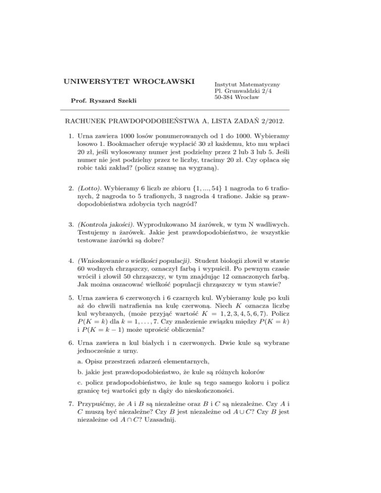 1. Urna zawiera 1000 losów ponumerowanych od 1 do 1000. Wybieramy