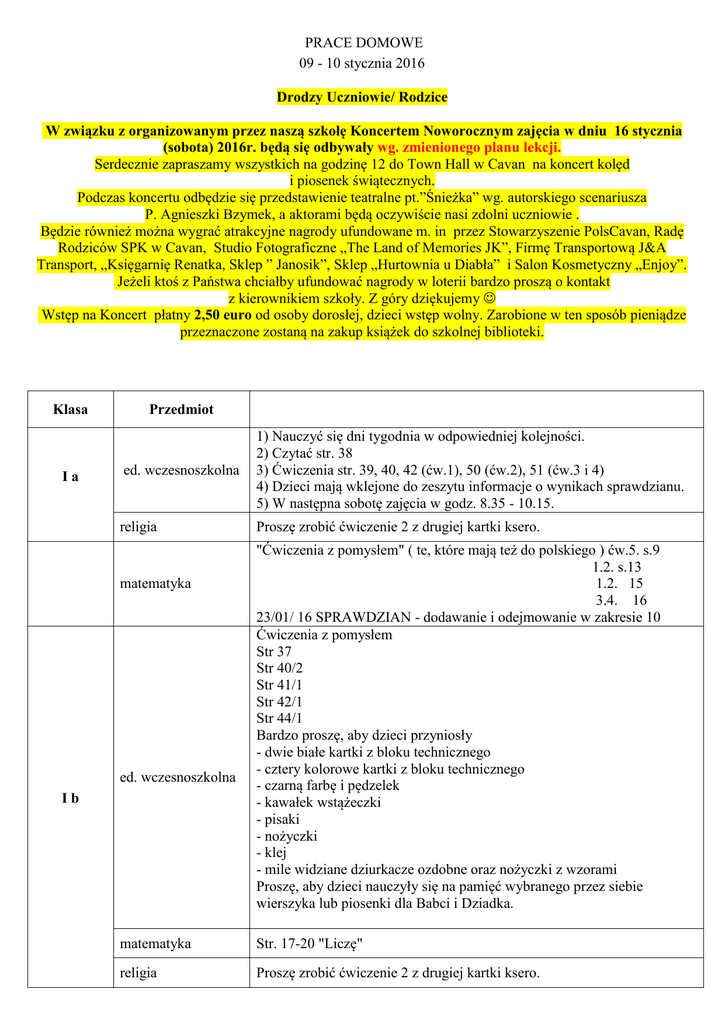PRACE DOMOWE 09 - 10 stycznia 2016 Drodzy Uczniowie/ Rodzice W związku z organizowanym przez naszą szkołę Koncertem Noworocznym zajęcia w dniu 16 stycznia (sobota) 2016r. będą się odbywały wg. zmienionego planu lekcji. Serdecznie zapraszamy wszystkich na godzinę 12 do Town Hall w Cavan na koncert kolęd i piosenek świątecznych. Podczas koncertu odbędzie się przedstawienie teatralne pt.”Śnieżka” wg. autorskiego scenariusza P. Agnieszki Bzymek, a aktorami będą oczywiście nasi zdolni uczniowie . Będzie również można wygrać atrakcyjne nagrody ufundowane m. in przez Stowarzyszenie PolsCavan, Radę Rodziców SPK w Cavan, Studio Fotograficzne „The Land of Memories JK”, Firmę Transportową J&A Transport, „Księgarnię Renatka, Sklep ” Janosik”, Sklep „Hurtownia u Diabła” i Salon Kosmetyczny „Enjoy”. Jeżeli ktoś z Państwa chciałby ufundować nagrody w loterii bardzo proszą o kontakt z kierownikiem szkoły. Z góry dziękujemy Wstęp na Koncert płatny 2,50 euro od osoby dorosłej, dzieci wstęp wolny. Zarobione w ten sposób pieniądze przeznaczone zostaną na zakup książek do szkolnej biblioteki. Klasa Ia Przedmiot ed. wczesnoszkolna 1) Nauczyć się dni tygodnia w odpowiedniej kolejności. 2) Czytać str. 38 3) Ćwiczenia str. 39, 40, 42 (ćw.1), 50 (ćw.2), 51 (ćw.3 i 4) 4) Dzieci mają wklejone do zeszytu informacje o wynikach sprawdzianu. 5) W następna sobotę zajęcia w godz. 8.35 - 10.15. religia Proszę zrobić ćwiczenie 2 z drugiej kartki ksero. matematyka ed. wczesnoszkolna Ib "Ćwiczenia z pomysłem" ( te, które mają też do polskiego ) ćw.5. s.9 1.2. s.13 1.2. 15 3.4. 16 23/01/ 16 SPRAWDZIAN - dodawanie i odejmowanie w zakresie 10 Ćwiczenia z pomysłem Str 37 Str 40/2 Str 41/1 Str 42/1 Str 44/1 Bardzo proszę, aby dzieci przyniosły - dwie białe kartki z bloku technicznego - cztery kolorowe kartki z bloku technicznego - czarną farbę i pędzelek - kawałek wstążeczki - pisaki - nożyczki - klej - mile widziane dziurkacze ozdobne oraz nożyczki z wzorami Proszę, aby dzieci nauczyły się na pamięć wybranego przez siebie wierszyka lub piosenki dla Babci i Dziadka. matematyka Str. 17-20 "Liczę" religia Proszę zrobić ćwiczenie 2 z drugiej kartki ksero. ed. wczesnoszkolna Ic matematyka religia język polski II a 1. Czytać s.38 - tekst czarny - uczniowie, którzy nie znają wszystkich liter zielony znają wszystkie litery 2. Ćwiczenia s.32 ćw. 1.2.3. 33 ł, Ł, ćw.4. 34 5.6.7. 8. - dla chętnych 38 b, B, ćw.1. 39 2.3. 5. - dla chętnych 3. Zachęcam do udziału w konkursach - szczegółowe informacje na stronie internetowej Szkoły 4. W SOBOTĘ 09/01/16 O GODZ. 12.00 ODBĘDZIE SIĘ KONCERT NOWOROCZNY ORGANIZOWANY PRZEZ NASZĄ SZKOŁĘ ORAZ STOWARZYSZENIE "POLSCAVAN". W PROGRAMIE PRZEDSTAWIENIE PT."ŚNIEŻKA" ORAZ POPISY WOKALNO INSTRUMENTALNE NASZYCH UCZNIÓW I ICH RODZICÓW, A TAKŻE INNE ATRAKCJE. Szczegółowe informacje znajdziecie Państwo na stronie internetowej Szkoły.ZAPRASZAMY SERDECZNIE ! 5. Proszę, aby dzieci nauczyły się na pamięć ról do "mini"przedstawienia z okazji Dnia Babci i Dziadka oraz piosenki "Jak ja się cieszę". Uczniowie dostali wydrukowane słowa piosenki, gdzie poniżej znajdziecie Państwo link do piosenki. Proszę, aby dzieci się jej nauczyły. "Ćwiczenia z pomysłem"( te, które mają tez do polskiego ) s.46 ćw.2.3. 47 7. 48 1.2. 49 3.4.5. 17/01/16 SPRAWDZIAN - dodawanie i odejmowanie w zakresie 10 Proszę zrobić ćwiczenie 2 z drugiej kartki ksero. 1. Nauczyć się miesięcy 2. Ćwiczyć pisownię wyrazów z utratą dźwięczności oraz ze spółgłoskami miękkimi 3. Czytać s.34-36 4. Ćwiczenia s.23 ćw.4.5.6. 24 4. 26 1.2.3.4. 27 1.2. 28 1.2. 4. 16/01/16 LEKCJE SKRÓCONE 8.00 - religia 08.35 - 10.15 - j. polski 10.20 - 10.50 - matematyka 5. Zachęcam do udziału w konkursach szczegóły na stronie internetowej Szkoły W SOBOTĘ 09/01/16 O GODZ. 12.00 ODBĘDZIE SIĘ KONCERT NOWOROCZNY ORGANIZOWANY PRZEZ NASZĄ SZKOŁĘ ORAZ STOWARZYSZENIE "POLSCAVAN". W PROGRAMIE PRZEDSTAWIENIE PT."ŚNIEŻKA" ORAZ POPISY WOKALNO INSTRUMENTALNE NASZYCH UCZNIÓW I ICH RODZICÓW, A TAKŻE INNE ATRAKCJE. Szczegółowe informacje znajdziecie Państwo na stronie internetowej Szkoły.ZAPRASZAMY SERDECZNIE ! matematyka Ćwiczenia do s.63 23/01/16 SPRAWDZIAN - dodawanie i odejmowanie w zakresie 20 z przekroczeniem progu dziesiatkowego religia język polski Ćwiczenie 2 strona 40. 1. Nauczyć się miesięcy 2. Ćwiczyć pisownię wyrazów z utratą dźwięczności oraz ze spółgłoskami miękkimi 3. Czytać s.34-36 4. Ćwiczenia s.26 ćw. 1.2.3.4. 27 1.2. 28 1.2. 29 3.4. 30 1.2. 5. Zachęcam do udziału w konkursach szczegóły na stronie internetowej Szkoły 6. Proszę, aby dzieci nauczyły się na pamięć ról do "mini"przedstawienia z okazji Dnia Babci i Dziadka oraz piosenki "Jak ja się cieszę". Uczniowie dostali wydrukowane słowa piosenki, gdzie poniżej znajdziecie Państwo link do piosenki. Proszę, aby dzieci się jej nauczyły. II b 7. W SOBOTĘ 09/01/16 O GODZ. 12.00 ODBĘDZIE SIĘ KONCERT NOWOROCZNY ORGANIZOWANY PRZEZ NASZĄ SZKOŁĘ ORAZ STOWARZYSZENIE "POLSCAVAN". W PROGRAMIE PRZEDSTAWIENIE PT."ŚNIEŻKA" ORAZ POPISY WOKALNO INSTRUMENTALNE NASZYCH UCZNIÓW I ICH RODZICÓW, A TAKŻE INNE ATRAKCJE. Szczegółowe informacje znajdziecie Państwo na stronie internetowej Szkoły.ZAPRASZAMY SERDECZNIE ! religia Ćwiczenie 2 strona 40. Ćwiczenia do s.57 matematyka III a 17/01/16 SPRAWDZIAN dodawanie i odejmowanie w zakresie 20 z przekroczeniem progu dziesiątkowego język polski 1) czytać str. 18-19 (podręcznik cz. 3) 2) K.P. 7/1.2.3 3) K.P. 8/1. 4) Przynosimy książki cz. 3. 5) W następna sobotę zajęcia w godz. 8.35 - 10.15., matematyka na godz. 8.00. matematyka Rozdziały 17-20, Umieć tabliczkę mnożenia przez 1,2,3,4,5,6,7,8,9 Bardzo proszę, aby dzieci nosiły już Karty pracy i podręczniki 3 K. P 1/ 4. 5. 6 K.P 2/ 1. 2 K.P 3 /2 III b język polski Proszę, aby dzieci przy