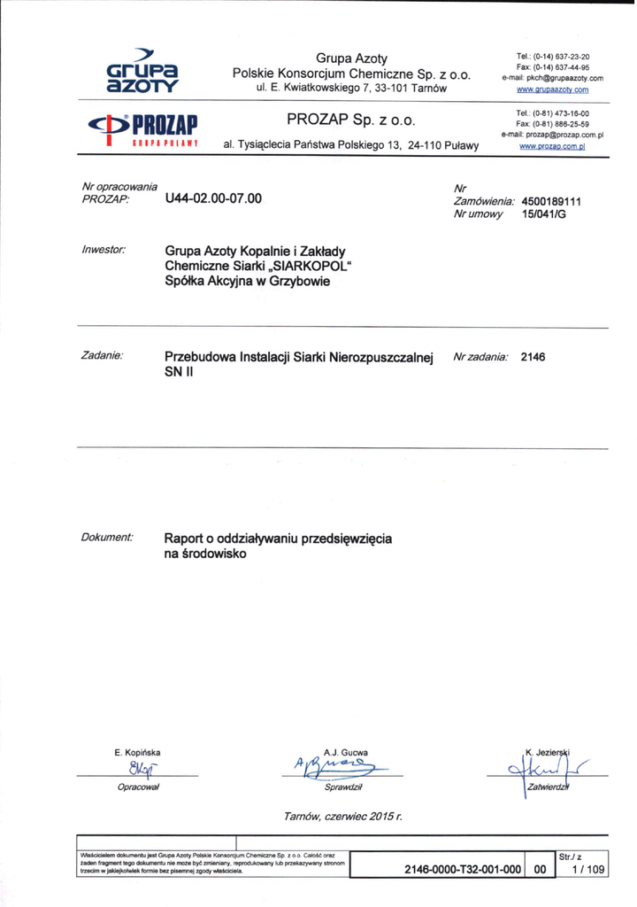 Przebudowa Instalacji Siarki Nierozpuszczalnej SN II Raport o oddziaływaniu przedsięwzięcia na środowisko SPIS TREŚCI 1. STRESZCZENIE W JĘZYKU NIESPECJALISTYCZNYM .............................................................................. 4 2. WSTĘP ............................................................................................................................................................ 7 2.1 Przedmiot opracowania ................................................................................................................................. 7 2.2 Cel i zakres opracowania .............................................................................................................................. 8 2.3 Podstawa opracowania ................................................................................................................................. 8 2.4 Kwalifikacja prawna potencjalnego oddziaływania na środowisko rozpatrywanego przedsięwzięcia ........ 11 2.5 Lokalizacja................................................................................................................................................... 12 2.6 Inwestor ....................................................................................................................................................... 14 2.7 Osoba opracowująca raport ........................................................................................................................ 14 3. OPIS PRZEDSIĘWZIĘCIA ............................................................................................................................ 14 3.1 Charakterystyka całego przedsięwzięcia i warunki użytkowania terenu w fazie budowy i eksploatacji ..... 14 3.2 Główne cechy charakterystyczne procesu produkcyjnego ......................................................................... 17 3.3 Przewidywane rodzaje i ilości zanieczyszczeń wynikające z funkcjonowania planowanego przedsięwzięcia ........................................................................................................................................... 26 4. OPIS ELEMENTÓW PRZYRODNICZYCH ŚRODOWISKA, OBJĘTYCH ZAKRESEM PRZEWIDYWANEGO ODDZIAŁYWANIA PLANOWANEGO PRZEDSIĘWZIĘCIA NA ŚRODOWISKO, W TYM ELEMENTÓW ŚRODOWISKA OBJĘTYCH OCHRONĄ NA PODSTAWIE USTAWY Z DNIA 16 KWIETNIA 2004 R. O OCHRONIE PRZYRODY ..................................................................................... 32 4.1 Morfologia i hydrografia obszaru lokalizacji instalacji ................................................................................. 32 4.2 Budowa geologiczna ................................................................................................................................... 32 4.3 Warunki hydrogeologiczne .......................................................................................................................... 33 4.4 Rozpoznanie warunków geologiczno-inżynierskich terenu lokalizacji Instalacji Siarki Nierozpuszczalnej SN II ............................................................................................................................................................ 33 4.5 Warunki klimatyczne i stan sanitarny powietrza ......................................................................................... 34 4.6 Stan jakości wód powierzchniowych ........................................................................................................... 37 4.7 Stan jakości wód podziemnych ................................................................................................................... 41 4.8 Stan jakości gleb ......................................................................................................................................... 45 4.9 Stan klimatu akustycznego ......................................................................................................................... 46 4.10 Szata roślinna i świat zwierzęcy.................................................................................................................. 47 4.11 Obszary cenne przyrodniczo....................................................................................................................... 47 5. OPIS ISTNIEJĄCYCH W SĄSIEDZTWIE LUB W BEZPOŚREDNIM ZASIĘGU ODDZIAŁYWANIA PLANOWANEGO PRZEDSIĘWZIĘCIA ZABYTKÓW CHRONIONYCH NA PODSTAWIE PRZEPISÓW O OCHRONIE ZABYTKÓW I OPIECE NAD ZABYTKAMI............................................................................ 48 6. OPIS PRZEWIDYWANYCH SKUTKÓW DLA ŚRODOWISKA W PRZYPADKU NIEPODEJMOWANIA PRZEDSIĘWZIĘCIA ...................................................................................................................................... 49 7. OPIS ANALIZOWANYCH WARIANTÓW WRAZ Z UZASADNIENIEM ICH WYBORU LUB NIE................. 49 7.1 WARIANT PROPONOWANY PRZEZ WNIOSKODAWCĘ......................................................................... 50 7.2 RACJONALNY WARIANT ALTERNATYWNY ............................................................................................ 50 7.3 WARIANT NAJKORZYSTNIEJSZY DLA ŚRODOWISKA .......................................................................... 51 8. OKREŚLENIE PRZEWIDYWANEGO ODDZIAŁYWANIA NA ŚRODOWISKO ANALIZOWANYCH WARIANTÓW W TYM RÓWNIEŻ W WYPADKU WYSTĄPIENIA POWAŻNEJ AWARII PRZEMYSŁOWEJ, A TAKŻE MOŻLIWEGO TRANSGRANICZNEGO ODDZIAŁYWANIA NA ŚRODDOWISKO ...................... 51 Właścicielem dokumentu jest Grupa Azoty Polskie Konsorcjum Chemiczne Sp. z o.o. Całość oraz żaden fragment tego dokumentu nie może być zmieniany, reprodukowany lub przekazywany stronom trzecim w jakiejkolwiek formie bez pisemnej zgody właściciela. Str./ z 2146-0000-T32-001-000 00 2 / 109 Przebudowa Instalacji Siarki Nierozpuszczalnej SN II Raport o oddziaływaniu przedsięwzięcia na środowisko 8.1 8.2 8.3 8.4 WARIANT PROPONOWANY PRZEZ WNIOSKOD