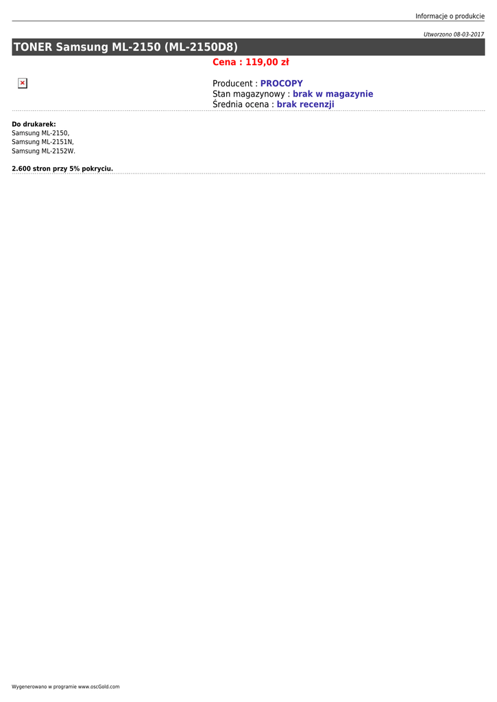Informacje o produkcie Utworzono 08-03-2017 TONER Samsung ML-2150 (ML-2150D8) Cena : 119,00 zł Producent : PROCOPY Stan magazynowy : brak w magazynie Średnia ocena : brak recenzji Do drukarek: Samsung ML-2150, Samsung ML-2151N, Samsung ML-2152W. 2.600 stron przy 5% pokryciu. Wygenerowano w programie www.oscGold.com