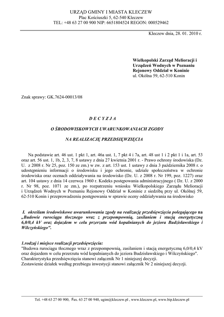 URZĄD GMINY I MIASTA KLECZEW Plac Kościuszki 5, 62-540 Kleczew TEL: +48 63 27 00 900 NIP: 6651804524 REGON: 000529462 Kleczew dnia, 28. 01. 2010 r. Wielkopolski Zarząd Melioracji i Urządzeń Wodnych w Poznaniu Rejonowy Oddział w Koninie ul. Okólna 59, 62-510 Konin Znak sprawy: GK.7624-00013/08 DECYZJA O ŚRODOWISKOWYCH UWARUNKOWANIACH ZGODY NA REALIZACJĘ PRZEDSIĘWZIĘCIA Na podstawie art. 46 ust. 1 pkt 1, art. 46a ust. 1, 7 pkt 4 i 7a, art. 48 ust 1 i 2 pkt 1 i 1a, art. 53 oraz art. 56 ust. 1, 1b, 2, 3, 7, 8 ustawy z dnia 27 kwietnia 2001 r. - Prawo ochrony środowiska (Dz. U. z 2008 r. Nr 25, poz. 150 ze zm.) w zw. z art. 153 ust. 1 ustawy z dnia 3 października 2008 r. o udostępnieniu informacji o środowisku i jego ochronie, udziale społeczeństwa w ochronie środowiska oraz ocenach oddziaływania na środowisko (Dz. U. z 2008 r. Nr 199, poz. 1227) oraz art. 104 ustawy z dnia 14 czerwca 1960 r. Kodeks postępowania administracyjnego ( Dz. U. z 2000 r. Nr 98, poz. 1071 ze zm.), po rozpatrzeniu wniosku Wielkopolskiego Zarządu Melioracji i Urządzeń Wodnych w Poznaniu Rejonowy Oddział w Koninie z siedzibą przy ul. Okólnej 59, 62-510 Konin i przeprowadzeniu postępowania w sprawie oceny oddziaływania na środowisko I. określam środowiskowe uwarunkowania zgody na realizację przedsięwzięcia polegającego na „Budowie rurociągu tłocznego wraz z przepompownią, zasilaniem i stacją energetyczną 6,0/0,4 kV oraz dojazdem w celu przerzutu wód kopalnianych do jeziora Budzisławskiego i Wilczyńskiego". 1.rodzaj i miejsce realizacji przedsięwzięcia: "Budowa rurociągu tłocznego wraz z przepompownią, zasilaniem i stacją energetyczną 6,0/0,4 kV oraz dojazdem w celu przerzutu wód kopalnianych do jeziora Budzisławskiego i Wilczyńskiego". Charakterystyka przedsięwzięcia stanowi załącznik Nr 1 niniejszej decyzji. Zestawienie działek według przebiegu inwestycji stanowi załącznik Nr 2 niniejszej decyzji. Tel. +48 63 27 00 900, Fax. 63 27 00 940, [email protected] , www.kleczew.pl, www.bip.kleczew.pl 2. warunki wykorzystania terenu w fazie realizacji i eksploatacji, ze szczególnym uwzględnieniem konieczności ochrony wartości przyrodniczych, zasobów naturalnych i zabytków oraz ograniczenia uciążliwości dla terenów sąsiednich: Planowane przedsięwzięcie będzie realizowane i eksploatowane z uwzględnieniem następujących warunków: - w fazie realizacji inwestycji należy zapewnić prowadzenie robót w sposób zabezpieczający przed powstaniem szkód, - roboty ziemne należy wykonać w sposób prawidłowy tj. dokonać odpowiedniego doboru sprzętu roboczego, zdjąć i odłożyć próchniczną warstwę gleby, a następnie ponownie ułożyć ją jako warstwę przypowierzchniową, - emisje gazów należy ograniczyć do obszaru, na którym aktualnie prowadzone będą prace, - prace ziemne i transportowe należy wykonywać w porze dziennej między 6.00 – 22.00, -wytworzone odpady należy przekazywać specjalistycznym firmom prowadzącym działalność w zakresie gospodarowania odpadami, posiadających wymagane prawem zezwolenie w celu odzysku lub unieszkodliwiania, - wszystkie urządzenia należy utrzymać we właściwym stanie technicznym i prawidłowo eksploatować, 3. wymagania dotyczące ochrony środowiska konieczne do uwzględnienia w projekcie budowlanym: W projekcie budowlanym należy uwzględnić następujące rozwiązania chroniące środowisko: 1. zapewnić właściwe gospodarowanie odpadami wytworzonymi w trakcie realizacji i eksploatacji inwestycji, magazynować je selektywnie w wydzielonych i przystosowanych do tego miejscach (na utwardzonym podłożu lub w szczelnych zbiornikach) oraz przekazywać je podmiotom posiadającym stosowne zezwolenia na ich odzysk lub unieszkodliwianie, - prace budowlane i demontażowe wykonywać w porze dziennej ( w godzinach od 6.00 do 22.00), - teren inwestycji zabezpieczyć przed dostępem osób postronnych. 2. przerzut wód kopalnianych prowadzić zgodnie z wariantem III (przedstawionym w raporcie), tj. - do maksymalnej rzędnej lustra wody: 98,40 m n.p.m. w jeziorze Budzisławskim, 98,20 m n.p.m. w jeziorze Wilczyńskim, 98,20 m n.p.m. w jeziorze Suszewskim, 97,80 m n.p.m. w jeziorze Kownacko – Wójcińskim, - w ilości nieprzekraczającej sumarycznej wartości 0,4 m3/s i w maksymalnej ilości 6,3 mln m3/rok, - w miesiącach zimowych, od listopada do kwietnia, gdy w warstwie powierzchniowej epilimnionu (na głębokości ok. 1 m) wody jeziora będą chłodniejsze od wód tłoczonych. 3. rurociąg tłoczny zaprojektować z rur o średnicy wewnętrznej DN700 o całkowitej długości 11 122,8 m, w tym: rurociąg wspólny dla obu jezior o długości 9 183 m, rurociąg do jeziora Budzisławskiego - 1 475,4 m, rurociąg do jeziora Wilczyńskiego - 464,4 m. 4. przejścia rurociągu pod drogami, rowami oraz w miejscach kolizji z istniejącymi wodociągami wykonać w rurach osłonowych stalowych DN1000. Rury układać w miejscach kolizji metodą przekopu, przecisku lub przewiertu. W miejscach kolizji z istniejącą siecią drenarską wykonać zbieracze przechwytujące wody drenarskie, a następnie odtworzyć drenaż przed zasypaniem wykopów. 5. na całej długości trasy, nad rurociągiem ułożyć taśmę metalową nierdzewną w folii PE służącą do prowadzenia przewodów oraz 30 do 40 cm ponad przewodami taśmę ostrzegawczą z folii PE. 6. przed zasypaniem rurociąg tłoczny poddać próbie szczelności. 7. w pompowni zainstalować trzy pompy zasilane energią elektryczną, w tym jedną rezerwową, połączone równolegle do wspólnego kolektora tłocznego. 8. wykonać zbiornik retencyjny pompowni o pojemności czynnej 6 000 m3 jako otwartą budowlę Tel. +48 63 27 00 900, Fax. 63 27 00 940, [email protected] , www.kleczew.pl, www.bip.kleczew.pl ziemną o skarpach zabezpieczonych przed przesiąkaniem poprzez ułożenie folii izolacyjnej PE o grubości 1,00 do 1,50 mm, obsypanej warstwą piasku oraz zabezpieczon