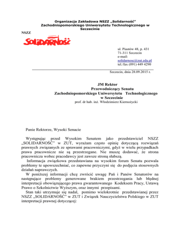 Organizacja Zakładowa NSZZ „Solidarność” Zachodniopomorskiego Uniwersytetu Technologicznego w Szczecinie NSZZ ul. Piastów 48, p. 431 71-311 Szczecin e-mail: [email protected] tel./fax (091) 449 4290 ___________________________________________________________________ Szczecin, dnia 28.09.2015 r. JM Rektor Przewodniczący Senatu Zachodniopomorskiego Uniwersytetu Technologicznego w Szczecinie prof. dr hab. inż. Włodzimierz Kiernożycki Panie Rektorze, Wysoki Senacie Występując przed Wysokim Senatem jako przedstawiciel NSZZ „SOLIDARNOŚĆ” w ZUT, wyrażam często opinię dotyczącą rozwiązań prawnych związanych ze sprawami pracowniczymi, gdyż w wielu przypadkach prawa pracownicze nie są przestrzegane. Nie muszę dodawać, że strona pracownicza wobec pracodawcy jest zawsze stroną słabszą. Informacja związkowa przedstawiana na wysokim forum Senatu pozwala problemy te upowszechniać, co zapewne przyczyni się do podjęcia stosownych działań naprawczych. W poniższej informacji chcę zwrócić uwagę Pań i Panów Senatorów na następujące problemy generowane brakiem przestrzegania lub błędnej interpretacji obowiązującego prawa gwarantowanego Kodeksem Pracy, Ustawą Prawo o Szkolnictwie Wyższym, oraz innymi przepisami. Stan taki utrzymuje się nadal, pomimo wielokrotnie przedstawianej przez NSZZ „SOLIDARNOŚĆ” w ZUT i Związek Nauczycielstwa Polskiego w ZUT interpretacji prawnej dotyczącej: 1. braku stosowanych zmian prawnych w statucie uczelni. Wysoki Senat uchwałą nr 65 z dnia 29.06.2015 uchwalił zmiany w Statucie Uczelnie zachowując istotę niezgodnych z obowiązującym prawem zawartych w nimi zapisów dotyczących głównie nauczycieli akademickich - chodzi o § 57 ust. 7 Statutu ZUT. Nastąpiło to pomimo przedstawienia w dniu 25.05.2015 na posiedzeniu Senatu przez NSZZ „SOLIDARNOŚĆ” w ZUT opinii prawnej wykazującej niezgodności tych zapisów z obowiązującym prawem. Niezgodności te wielokrotnie zostały potwierdzone prze wyroki sądowe, o czym już informowaliśmy. Statut Uczelni z wadą prawną podlega sankcji wynikającej z art. 65 ust. 2 Ustawy Prawo o Szkolnictwie Wyższym, która zobowiązuje J.M. Rektora do jego zawieszenia i wykonania dalszych czynności zgodnie z zawartymi tam zapisami prawnymi. Nie mogą bowiem być stosowane wobec określonej grupy pracowników sankcje wynikające z nieprawnych zapisów w statucie uczelni. Ponadto należy dodać, że zgodnie z wynikającą z art. 3 kodeksu cywilnego zasadą lex retro non agit ustawa nie ma mocy wstecznej. Zasada stanowiąca, że prawo nie działa wstecz jest uważana za fundamentalną dla demokratycznego porządku prawnego i obowiązuje we wszystkich dziedzinach prawa. 2. braku równorzędnego dostępu do porad prawnych Wspomniana na wstępnie uwaga o słabszej pozycji pracownika w jakiekolwiek sprawie, a zwłaszcza w sporze pracowniczym, powoduje, że zwracam uwagę Wysokiego Senatu na ten problem. Pracownik bowiem nie ma wcale lub ma w bardzo ograniczonym zakresie możliwość uzyskania porady prawnej z działu prawnego uczelni. W tej kwestii do związku zawodowego wpływają sygnały, prośby o udział w rozwiązywaniu problemów. Nasz związek aktywnie, zachowując bezstronność, w rozwiązywaniu tych problemów uczestniczy. Służy także w miarę swoich możliwości pomocą prawną. Pracownicy ZUT, za wyjątkiem osób wymienionych w ZARZĄDZENIU NR 113 Rektora Zachodniopomorskiego Uniwersytetu Technologicznego w Szczecinie z dnia 3 lipca 2009 r. w sprawie organizacji obsługi prawnej w Zachodniopomorskim Uniwersytecie Technologicznym w Szczecinie, są absolutnie w sprawach pracowniczych pozbawieni jakiejkolwiek możliwości pomocy prawnej, a udzielonej przez zespół prawników ZUT. Dzieje się tak pomimo obowiązku ciążącym na Uczelni – z mocy art. 66 ust.2 pkt 5.- mówiącym o dbaniu o przestrzeganie prawa – zarówno przez pracodawcę jak i pracownika. W tym mieści się również prawo pracownika do korzystania z porad prawnych prawników ZUT. Na dzień dzisiejszy szeregowi pracownicy są tego pozbawieni. Można dodać, że dysproporcję działającą na niekorzyść pracownika, np. w czasie rozstrzygania sądowego w sprawach pracowniczych, pogłębia zatrudnianie przez ZUT zewnętrznych kancelarii prawnych występujących przeciwko pracownikom. Takie postępowanie zdaniem NSZZ „SOLIDARNOŚĆ” w ZUT jest wysoce nieetyczne. Można postawić pytanie, czy państwowa instytucja dysponująca własnym zespołem prawnym, w czasach intensywnego szukania oszczędności na uczelni, powinna zatrudniać prawników zewnętrznych w prostych na ogół sprawach z zakresu prawa pracy ? KZ NSZZ „SOLIDARNOŚĆ” w ZUT wnioskuje, aby poszerzyć zakres obowiązków uczelnianego zespołu radców prawnych o porady prawne również dla pracowników uczelni oraz o zaprzestanie korzystania z zewnętrznych kancelarii prawnych w sprawach czysto pracowniczych. 3. Rozbieżności pomiędzy pracodawcą a związkami zawodowymi w sprawie podwyżek wynagrodzenia w 2015 roku. KZ NSZZ „SOLIDARNOŚĆ” w ZUT przypomina Wysokiem Senatowi, że oba Związki Zawodowe działające w ZUT pozostają w sporze zbiorowym z pracodawcą spowodowanym nieprawnym i niekorzystnym dla pracowników rozdysponowaniem kwoty na podwyżki wynagrodzenia w 2015 roku. Bez żadnej gwarancji wyrównania pracownikom brakującej, należnej im prawnie kwoty podwyżki. Mówimy o kwocie ok. 7 milionów złotych. Takie stanowisko pracodawcy jest sprzeczne z polityką Ministerstwa Nauki i Szkolnictwa Wyższego, dążącego do poprawy wynagrodzeń pracowników uczelni wyższych w latach 2013 – 2015. Z ubolewaniem stwierdzam iż podczas dyskusji, prawdopodobnie z braku znajomości praw związkowych, były prezentowane stanowiska, które obwiniały w tej kwestii związki zawodowe. Podjęta przez Senat w dniu 29.06.2015 roku uchwała Nr 60 w sprawie poparcia stanowiska Rektora ZUT dotyczącego zwiększenia wynagrodzeń od
