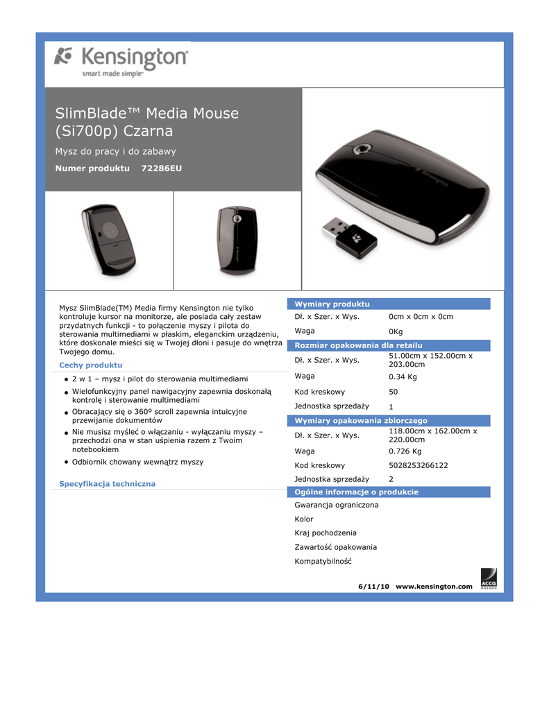 SlimBlade™ Media Mouse (Si700p) Czarna Mysz do pracy i do zabawy Numer produktu 72286EU Mysz SlimBlade(TM) Media firmy Kensington nie tylko kontroluje kursor na monitorze, ale posiada cały zestaw przydatnych funkcji - to połączenie myszy i pilota do sterowania multimediami w płaskim, eleganckim urządzeniu, które doskonale mieści się w Twojej dłoni i pasuje do wnętrza Twojego domu. Cechy produktu Wymiary produktu Dł. x Szer. x Wys. 0cm x 0cm x 0cm Waga 0Kg Rozmiar opakowania dla retailu 51.00cm x 152.00cm x Dł. x Szer. x Wys. 203.00cm • 2 w 1 – mysz i pilot do sterowania multimediami Waga 0.34 Kg • Wielofunkcyjny panel nawigacyjny zapewnia doskonałą kontrolę i sterowanie multimediami Kod kreskowy 50 • Obracający się o 360º scroll zapewnia intuicyjne przewijanie dokumentów Jednostka sprzedaży 1 • Nie musisz myśleć o włączaniu - wyłączaniu myszy – przechodzi ona w stan uśpienia razem z Twoim notebookiem • Odbiornik chowany wewnątrz myszy Specyfikacja techniczna Wymiary opakowania zbiorczego 118.00cm x 162.00cm x Dł. x Szer. x Wys. 220.00cm Waga 0.726 Kg Kod kreskowy 5028253266122 Jednostka sprzedaży 2 Ogólne informacje o produkcie Gwarancja ograniczona Kolor Kraj pochodzenia Zawartość opakowania Kompatybilność 6/11/10 www.kensington.com