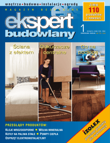 wntrza•budowa•instalacje•ogrody M A G A Z Y N B E Z P Ł A T N ZIMA 110 Y produktów i nowoÊci 1 budowlany 2010(27) • ISSN 1730 -1904 KWARTALNIK • NAKŁAD 60 TYS. EGZ. Âciana z efektem Odkurzacze centralne PRZEGLÑDY PRODUKTÓW: KLEJE MROZOODPORNE n WEŁNA MINERALNA KOTŁY NA PALIWA STAŁE n POMPY CIEPŁA OSPRZ¢T ELEKTROINSTALACYJNY Co na podłog´ HFIjGFN:FHN2+-5'.+k Kompaktowa kamera termowizyjna Przedstawiciel Handlowy FLIR Paweł Rutkowski tel.: +48(22) 849 71 90, e-mail: rutkowski@flir.com.pl, www.flir.com.pl W NUMERZE | NOWO¥CI 6 | WN}TRZA ¥ciana z efektem . . . . . . . . . . . . . . . . . . . . . . . . . . . . . . . . . . . . . . . . 8 Drewniane czy laminowane . . . . . . . . . . . . . . . . . . . . . . . . . . . . . . . . 12 Jaki klej wybraÊ . . . . . . . . . . . . . . . . . . . . . . . . . . . . . . . . . . . . . . . . . 16 Jak ukïadaÊ gresy . . . . . . . . . . . . . . . . . . . . . . . . . . . . . . . . . . . . . . . . 17 ¥CIANA Z EFEKTEM | BUDOWA Kleje odporne na mróz . . . . . . . . . . . . . . . . . . . . . . . . . . . . . . . . . . . . 18 PrzeglÈd mrozoodpornych zapraw klejÈcych . . . . . . . . . . . . . . . . . . 18 Garaĝ – miejsce nie tylko dla samochodu . . . . . . . . . . . . . . . . . . . . . 20 Wygodny i funkcjonalny garaĝ . . . . . . . . . . . . . . . . . . . . . . . . . . . . . 23 Pïyta gipsowa do stosowania wewnÈtrz i na zewnÈtrz budynków . . . 24 System izolacji Bituthene . . . . . . . . . . . . . . . . . . . . . . . . . . . . . . . . . 26 GARA¿ – MIEJSCE NIE TYLKO DLA SAMOCHODU Ciepïe okna w dachu . . . . . . . . . . . . . . . . . . . . . . . . . . . . . . . . . . . . . 28 Szansa czy ciekawostka, czyli rzecz o budynkach energooszczÚdnych . . . . . . . . . . . . . . . . . . 30 Przyklejanie styropianu w systemach ociepleñ . . . . . . . . . . . . . . . . . 36 Zanim ocieplisz Ăciany . . . . . . . . . . . . . . . . . . . . . . . . . . . . . . . . . . . 38 Ciszej, cieplej i bezpieczniej z weïnÈ mineralnÈ . . . . . . . . . . . . . . . . . 42 PrzeglÈd izolacji z weïny mineralnej . . . . . . . . . . . . . . . . . . . . . . . . 46 ...O BUDYNKACH ENERGOOSZCZ}DNYCH | INSTALACJE Odkurzacze centralne w pytaniach i odpowiedziach . . . . . . . . . . . . . 52 Pompy ciepïa od A do Z . . . . . . . . . . . . . . . . . . . . . . . . . . . . . . . . . . 56 Ekologiczne i ekonomiczne. Pompy ciepïa Fonko – nowoczesne urzÈdzenia grzewcze . . . . . . . . . 59 PrzeglÈd pomp ciepïa . . . . . . . . . . . . . . . . . . . . . . . . . . . . . . . . . . . 60 Jak wybraÊ kocioï . . . . . . . . . . . . . . . . . . . . . . . . . . . . . . . . . . . . . . . 66 PrzeglÈd kotïów na paliwa staïe . . . . . . . . . . . . . . . . . . . . . . . . . . . 68 POMPY CIEPA OD A DO Z Zamiast odĂnieĝania . . . . . . . . . . . . . . . . . . . . . . . . . . . . . . . . . . . . . 70 Systemy ochrony przed Ăniegiem i lodem . . . . . . . . . . . . . . . . . . . . . 74 Gniazda wtyczkowe i ïÈczniki w instalacjach elektrycznych . . . . . . . . 76 PrzeglÈd osprzÚtu elektroinstalacyjnego . . . . . . . . . . . . . . . . . . . . 77 | OGRODY Projektowanie nawierzchni . . . . . . . . . . . . . . . . . . . . . . . . . . . . . . . . 80 * * * PROJEKTOWANIE NAWIERZCHNI Warto wiedzieÊ, Indeks firm . . . . . . . . . . . . . . . . . . . . . . . . . . . . . . . 82 4 www.eksper tbudowlany.pl nr 1/2010 NOWO¥CI typu Click, z trójstopniowÈ regulacjÈ przepïywu wody, który zapewnia dïugotrwaïÈ i bezawaryjnÈ pracÚ ukïadu. Bateria umywalkowa Vegane wyposaĝona jest równieĝ w perlator, który napowietrza wodÚ, dziÚki czemu powstaje wraĝenie obfitego strumienia, bez zmiany komfortu mycia. Zastosowanie perlatora pozwala zredukowaÊ CERAMIKA T}TNIkCA ¿YCIEM roczne zuĝycie wody nawet do 50%, a tym samym obniĝyÊ rachunki. W skïad linii Vegane wchodzÈ ponadto baterie: umywalkowa 3-otworowa sto- Kubistyczne umywalki z kolekcji Living City marki Laufen, autorstwa nie- jÈca z automatycznym korkiem, umywalkowa 3-otworowa podtynkowa, wannowa mieckiej grupy projektowej Phoenix Design, zostaïy wzbogacone o niepowtarzal- 5-otworowa stojÈca z akcesoriami, wannowa Ăcienna z akcesoriami, natryskowa ne nadruki. Umywalki zaskakujÈ czystoĂciÈ formy i funkcjonalnoĂciÈ. Dodatkowy stojÈca i Ăcienna z akcesoriami, kuchenna stojÈca z wyciÈganym natryskiem, ku- blat ceramiczny podnosi walory uĝytkowe i estetyczne umywalki, a w poïÈczeniu chenna stojÈca teleskopowa, kuchenna stojÈca z děwigniÈ z boku oraz bateria bi- z dowolnie dobranym wzorem-dekoracjÈ nadaje ïazience indywidualny charak- detowa stojÈca z automatycznym korkiem spustowym. ter. W zaleĝnoĂci od wystroju ïazienki ceramicznÈ póïkÚ moĝna przystroiÊ wzorem w ksztaïcie waĝki, skamieliny, motywu roĂlinnego lub kwiatowego. W ofercie dla Wszystkie baterie firmy Valvex objÚte sÈ piÚcioletniÈ gwarancjÈ. Cena brutto: bateria umywalkowa wysoka z automatycznym korkiem spustowym – 457,50 zï. firm moĝliwe jest przygotowanie krótkich serii (od 10 sztuk) z dowolnym wzorem i logotypem. EKONOMICZNE CIEPO Pompa ciepïa Bjørn marki Vikersønn to urzÈdzenie gwarantujÈce efektywne ogrzewanie i oszczÚdnoĂci w budĝecie domowym. Pompa pobiera energiÚ cieplnÈ z ziemi i dziaïa ze sprawnoĂciÈ przekraczajÈcÈ 1:4., co oznacza, ĝe z kaĝdej 1 jednostki energii dostarczonej do ukïadu, pompa ciepïa wytwarza 4 jednostki ciepïa. Innowacyj- W skïad kolekcji Living City wchodzÈ umywalki o wymiarach: 100×46, 80×46, noĂÊ pompy Bjørn polega na sile napÚ- 60×46 oraz 50×46 cm. Ponadto dostÚpne sÈ umywalki nablatowe dïugoĂci 150 cm, dowej specjalnej hermetycznej sprÚ- z blatem ceramicznym z prawej lub lewej strony (umywalka 60 cm i póïka 90 cm) ĝarki typu scroll. Jest ona tak skonstruowana, aby pobór prÈdu byï jak najmniej- oraz umywalki nablatowe dïugoĂci 100 cm (60 cm umywalka i 40 cm póïka). szy, przy niskiej wraĝliwoĂci na uszkodzenia mechaniczne. Vikersønn gwarantu- Przykïad
