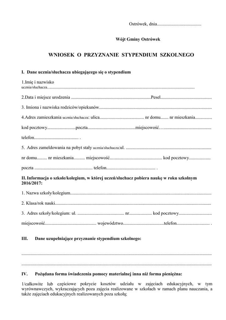 Ostrówek, dnia....................................... Wójt Gminy Ostrówek WNIOSEK O PRZYZNANIE STYPENDIUM SZKOLNEGO I. Dane ucznia/słuchacza ubiegającego się o stypendium 1.Imię i nazwisko ucznia/słuchacza.................................................................................................................................. 2.Data i miejsce urodzenia ......................................................................Pesel............................................. 3. Imiona i nazwiska rodziców/opiekunów................................................................................................... 4.Adres zamieszkania ucznia/słuchacza: ulica....................................... nr domu....... nr mieszkania............... kod pocztowy.........................poczta..........................................miejscowość….......................................... telefon....................................... . 5. Adres zameldowania na pobyt stały ucznia/słuchacza:ul. ........................................................................... nr domu......... nr mieszkania.......... miejscowość.............................................. kod pocztowy................... poczta ................................................... telefon........................................... . II. Informacja o szkole/kolegium, w której uczeń/słuchacz pobiera naukę w roku szkolnym 2016/2017: 1. Nazwa szkoły/kolegium............................................................................................................................ 2. Klasa/rok nauki......................................................................................................................................... 3. Adres szkoły/kolegium: ul. ......................................... nr.................... kod pocztowy............................. miejscowość............................................. województwo....................................telefon............................. . III. Dane uzupełniające przyznanie stypendium szkolnego: ....................................................................................................................................................................... ....................................................................................................................................................................... IV. Pożądana forma świadczenia pomocy materialnej inna niż forma pieniężna: 1/całkowite lub częściowe pokrycie kosztów udziału w zajęciach edukacyjnych, w tym wyrównawczych, wykraczających poza zajęcia realizowane w szkołach w ramach planu nauczania, a także zajęciach edukacyjnych realizowanych poza szkołą; /Zajęcia dydaktyczne, które będą opłacane ze stypendium:......................................................................... ...................................................................................................................................................................... prowadzone przez:........................................................................................................................................ 2/ pomoc rzeczowa o charakterze edukacyjnym, w tym w szczególności zakup podręczników i innych pomocy naukowych /zeszyty, przybornik itp./ 3/ całkowite lub częściowe pokrycie kosztów związanych z pobieraniem nauki poza miejscem zamieszkania /dotyczy uczniów szkół ponadgimnazjalnych./ 4/ świadczenia pieniężne / poz: 1 - 4 - właściwe podkreślić/ V. Potwierdzenie dyrektora szkoły/kolegium: 1. Potwierdzam, że w/w jest uczniem/słuchaczem....................................................................................... ....................................................................................................................................................................... 2. Opinia dyrektora szkoły/kolegium............................................................................................................................................ ....................................................................................................................................................................... ....................................................................................................................................................................... ....................................................................................................................................................................... VI. Świadoma/y/ odpowiedzialności za podanie nieprawdziwych danych oświadczam, że: 1/ moja rodzina składa się z.................. osób pozostających we wspólnym gospodarstwie domowym, L.p. 1 Nazwisko i imię członka rodziny Stopień pokrewieństwa Data urodzenia Miejsce pracy lub nauki Wysokość osiągniętego dochodu składający wniosek 2/ posiadam – nie posiadam* gospodarstwo rolne o powierzchni....................ha przeliczeniowych, z którego dochód wynosi..........................................................................................................................zł. 3/ pobieram – nie pobieram* stypendium ................................naukowe – socjalne* przyznane przez ................................................................................................ w wysokości.............................................zł. 4/ otrzymuję świadczenia socjalne, w tym: - dodatek mieszkaniowy w wysokości......................................................................................................zł; - zasiłek rodzinny w wysokości:................................................................................................................zł; - dochód nie podlegający opodatkowaniu podatkiem dochodowym: a/ renty i emerytury....................................................................................................