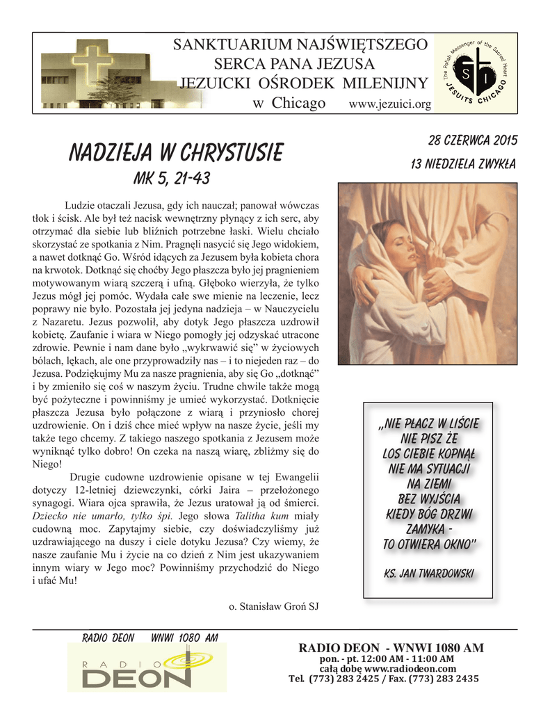 SANKTUARIUM NAJŚWIĘTSZEGO SERCA PANA JEZUSA JEZUICKI OŚRODEK MILENIJNY w Chicago www.jezuici.org 28 czerwca 2015 nadzieja w chrystusie 13 niedziela zwykła Mk 5, 21-43 Ludzie otaczali Jezusa, gdy ich nauczał; panował wówczas tłok i ścisk. Ale był też nacisk wewnętrzny płynący z ich serc, aby otrzymać dla siebie lub bliźnich potrzebne łaski. Wielu chciało skorzystać ze spotkania z Nim. Pragnęli nasycić się Jego widokiem, a nawet dotknąć Go. Wśród idących za Jezusem była kobieta chora na krwotok. Dotknąć się choćby Jego płaszcza było jej pragnieniem motywowanym wiarą szczerą i ufną. Głęboko wierzyła, że tylko Jezus mógł jej pomóc. Wydała całe swe mienie na leczenie, lecz poprawy nie było. Pozostała jej jedyna nadzieja – w Nauczycielu z Nazaretu. Jezus pozwolił, aby dotyk Jego płaszcza uzdrowił kobietę. Zaufanie i wiara w Niego pomogły jej odzyskać utracone zdrowie. Pewnie i nam dane było „wykrwawić się” w życiowych bólach, lękach, ale one przyprowadziły nas – i to niejeden raz – do Jezusa. Podziękujmy Mu za nasze pragnienia, aby się Go „dotknąć” i by zmieniło się coś w naszym życiu. Trudne chwile także mogą być pożyteczne i powinniśmy je umieć wykorzystać. Dotknięcie płaszcza Jezusa było połączone z wiarą i przyniosło chorej uzdrowienie. On i dziś chce mieć wpływ na nasze życie, jeśli my także tego chcemy. Z takiego naszego spotkania z Jezusem może wyniknąć tylko dobro! On czeka na naszą wiarę, zbliżmy się do Niego! Drugie cudowne uzdrowienie opisane w tej Ewangelii dotyczy 12-letniej dziewczynki, córki Jaira – przełożonego synagogi. Wiara ojca sprawiła, że Jezus uratował ją od śmierci. Dziecko nie umarło, tylko śpi. Jego słowa Talitha kum miały cudowną moc. Zapytajmy siebie, czy doświadczyliśmy już uzdrawiającego na duszy i ciele dotyku Jezusa? Czy wiemy, że nasze zaufanie Mu i życie na co dzień z Nim jest ukazywaniem innym wiary w Jego moc? Powinniśmy przychodzić do Niego i ufać Mu! ,,Nie płacz w liście nie pisz że los ciebie kopnął nie ma sytuacji na ziemi bez wyjścia kiedy Bóg drzwi zamyka to otwiera okno” ks. Jan Twardowski o. Stanisław Groń SJ RADIO DEON WNWI 1080 AM RADIO DEON - WNWI 1080 AM pon. - pt. 12:00 AM - 11:00 AM całą dobę www.radiodeon.com Tel. (773) 283 2425 / Fax. (773) 283 2435 PORZĄDEK MSZY ŚWIĘTYCH INTENCJE MSZY ŚWIĘTYCH Poniedziałek - pi¹tek: 8:00, 18:00, 19:00 (radiowa: WCEV 1450) I piątek miesiąca: 8:00, 18:00 i 19:00 Środa: 19:00 - nowenna do Matki Bożej Nieustającej Pomocy Sobota: 8:00 i 19:00 , tylko w I sobotę miesiąca o 17:00 dla chorych, Niedziela: 8:00 (radiowa), 9:30, 11:00, 13:00, 19:00, 20:30 SpowiedŸ św.: od poniedziałku do soboty - 7:30 i 18:30, w niedzielę - pó³ godziny przed ka¿d¹ Msz¹ Œwiêt¹, w1. pi¹tek miesi¹ca - od 17:30 do 20:00 -=- Adoracja Najświętszego Sakramentu - od poniedziałku do czwartku - od 18:30 do 19:00 sobota - od 18:00 do 19:00 Sanktuarium Najświętszego Serca Pana Jezusa Jezuicki Ośrodek Milenijny 5835 W. Irving Park Rd.; Chicago, IL 60634, Tel. 773 777 7000; fax 773 427 0126 www.jezuici.org e-mail: [email protected] Audycje Radia DEON: tel. 773 283 2425 Fax. 773 283 2435 www. radiodeon.com e-mail: [email protected] Biuro czynne: od poniedziałku do soboty: 8:30 - 9:00, 15:30 - 20:30 niedziela: 8:30 - 15:00 Biblioteka czynna: sobota: 18:00 - 19:00; niedziela: 10:30 - 14:30; Kawiarenka czynna: niedz.: 10:00 - 15:00 Sacred Heart Mission House 4105 N. Avers Ave., Chicago, IL 60618 Tel. 773 588 74 76; fax 773 588 65 17 Rektor Sanktuarium i Przełożony Jezuitów o. Tomasz Oleniacz , SJ (773-588-7476 - ext. 224) o. Józef Birecki, SJ (773-777-7000 - ext. 121) o. Jerzy Mordarski, SJ (773-588-7476 - ext. 234) o. Jerzy Karpiński, SJ (773-588-7476 - ext. 237) o. Paweł Witon, SJ (773-588-7476 - ext. 227) br. Adam Poręba, SJ (773-777-7000 - ext. 122) Wszelkie ofiary i donacje prosimy kierowaæ na adres Sanktuarium. Donacje s¹ wolne od podatku i mo¿na je odpisywaæ przy rozliczeniu z IRS. Niedziela, 28 VI 2015 8:00 + + Józefa i Stefan Baran w rocznicę śmierci 9:30 Zbiorowa 11:00 + Jan Łoś 13:00 + Tadeusz Dubiel 19:00 Zbiorowa 20:30 + + Józefa i Roman Półtorak, + Józef Półtorak, + Witold Półtorak Poniedziałek, 29 VI - świętych apostołów Piotra i Pawła 8:00 w intencji syna 18:00 + Władysław Ledwoń 19:00 Zbiorowa Wtorek, 30 VI 8:00 o szczęśliwą podróż 18:00 w intencji Pana Jezusa Chrystusa ,, za wszystkich jego wrogów widzialnych i nie widzialnych” 19:00 Zbiorowa Środa, 1 VII 8:00 za Dobroczyńców Jezuickiego Ośrodka Milenijnego 18:00 + Łukasz Barbasz w rocznicę śmierci 19:00 Zbiorowa I Czwartek, 2 VII 8:00 z okazji urodzin żony WIesławy i całej rodziny Grygo 18:00 + Zenia Rogowski 19:00 Zbiorowa I Piątek, 3 VII - św. Tomasza Apostoła 8:00 o Boże błogosławieństwo i opiekę Matki Bożej dla syna Mateusza z okazji urodzin 18:00 Zbiorowa 19:00 Wynagradzająca Sercu Jezusa i za Czytelników Posłańca Encyklika Laudato Si’ Ojca Świętego Franciszka poświęcona trosce o Wspólny Dom znajduje się na stronie www.deon24.com W poniedziałek i wtorek ostatnie nabożeństwa czerwcowe po Mszy św. o godz. 19:00. Od lipca zapraszamy na adorację Najświętszego Sakramentu, od poniedziałku do piątku, po Mszy Św. o godz. 18:00. TRANSMISJE RADIOWE I INTERNETOWE od poniedziałku do piątku,transmisja Mszy Św. z godz. 19:00 Radio WCEV 1450 (www.wcev1450.com) Niedziela 9:30 www.RadioSiedeM.net w niedziele: godz 8-9, Radio WCEV 1450, oraz Polskie Radio Chicago 1030 WNVR www.polskieradio.com) Codziennie przez całą dobę: Kamera internetowa z Sanktuarium (obraz i dźwięk; używać Internet Explorer): www.jezuici.org - link „Transmisje na żywo” – wpisać jako użytkownik i hasło: 5835 Fundacja „Strong Family - Silna Rodzina” Sponsor fundacji: WIKLANSKI’S BAKERY 6006 W Belmont Ave, Chicago, IL 60634 (773) 853-0077 Sł