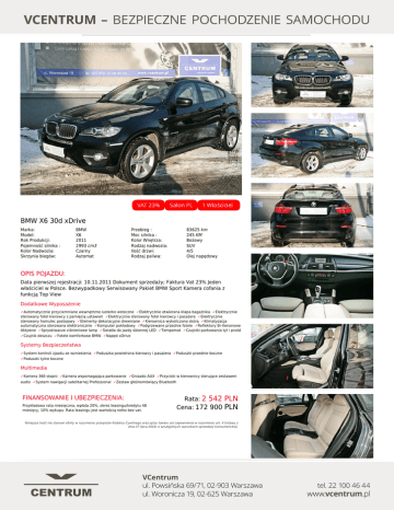 BMW X6 30d xDrive Marka: Model: Rok Produkcji: Pojemność silnika : Kolor Nadwozia: Skrzynia biegów: BMW X6 2011 2993 cm3 Czarny Automat Przebieg : Moc silnika : Kolor Wnętrza: Rodzaj nadwozia: Ilość drzwi: Rodzaj paliwa: 83625 km 245 KM Beżowy SUV 4/5 Olej napędowy OPIS POJAZDU: Data pierwszej rejestracji: 10.11.2011 Dokument sprzedaży; Faktura Vat 23% Jeden właściciel w Polsce. Bezwypadkowy Serwisowany Pakiet BMW Sport Kamera cofania z funkcją Top View Dodatkowe Wyposażenie ✓Automatycznie przyciemniane wewnętrzne lusterko wsteczne ✓Elektrycznie otwierana klapa bagażnika ✓Elektrycznie sterowany fotel kierowcy z pamięcią ustawień ✓Elektrycznie sterowany fotel kierowcy i pasażera ✓Elektrycznie sterowany hamulec postojowy ✓Elementy dekoracyjne drewniane ✓Kierownica wykończona skórą ✓Klimatyzacja automatyczna sterowana elektronicznie ✓Komputer pokładowy ✓Podgrzewane przednie fotele ✓Reflektory Bi-Xenonowe Aktywne ✓Spryskiwacze ciśnieniowe lamp ✓Światła do jazdy dziennej LED ✓Tempomat ✓Czujniki parkowania tył i przód ✓Czujnik deszczu ✓Fotele komfortowe BMW ✓Napęd xDrive Systemy Bezpieczeństwa ✓System kontroli zjazdu ze wzniesienia ✓Poduszka powietrzna kierowcy i pasażera ✓Poduszki przednie boczne ✓Poduszki tylne boczne Multimedia ✓Kamera 360 stopni ✓Kamera wspomagająca parkowanie ✓Gniazdo AUX ✓Przyciski w kierownicy sterujące zestawem audio ✓System nawigacji satelitarnej Professional ✓Zestaw głośnomówiący Bluetooth FINANSOWANIE I UBEZPIECZENIA: Przykładowa rata miesięczna, wpłata 20%, okres leasingu/kredytu 48 miesięcy, 10% wykupu. Rata leasingu jest wartością netto bez vat. Rata: 2 542 Cena: 172 900 PLN PLN Niniejsza treść nie stanowi oferty w rozumieniu przepisów Kodeksu Cywilnego oraz opisu towaru ani zapewnienia w rozumieniu art. 4 Ustawy z dnia 27 lipca 2002r o szczególnych warunkach sprzedaży konsumenckiej. Powered by TCPDF (www.tcpdf.org)