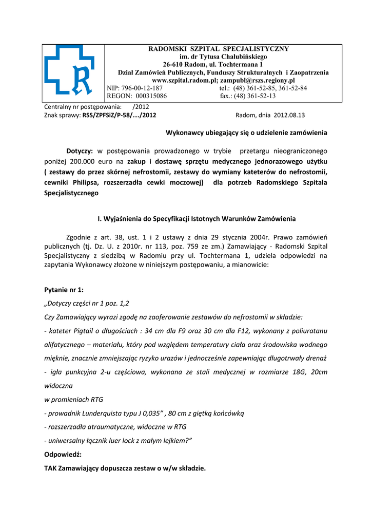 RADOMSKI SZPITAL SPECJALISTYCZNY im. dr Tytusa Chałubińskiego 26-610 Radom, ul. Tochtermana 1 Dział Zamówień Publicznych, Funduszy Strukturalnych i Zaopatrzenia www.szpital.radom.pl; [email protected] NIP: 796-00-12-187 tel.: (48) 361-52-85, 361-52-84 REGON: 000315086 fax.: (48) 361-52-13 Centralny nr postępowania: /2012 Znak sprawy: RSS/ZPFSiZ/P-58/…./2012 Radom, dnia 2012.08.13 Wykonawcy ubiegający się o udzielenie zamówienia Dotyczy: w postępowania prowadzonego w poniżej 200.000 euro na zakup i dostawę sprzętu ( zestawy do przez skórnej nefrostomii, zestawy do cewniki Philipsa, rozszerzadła cewki moczowej) Specjalistycznego trybie przetargu nieograniczonego medycznego jednorazowego użytku wymiany kateterów do nefrostomii, dla potrzeb Radomskiego Szpitala I. Wyjaśnienia do Specyfikacji Istotnych Warunków Zamówienia Zgodnie z art. 38, ust. 1 i 2 ustawy z dnia 29 stycznia 2004r. Prawo zamówień publicznych (tj. Dz. U. z 2010r. nr 113, poz. 759 ze zm.) Zamawiający - Radomski Szpital Specjalistyczny z siedzibą w Radomiu przy ul. Tochtermana 1, udziela odpowiedzi na zapytania Wykonawcy złożone w niniejszym postępowaniu, a mianowicie: Pytanie nr 1: „Dotyczy części nr 1 poz. 1,2 Czy Zamawiający wyrazi zgodę na zaoferowanie zestawów do nefrostomii w składzie: - kateter Pigtail o długościach : 34 cm dla F9 oraz 30 cm dla F12, wykonany z poliuratanu alifatycznego – materiału, który pod względem temperatury ciała oraz środowiska wodnego mięknie, znacznie zmniejszając ryzyko urazów i jednocześnie zapewniając długotrwały drenaż - igła punkcyjna 2-u częściowa, wykonana ze stali medycznej w rozmiarze 18G, 20cm widoczna w promieniach RTG - prowadnik Lunderquista typu J 0,035” , 80 cm z giętką końcówką - rozszerzadła atraumatyczne, widoczne w RTG - uniwersalny łącznik luer lock z małym lejkiem?” Odpowiedź: TAK Zamawiający dopuszcza zestaw o w/w składzie. Pytanie nr 2: „ Dotyczy części nr 2 poz. 1,2 Czy Zamawiający wyrazi zgodę na zaoferowanie zestawów do nefrostomii w składzie: - kateter Pigtail o długościach : 34 cm dla F9 oraz 30 cm dla F12, wykonany z poliuratanu alifatycznego – materiału, który pod względem temperatury ciała oraz środowiska wodnego mięknie, znacznie zmniejszając ryzyko urazów i jednocześnie zapewniając długotrwały drenaż - prowadnik Lunderquista 0,035” , 80 cm prostą, giętką końcówką - rozszerzadła atraumatyczne, widoczne w RTG - uniwersalny łącznik luer lock z małym lejkiem?” Odpowiedź: TAK Zamawiający dopuszcza zestaw o w/w składzie. Zamawiający na podstawie art. 38 ust. 4 ustawy Prawo zamówień publicznych zmienia treść SIWZ ( w załączeniu): - poprawiony opis przedmiotu zamówienia - poprawione formularze cenowe dla części nr 1,2 które są obowiązujące Tadeusz Kalbarczyk ………………………………………………………………………………………….. Dyrektor Radomskiego Szpitala Specjalistycznego Sporządziła: Magda Dusińska PO ZMIANACH Z DNIA 2012.08.13 OPIS PRZEDMIOTU ZAMÓWIENIA Przedmiotem zamówienia jest zakup i dostawa sprzętu medycznego jednorazowego użytku ( zestawy do przez skórnej nefrotomii, zestawy do wymiany kateterów do nefrotomii, cewniki Philipsa, rozszerzadła cewki moczowej) dla potrzeb Radomskiego Szpitala Specjalistycznego Część nr 1- Zestawy do przez skórnej nefrostomii Lp. Nazwa towaru 1 Orientacyjna Ilość zestawów Zestaw do przez skórnej nefrostomii: a) nietoksyczny, sterylny b) zestaw powinien zawierać: - kateter Pigitail długość 45 cm (+/- 2 cm), cewnik wykonany z poliuretanu silikonowego - prowadnik J długość 80 cm ( +/- 2 cm) - igłę dwuczęściową 18G x 20 cm - rozszerzacz z koszulką rozrywalną - rozszerzacz - strzykawkę 10ml Luer – Lock - skalpel - kołnierz mocujący - opaskę zaciskową LUB Zestaw w składzie : - kateter Pigtail o długości : 34 cm dla F 9 oraz 30 cm dla F 12, wykonany z poliuratanu alifatycznego – materiału, który pod względem temperatury ciała oraz środowiska wodnego mięknie, znacznie zmniejszając ryzyko urazów i jednocześnie zapewniając długotrwały drenaż - igła punkcyjna 2-u częściowa, wykonana ze stali medycznej w rozmiarze 18G, 20cm widoczna w promieniach RTG - prowadnik Lunderquista typu J 0,035” , 80 cm z giętką końcówką - rozszerzadła atraumatyczne, widoczne w RTG - uniwersalny łącznik luer lock z małym lejkiem Rozmiar F 9 450 Rozmiar F 12 250 Część nr 2- Zestawy do wymiany kateterów do nefrostomii Lp. Nazwa towaru Orientacyjna Ilość zestawów 1 Zestaw do wymiany kateterów a) nietoksyczny, sterylny b) zestaw powinien zawierać: - kateter Pigitail długość 45 cm ( +/- 2 cm), wykonany z poliuretanu silikonowego - prowadnik długość 80 cm ( +/- 2 cm) - rozszerzacz z koszulką rozrywalną - rozszerzacz - kołnierz mocujący - opaskę zaciskową LUB Zestaw w składzie : - kateter Pigtail o długości : 34 cm dla F 9 oraz 30 cm dla F 12, wykonany z poliuratanu alifatycznego – materiału, który pod względem temperatury ciała oraz środowiska wodnego mięknie, znacznie zmniejszając ryzyko urazów i jednocześnie zapewniając długotrwały drenaż - prowadnik Lunderquista 0,035” , 80 cm prostą, giętką końcówką - rozszerzadła atraumatyczne, widoczne w RTG - uniwersalny łącznik luer lock z małym lejkiem Rozmiar F 9 Rozmiar F 12 340 200 Część nr 3 – Cewniki Philipsa Lp. 1 Nazwa towaru Cewnik Philips z jednym oczkiem z gwintem: - długość 40 cm ( +/- 3 cm) - średnica 8-24 CH - jednorazowego użytku Orientacyjna Ilość szt. 140 Część nr 4 - Rozszerzadła cewki moczowej Lp. Nazwa towaru 1 Rozszerzadło cewki moczowej nitkowate, wzmocnione z gwintem: - długość 30 cm ( +/- 3 cm) - średnica 2-6 CH - jednorazowego użytku Orientacyjna Ilość szt. 80 Załącznik Nr 1 do SIWZ (pieczęć Wykonawcy/Wykonawców) FORMULARZ CENOWY Część nr 1 – Zestawy do przez skórnej nefrostomii 1. Oferujemy