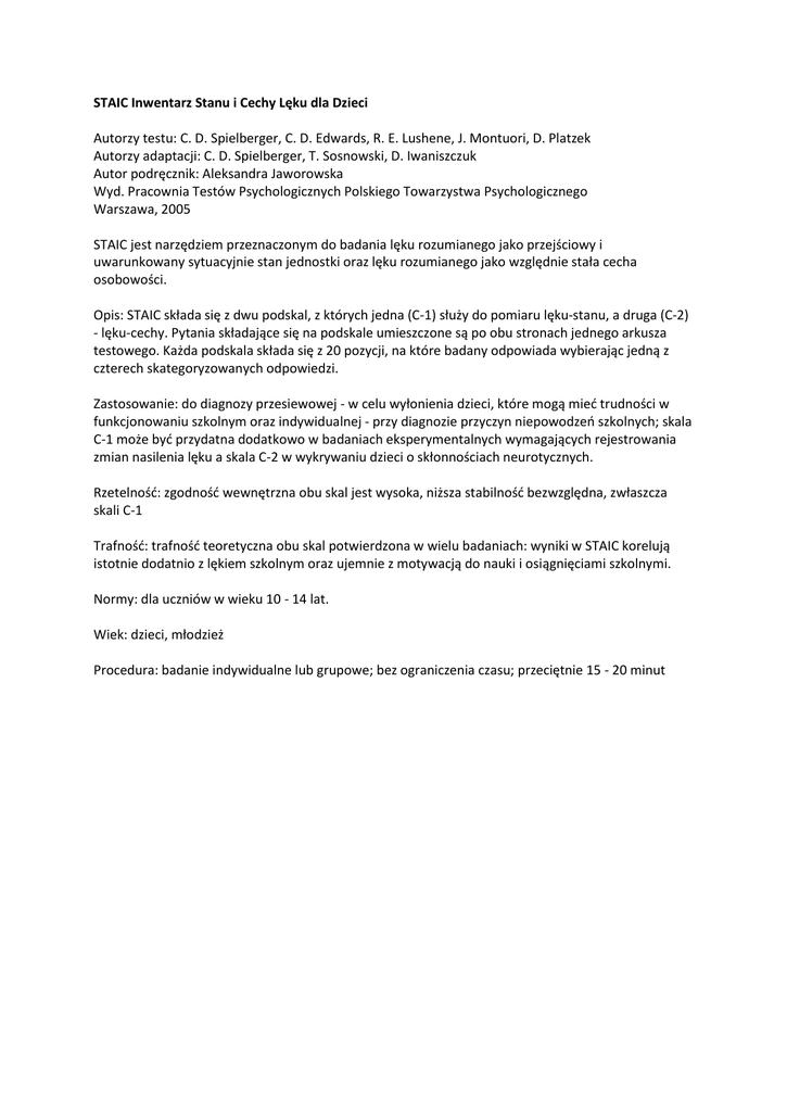STAIC Inwentarz Stanu i Cechy Lęku dla Dzieci Autorzy testu: C. D. Spielberger, C. D. Edwards, R. E. Lushene, J. Montuori, D. Platzek Autorzy adaptacji: C. D. Spielberger, T. Sosnowski, D. Iwaniszczuk Autor podręcznik: Aleksandra Jaworowska Wyd. Pracownia Testów Psychologicznych Polskiego Towarzystwa Psychologicznego Warszawa, 2005 STAIC jest narzędziem przeznaczonym do badania lęku rozumianego jako przejściowy i uwarunkowany sytuacyjnie stan jednostki oraz lęku rozumianego jako względnie stała cecha osobowości. Opis: STAIC składa się z dwu podskal, z których jedna (C-1) służy do pomiaru lęku-stanu, a druga (C-2) - lęku-cechy. Pytania składające się na podskale umieszczone są po obu stronach jednego arkusza testowego. Każda podskala składa się z 20 pozycji, na które badany odpowiada wybierając jedną z czterech skategoryzowanych odpowiedzi. Zastosowanie: do diagnozy przesiewowej - w celu wyłonienia dzieci, które mogą mieć trudności w funkcjonowaniu szkolnym oraz indywidualnej - przy diagnozie przyczyn niepowodzeń szkolnych; skala C-1 może być przydatna dodatkowo w badaniach eksperymentalnych wymagających rejestrowania zmian nasilenia lęku a skala C-2 w wykrywaniu dzieci o skłonnościach neurotycznych. Rzetelność: zgodność wewnętrzna obu skal jest wysoka, niższa stabilność bezwzględna, zwłaszcza skali C-1 Trafność: trafność teoretyczna obu skal potwierdzona w wielu badaniach: wyniki w STAIC korelują istotnie dodatnio z lękiem szkolnym oraz ujemnie z motywacją do nauki i osiągnięciami szkolnymi. Normy: dla uczniów w wieku 10 - 14 lat. Wiek: dzieci, młodzież Procedura: badanie indywidualne lub grupowe; bez ograniczenia czasu; przeciętnie 15 - 20 minut